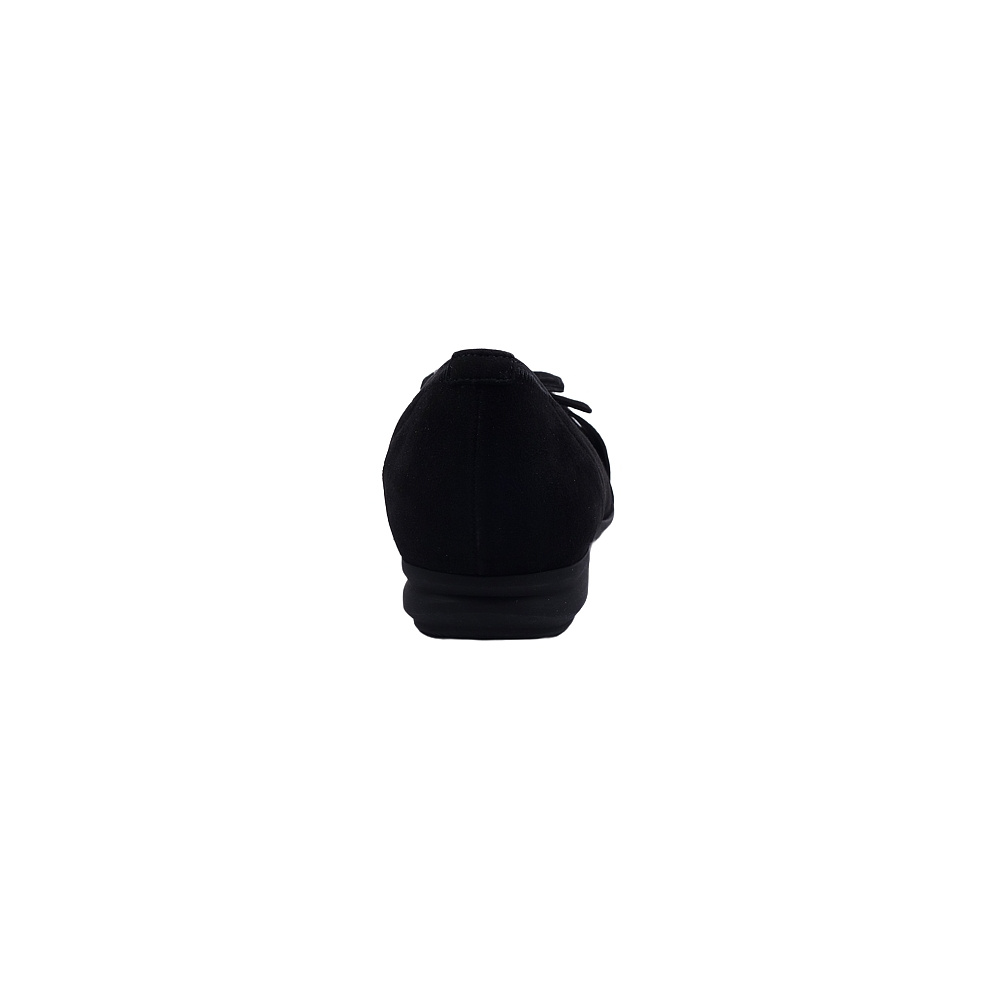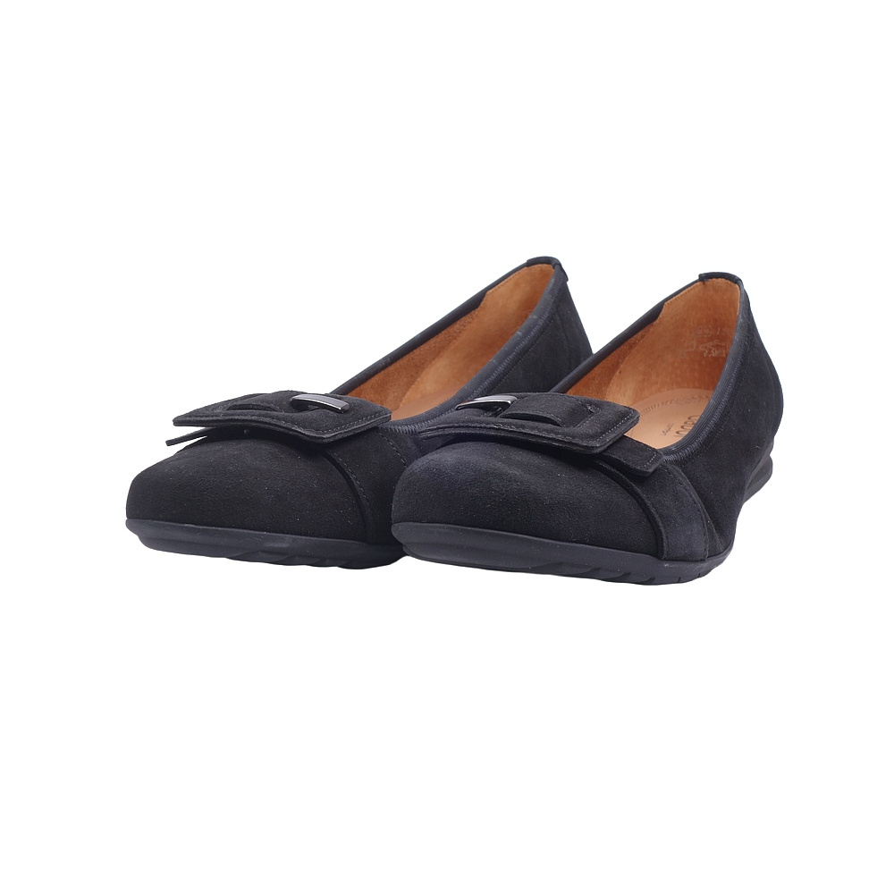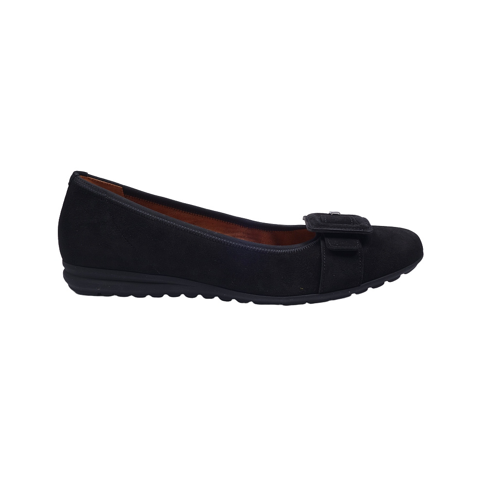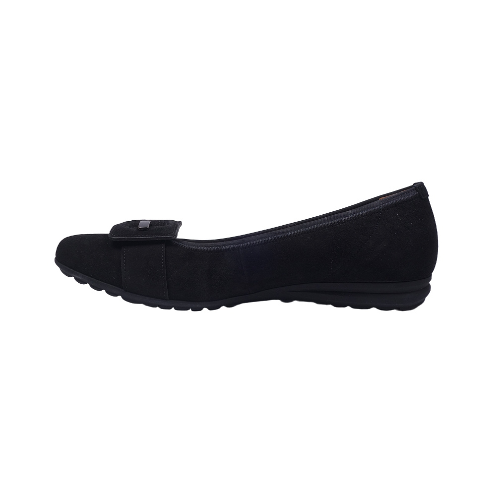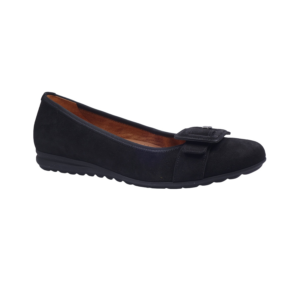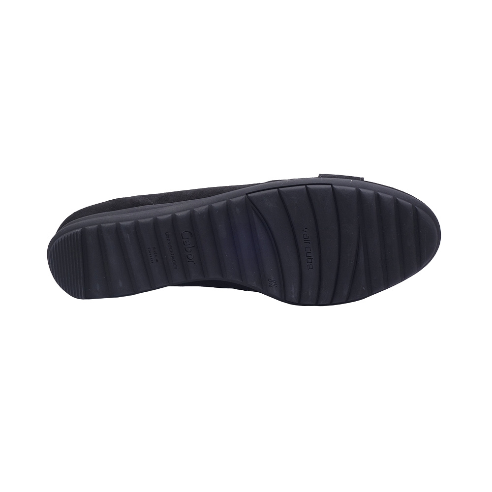 Dámské vycházkové baleríny značky Gabor. Svršek je z broušené kůže (velur), podšívka kombinací kůže a textilu, stélka kožená, podešev syntetická (AIR CUBE). Barva je černá (schwarz). Šíře je G. Po obvodu svršku je pružný lem pro snažší obutí a větší komfort. Obuv je na nártu ozdobena koženým páskem a sponou. Obuv je vhodná na nošení do města a v upraveném přírodním prostředí (parky, lesní a polní cesty apod.).