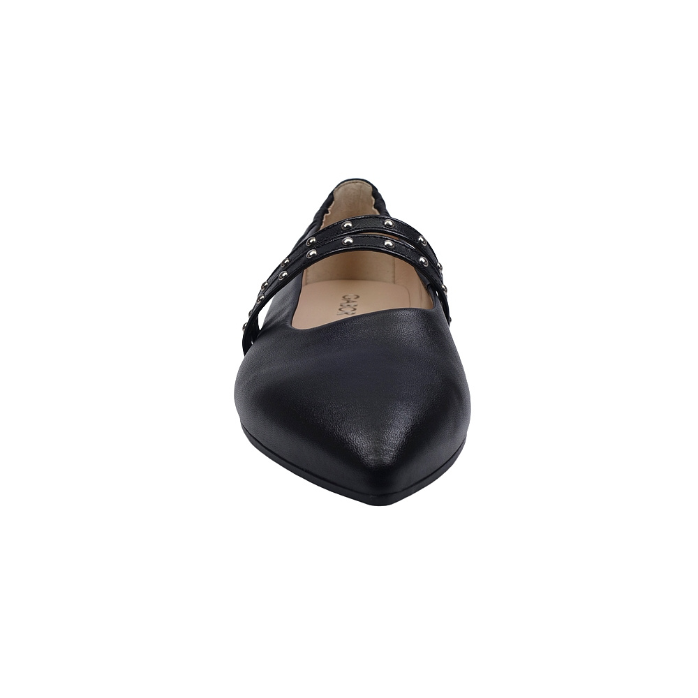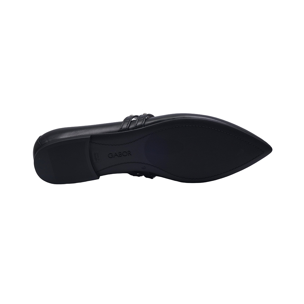 Dámské vycházkové baleríny značky Gabor. Svršek je z hladké kůže, podšívka a stélka kožená, podešev syntetická (hladká s jemným desénem). Barva je černá (schwarz). Výška podpatku je 5 mm. V patní části svršku je pružný lem pro snažší obutí a větší komfort. Pásky přes nárt jsou upevněny na gumičkách, pro snažší nazutí a větší pohodlí. Obuv je vhodná na nošení do města i do společnosti.