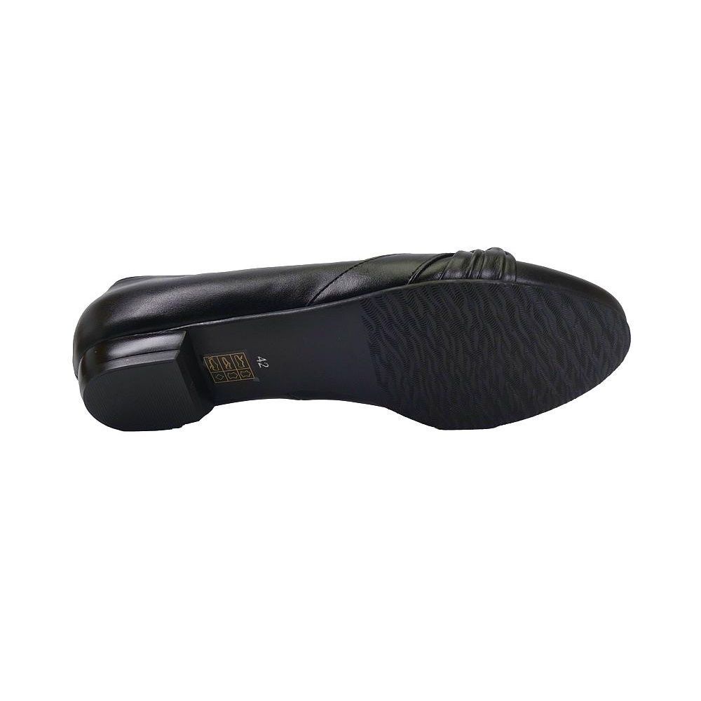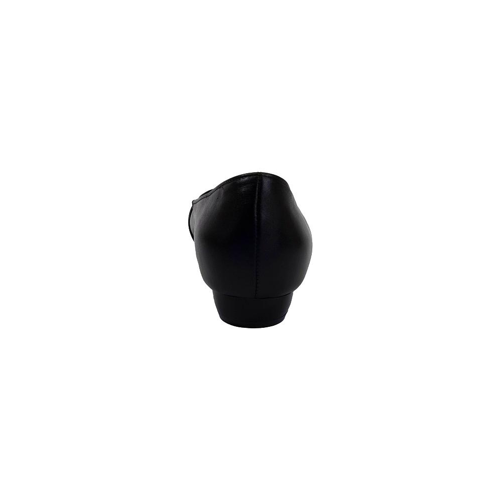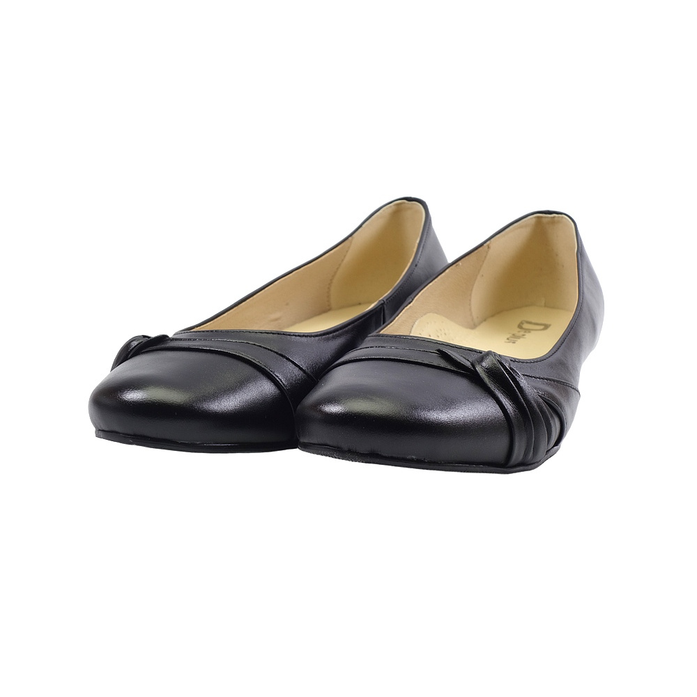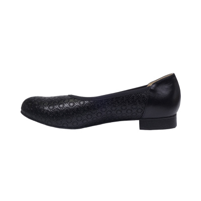 Dámské vycházkové baleríny značky De-Plus. Svršek je z hladké kůže, podšívka kombinací kůže a syntetiky, stélka kožená (stélka je vybavena tlumícím polštářkem v místě prstních kloubů pro větší komfort), podešev syntetická (hladká s jemným dezénem). Barva je černá. Šíře je G 1/2. Výška podpatku je 15 mm. Obuv je ozdobena koženou mašlí. Obuv je vhodná na nošení do města a v upraveném přírodním prostředí (parky, lesní a polní cesty apod.) i do společnosti.
