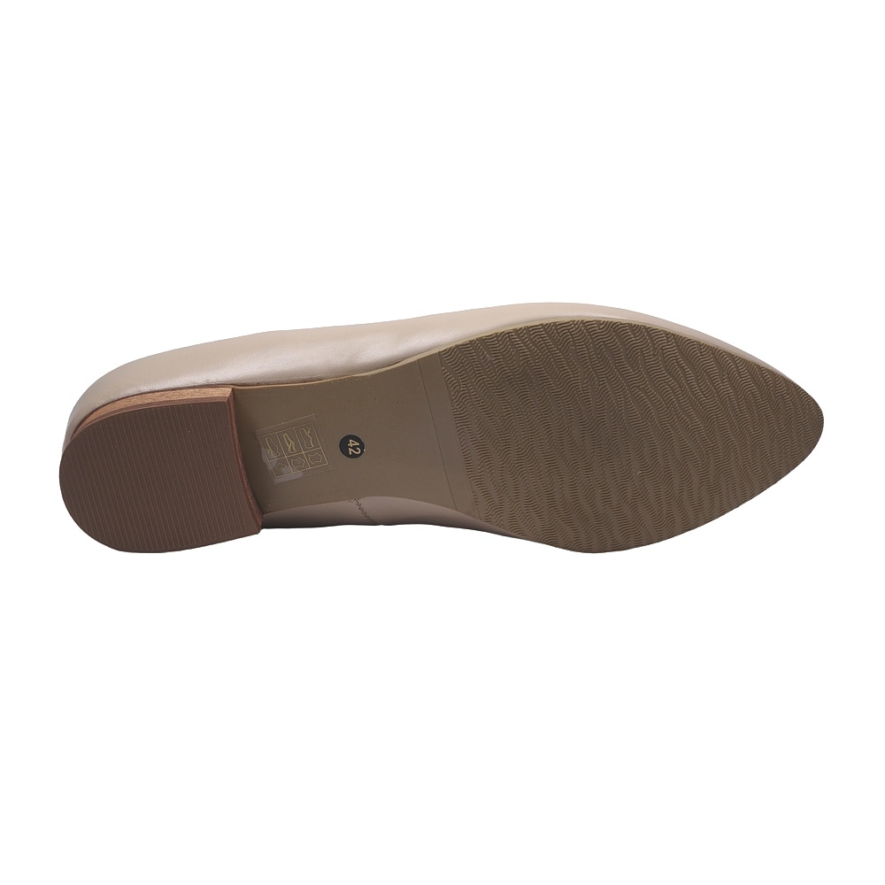 Dámské vycházkové baleríny značky De-Plus. Svršek je z hladké kůže, podšívka syntetická, stélka kožená (stélka je vybavena tlumícím polštářkem v místě prstních kloubů pro větší komfort), podešev syntetická (hladká s jemným dezénem). Barva je béžová. Šíře je G. Výška podpatku je 20 mm. Obuv je vhodná na nošení do města i do společnosti.