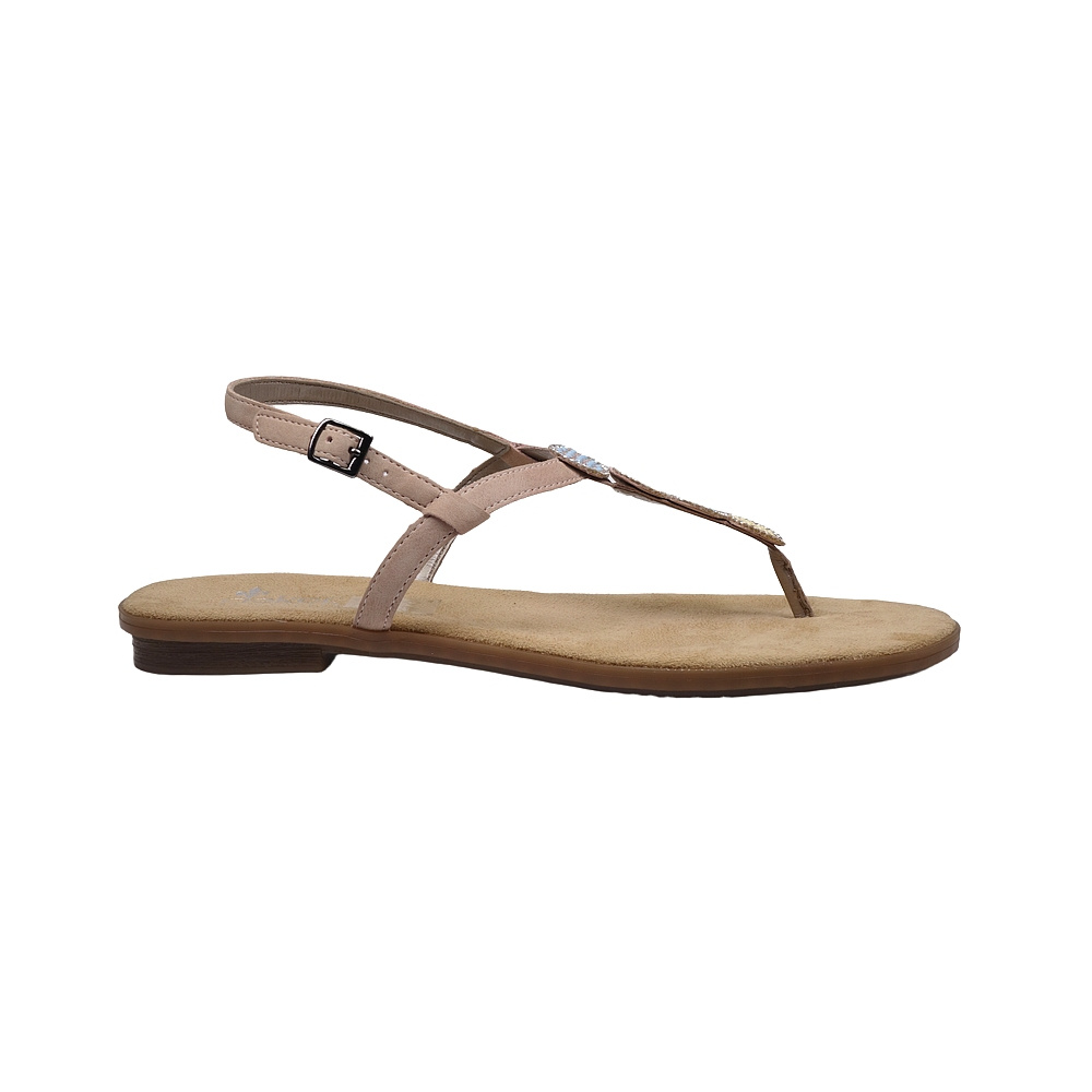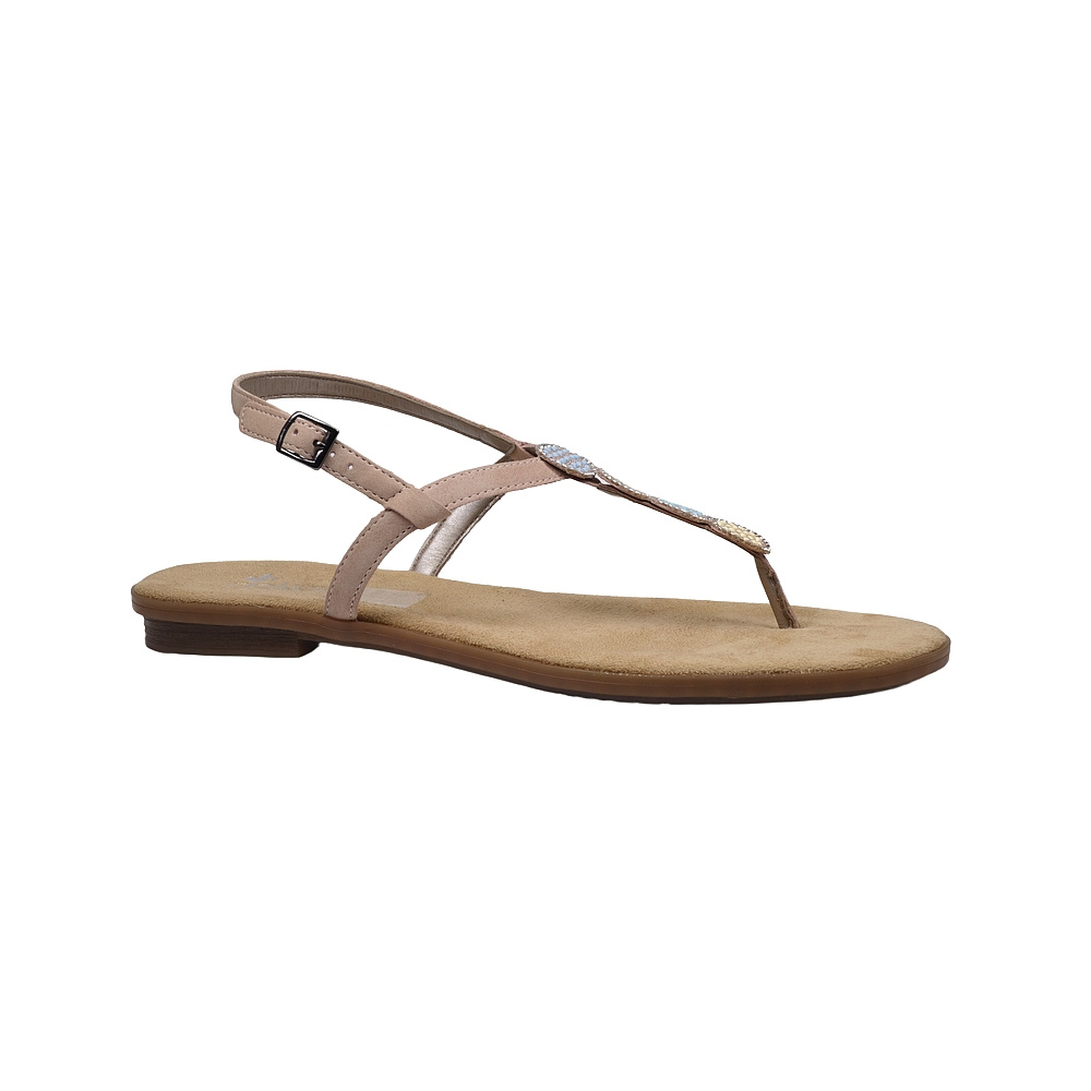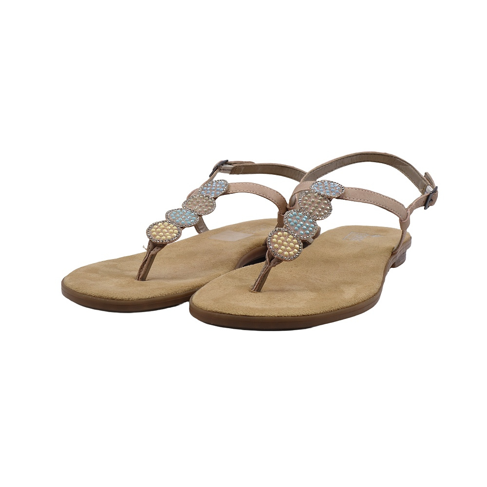 Dámské letní vycházkové sandály značky Rieker. Svršek a podšívka jsou ze syntetiky, stélka textilní (stélka je vyměkčená pro větší pohodlí), podešev syntetická (non-marking). Barva je rosa (růžovobéžová). Přední část svršku je upevněná mezi palec a ukazováček (stejně jako u žabek). Zapínání pásku na patě je klasické (na sponu). Obuv je ozdobena terčíky s umělými kamínky. Obuv je vhodná na nošení do města.