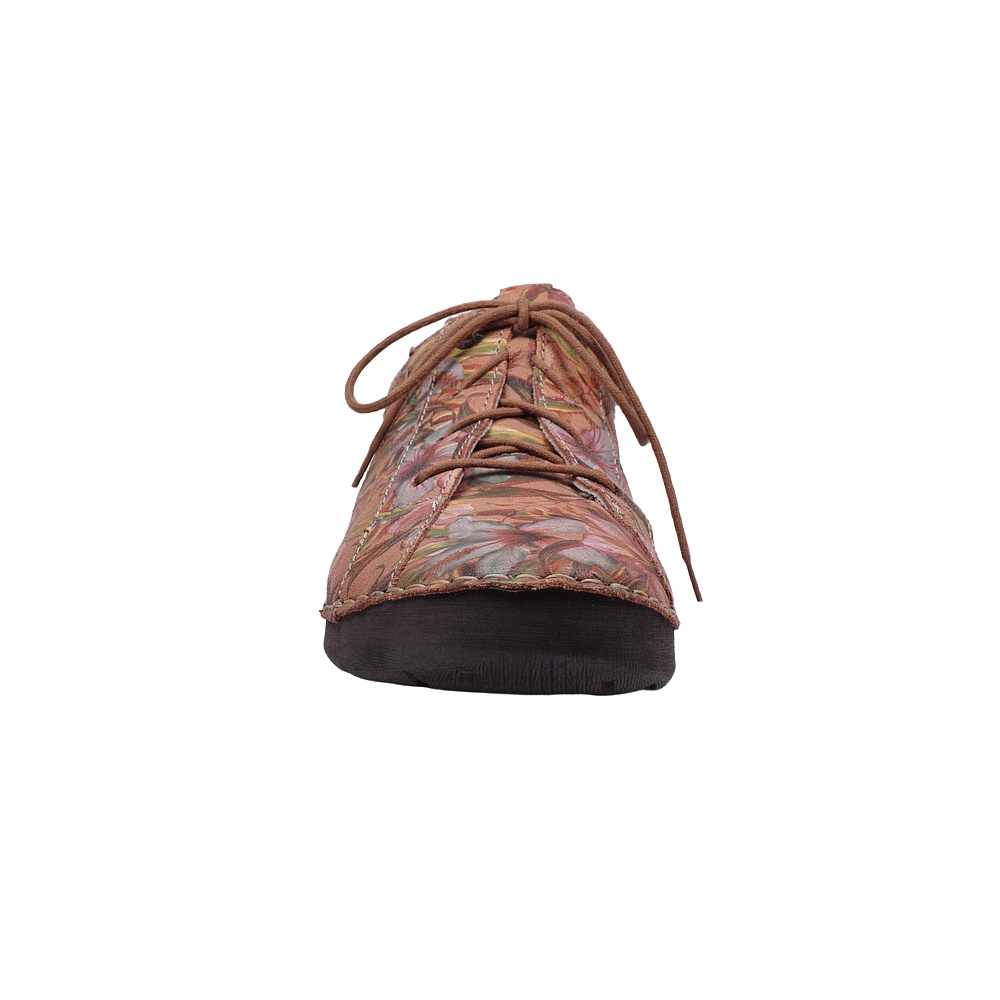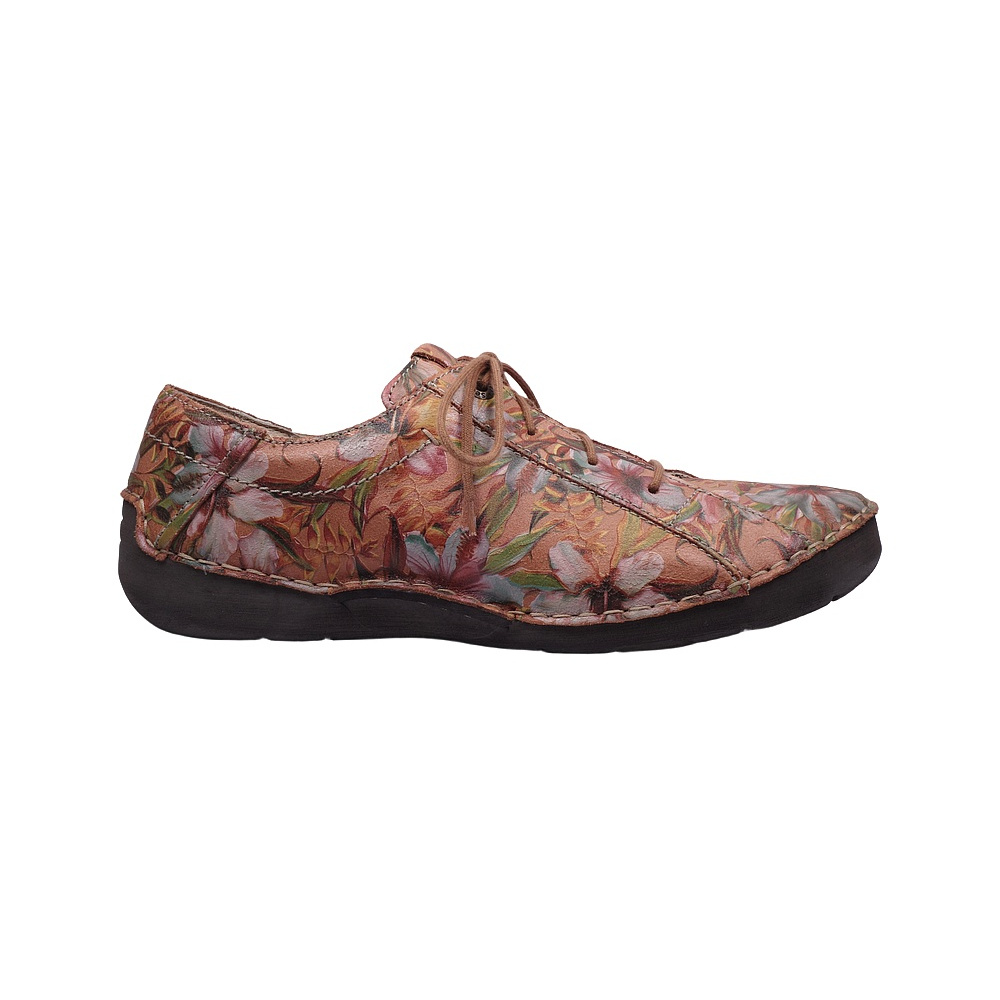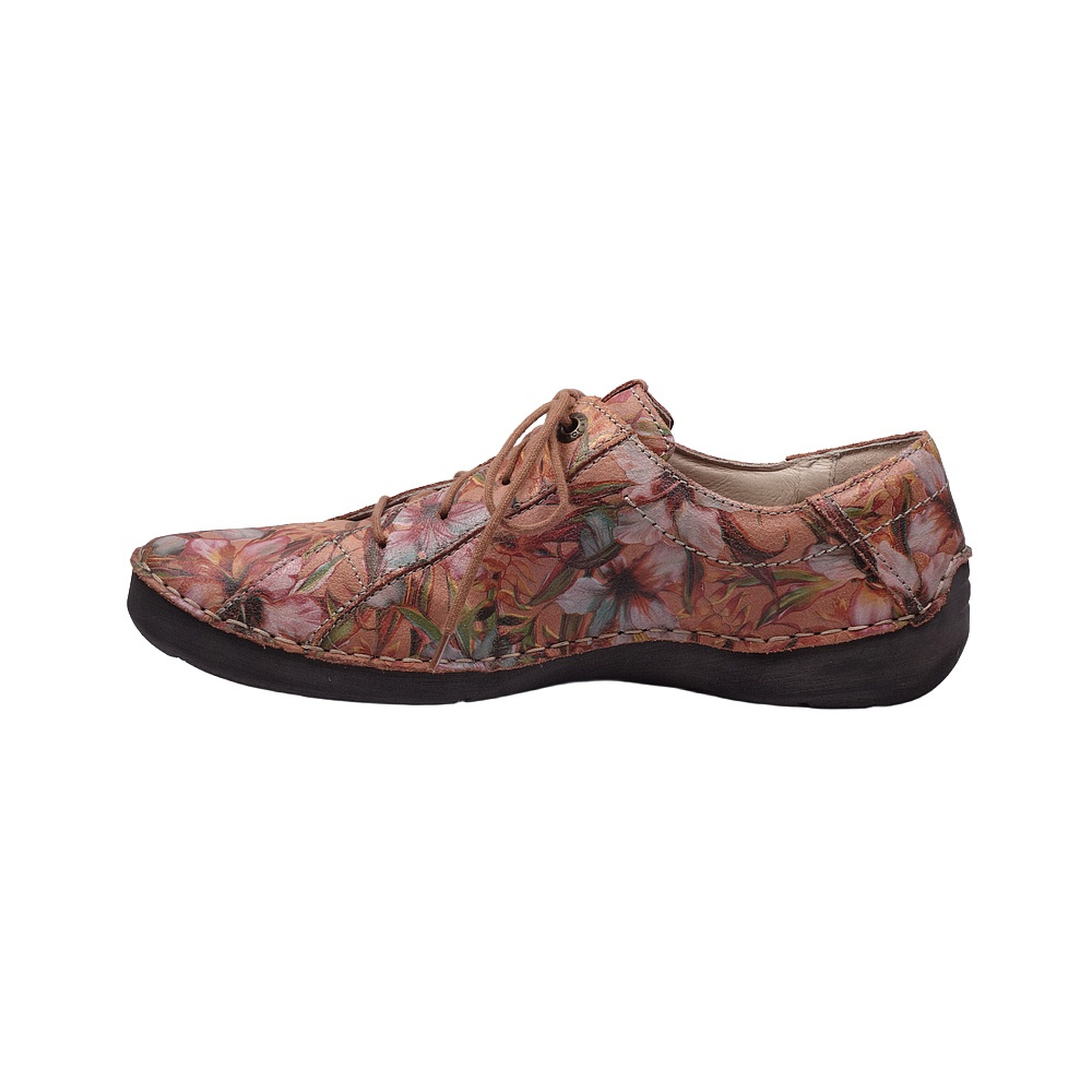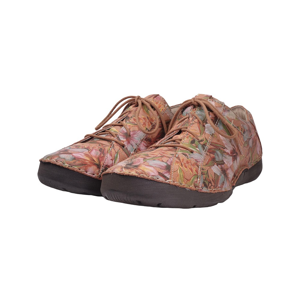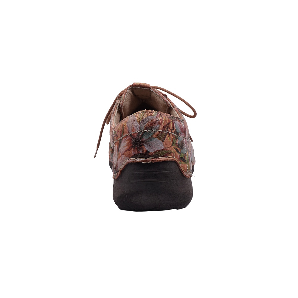 Dámská vycházková obuv značky Josef Seibel. Svršek je z kůže s barevným potiskem a úpravou cracked (kůže vypadá jako popraskaná), podšívka kombinací kůže a textilu, stélka kožená, podešev syntetická. Stélka je vyjmutelná, odpružená a anatomicky tvarovaná. Barva je kombi (červenooranžový podklad + barevné květy). Obuv je flexiblová (svršek a podešev jsou spojeny šitím). Obuv je vhodná na nošení do města a v upraveném přírodním prostředí (parky, lesní a polní cesty apod).