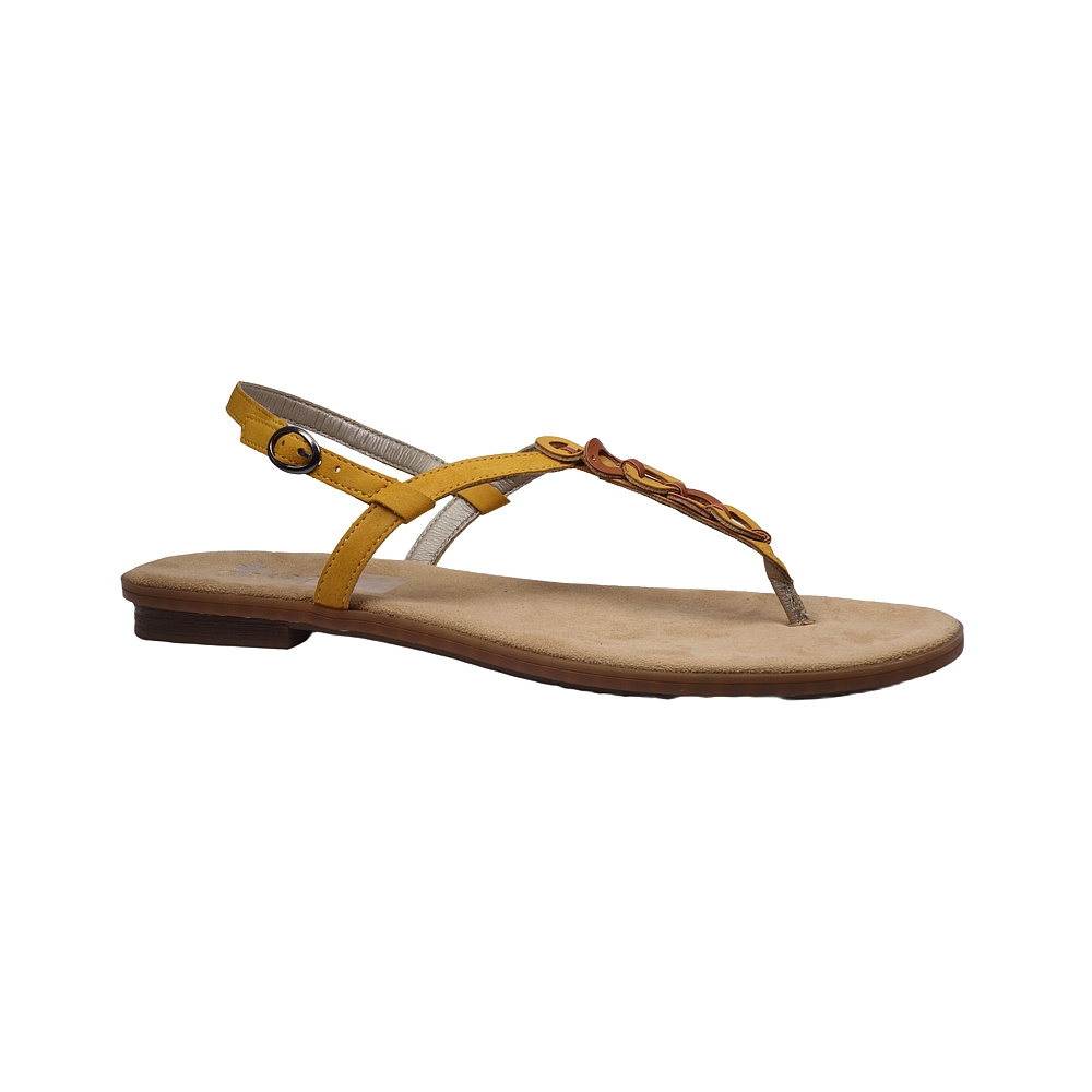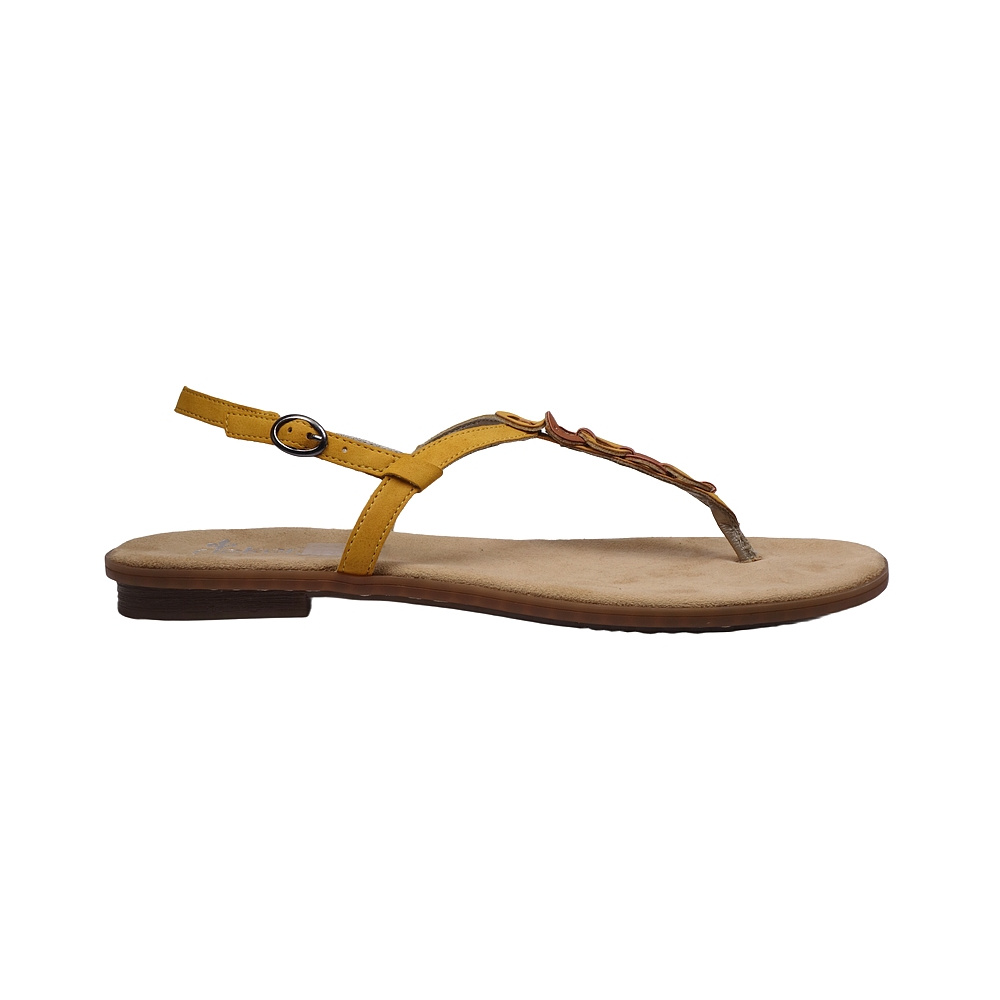 Dámské letní vycházkové sandály značky Rieker. Svršek, podšívka i stélka jsou ze syntetiky (stélka je vyměkčená pro větší pohodlí), podešev syntetická (non-marking). Barva je žlutá (gelb). Přední část svršku je upevněná mezi palec a ukazováček (stejně jako u žabek). Zapínání pásku na patě je klasické (na sponu). Obuv je vhodná na nošení do města.