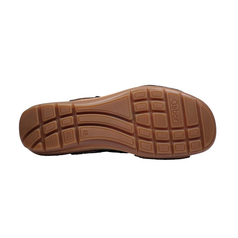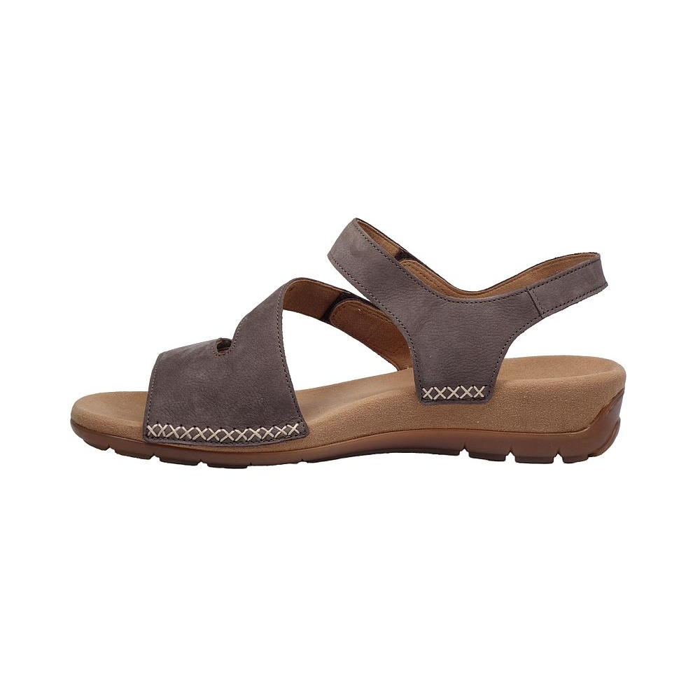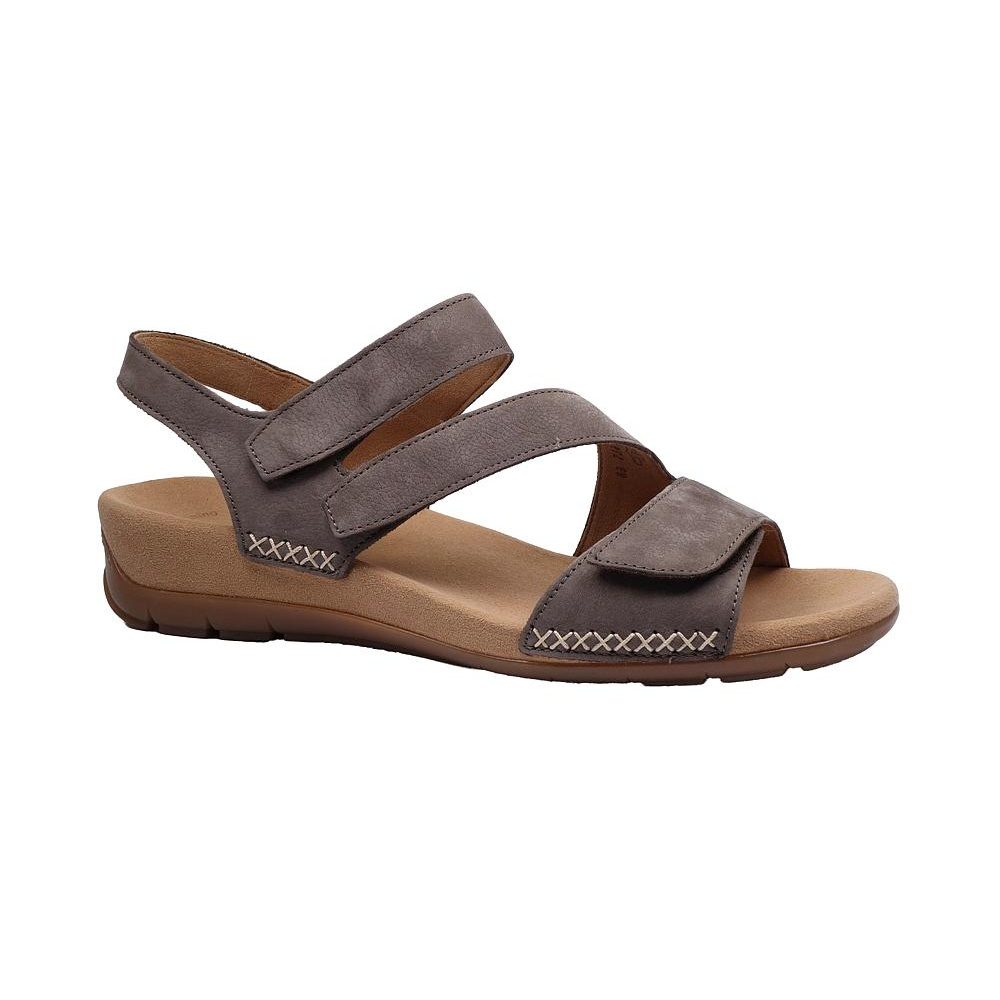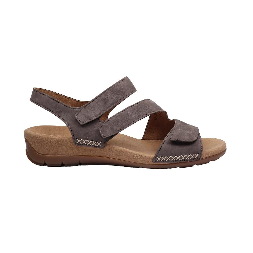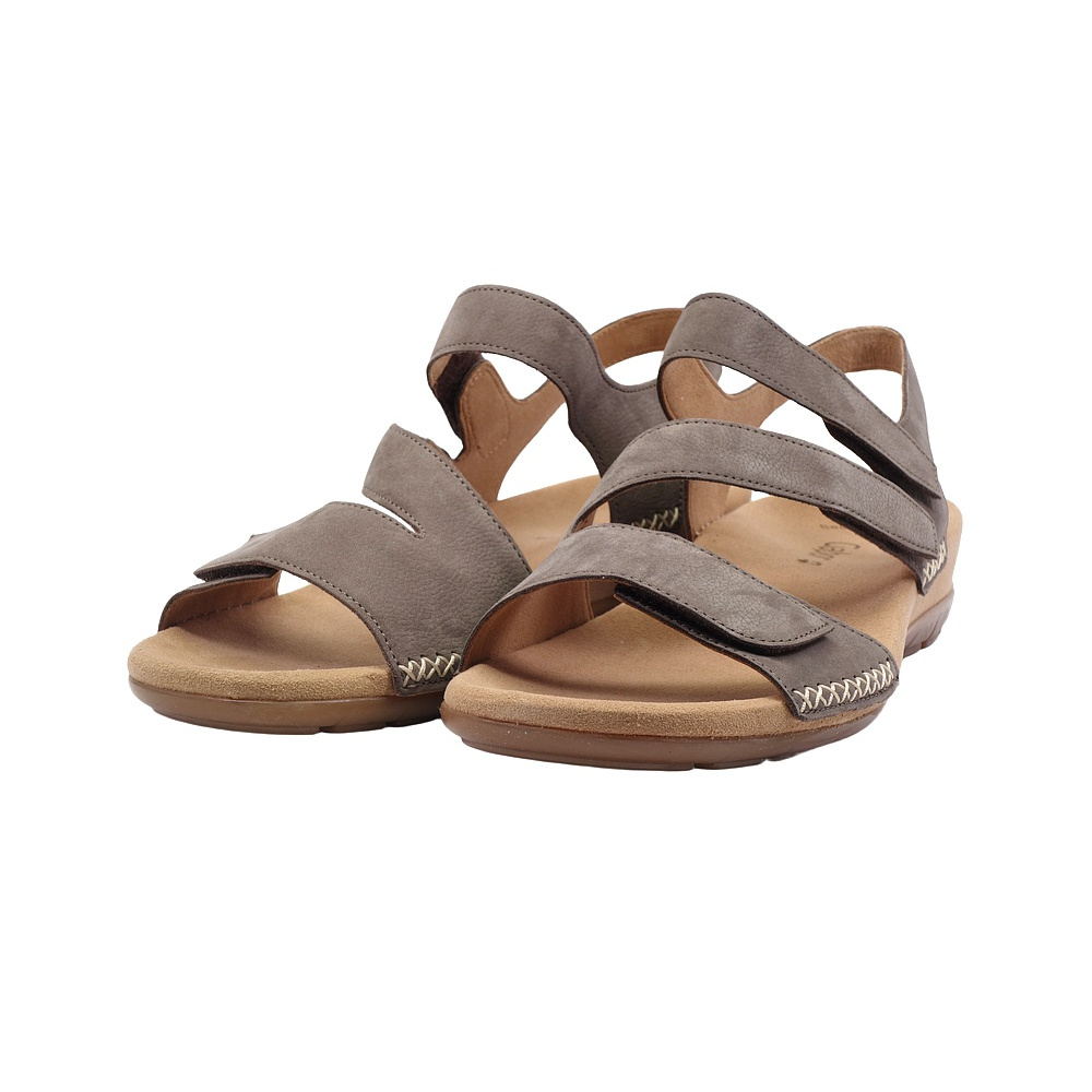 Dámské letní vycházkové sandály značky Gabor. Svršek je z broušené kůže (nubuk), podšívka a stélka textilní, podešev syntetická (non-marking). Barva je šedá (wallaby). Výška klínku je 20 mm (+15 mm podešev). Pásky přes nárt a prsty mají zapínání na suché zipy. Obuv je vhodná na nošení do města a v upraveném přírodním prostředí (parky, lesní a polní cesty apod.).