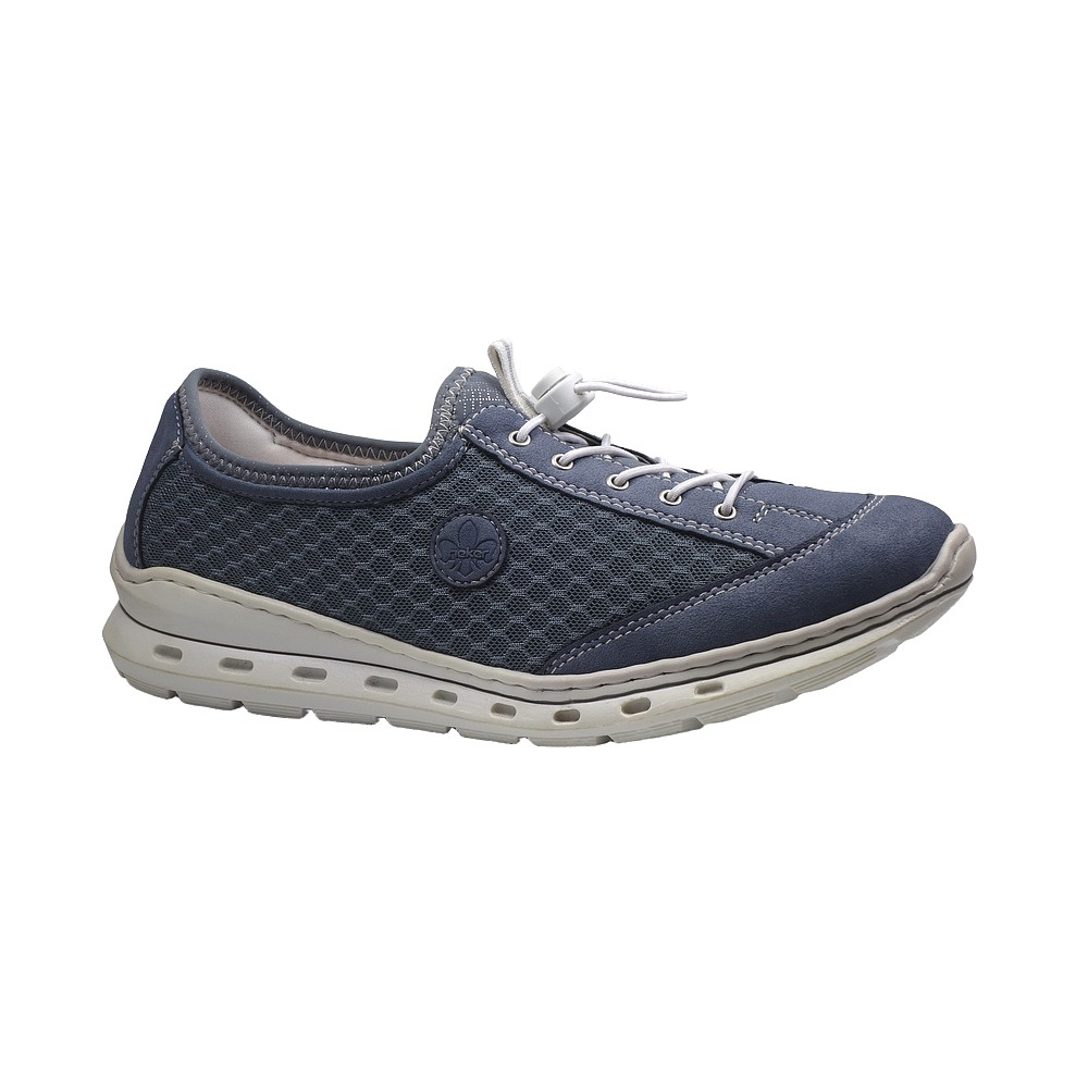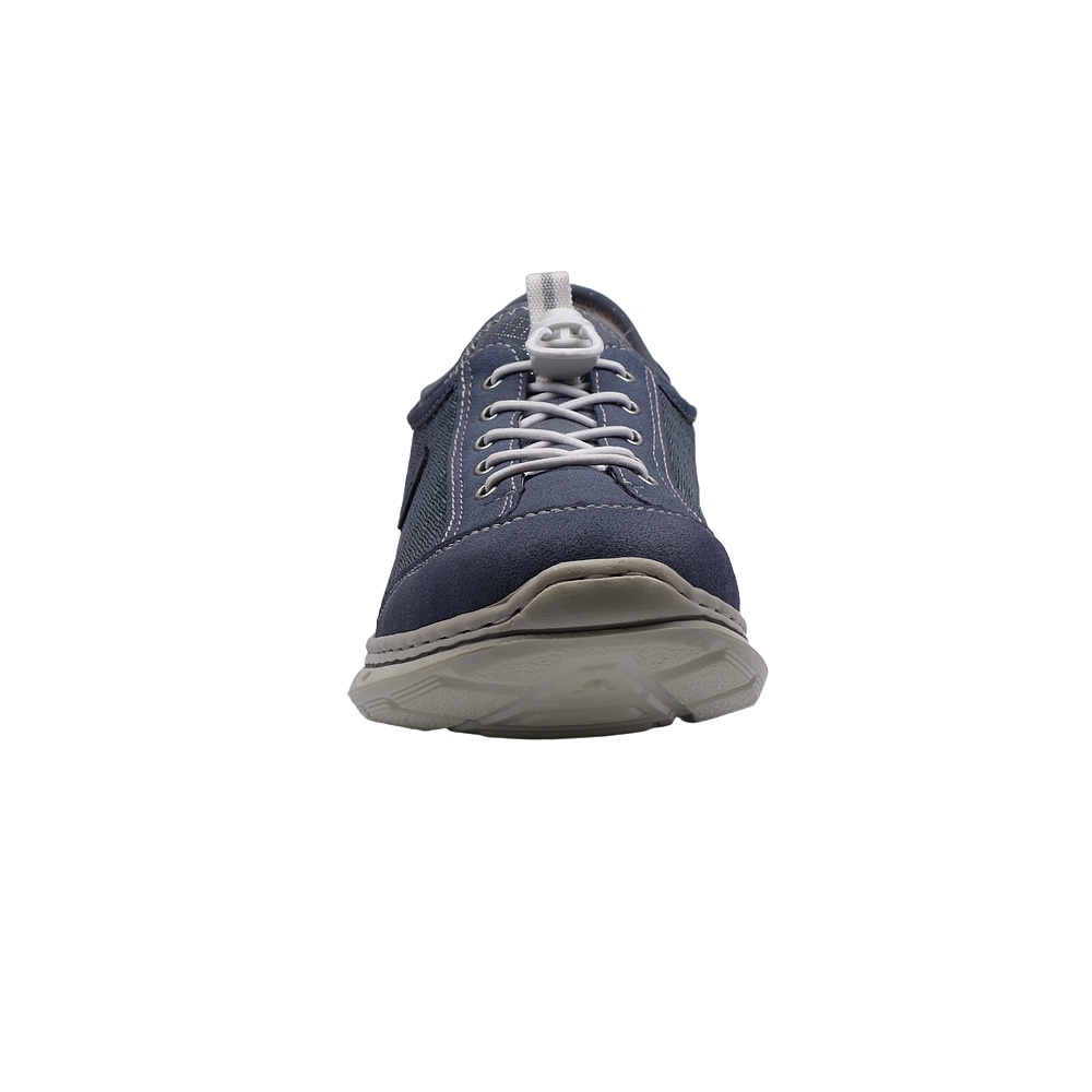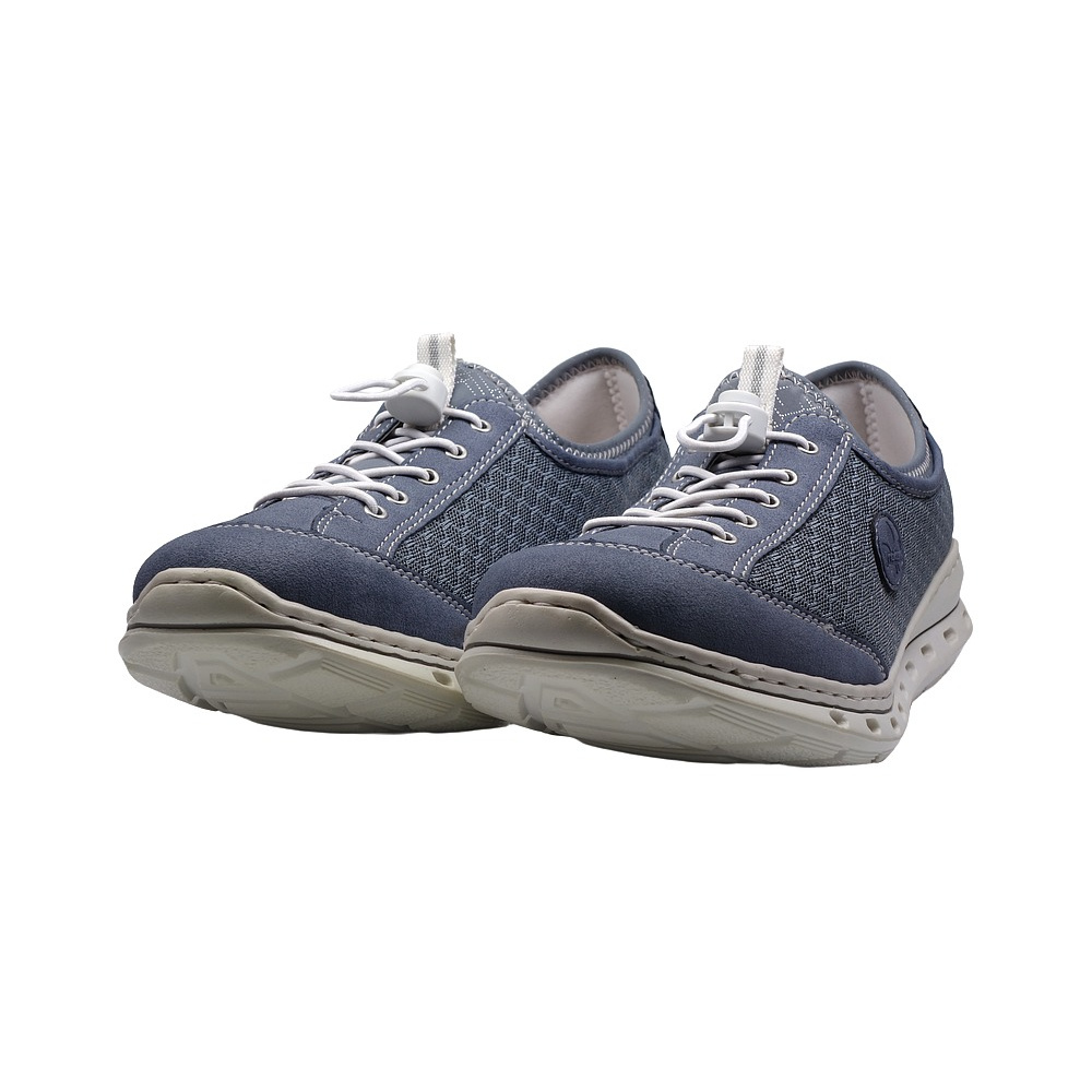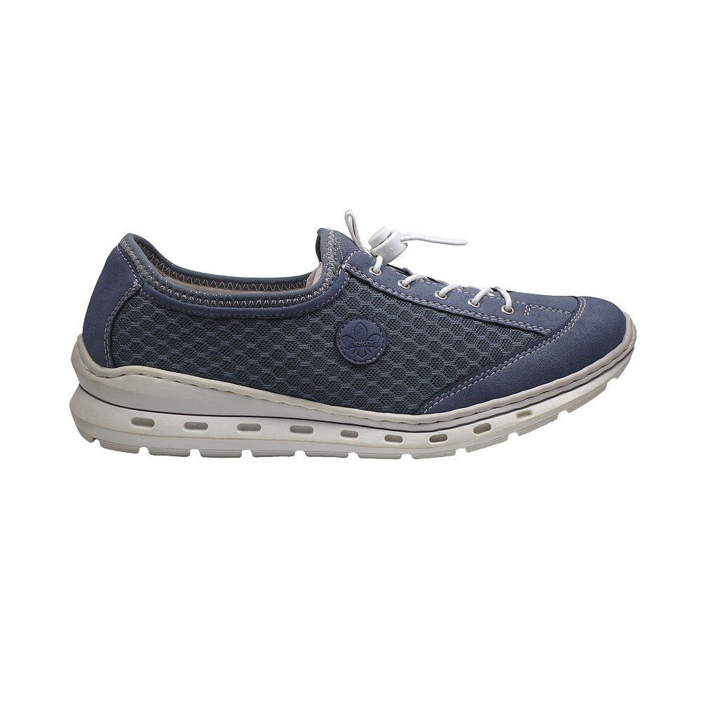 Dámská vycházková obuv značky Rieker. Svršek je kombinací syntetiky (vzhledově podobná broušené kůži - nubuku), syntetické textilie a high tech materiálu (stretch na jazyku a vrchním lemu svršku pro větší pohodlí), podšívka textilní (vyměkčená pro větší komfort), stélka textilní (vybavená paměťovou pěnou), podešev syntetická. Barva je modrá (blau). Šněrování na nártu je pružné s rychlozapínacím systémem. Obuv je flexiblová (svršek a podešev jsou spojeny šitím). Obuv je vhodná na nošení do města a v upraveném přírodním prostředí (parky, lesní a polní cesty apod.).