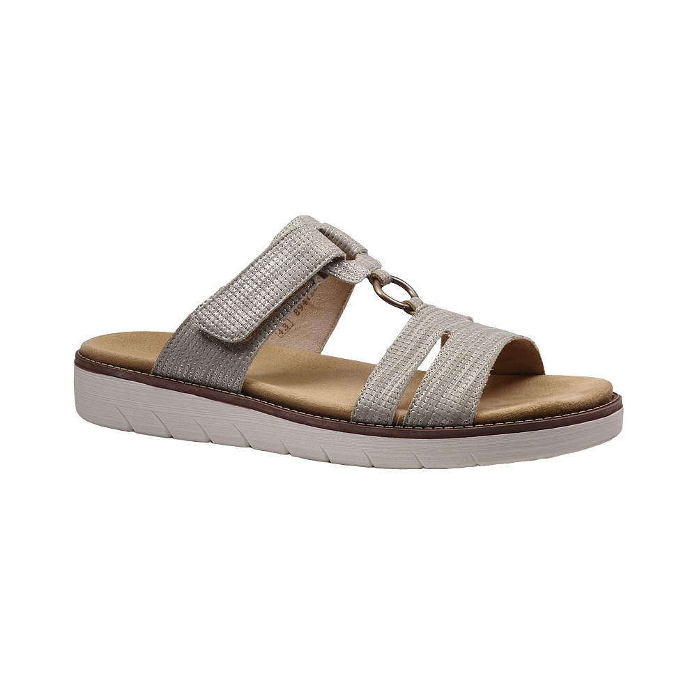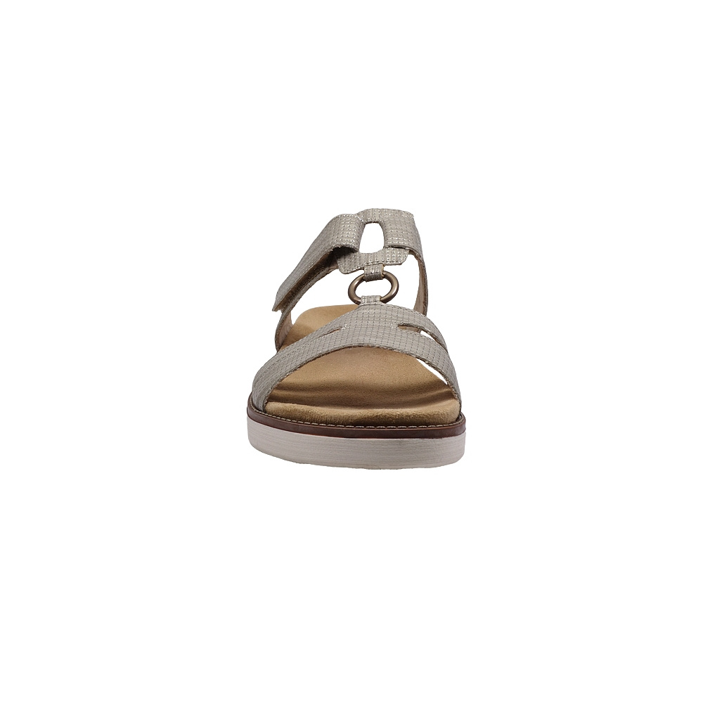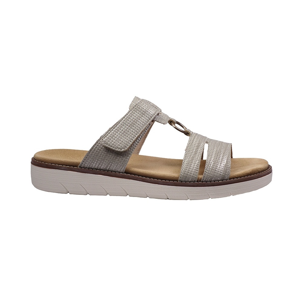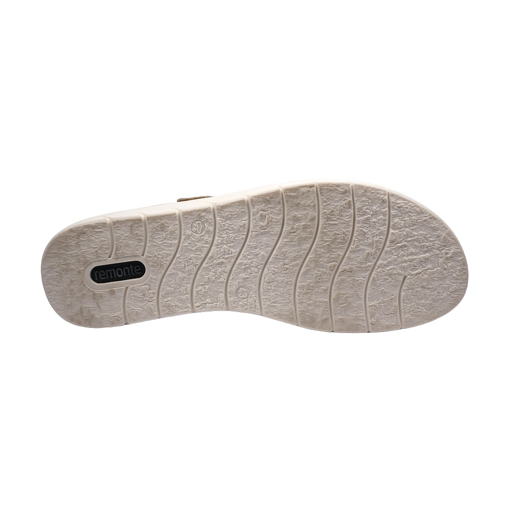 Dámské letní vycházkové pantofle značky Remonte. Obuv je celá ze syntetiky. Stélka je vyjmutelná, odpružená a anatomicky tvarovaná (v obuvi je uchycena pomocí suchých zipů). Barva je šedobéžová (beige). Pásek přes nárt má zapínání na suchý zip. Obuv je vhodná na nošení do města a v upraveném přírodním prostředí (parky, lesní a polní cesty apod.).