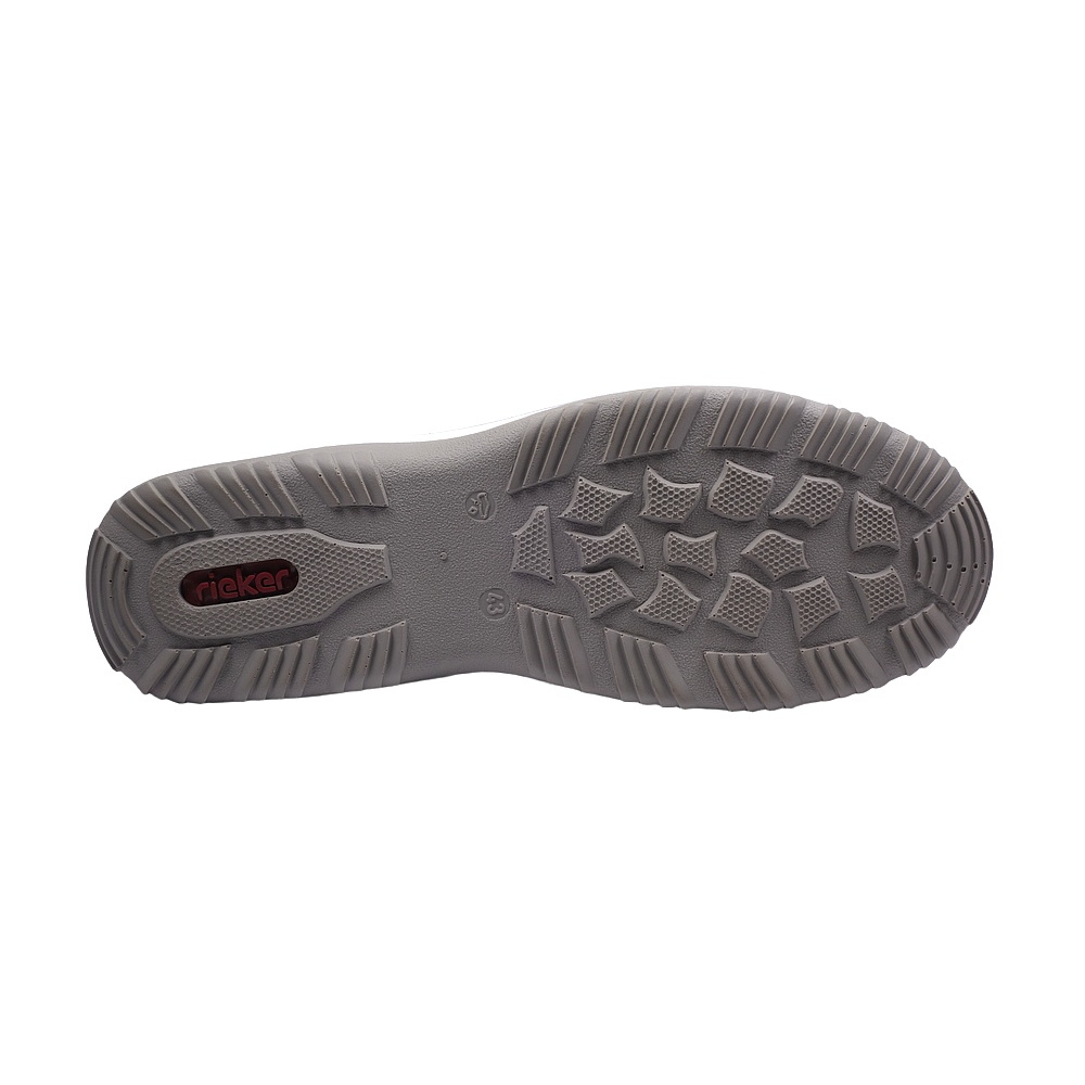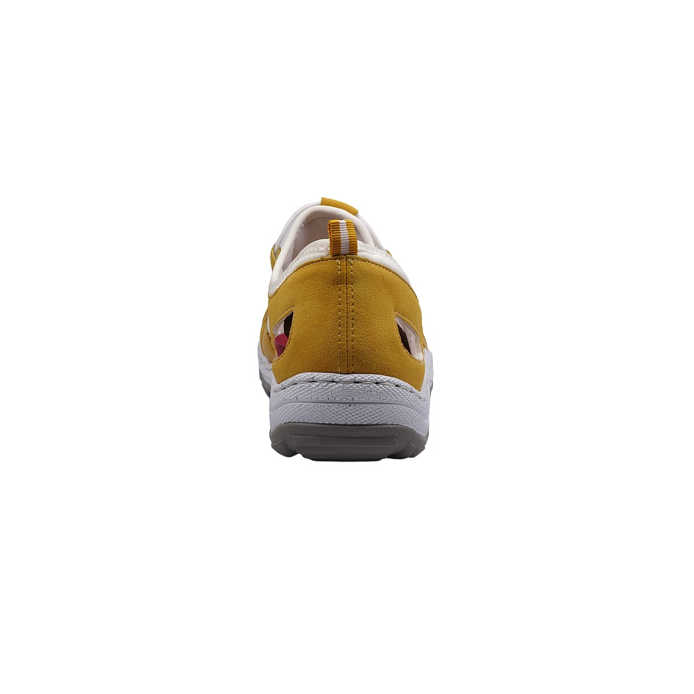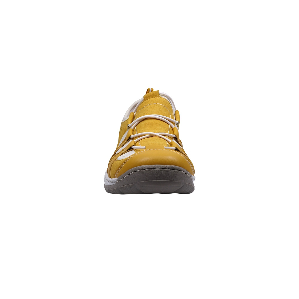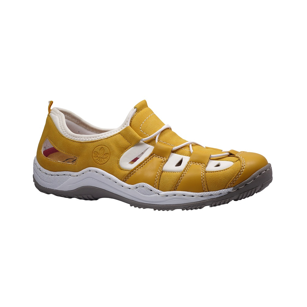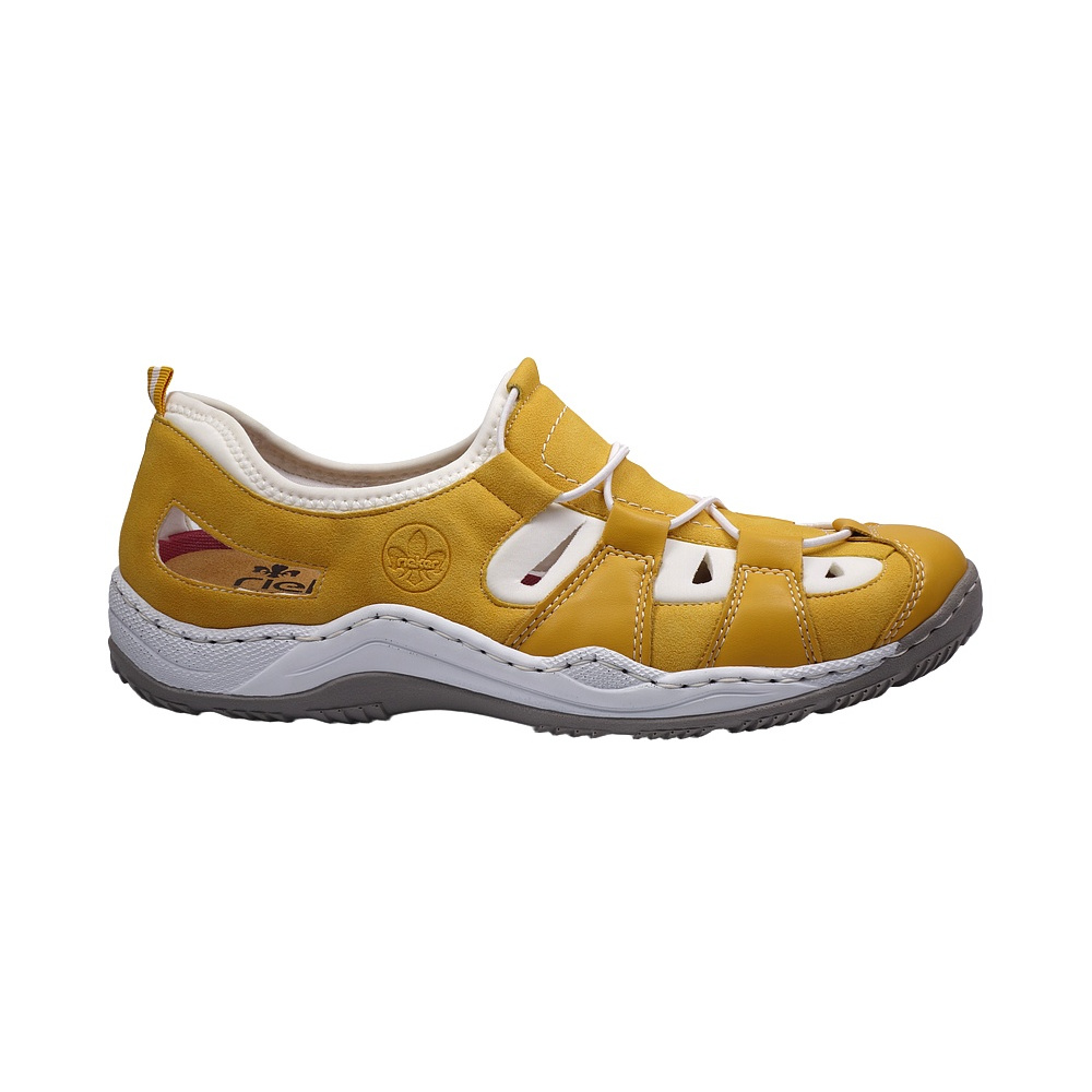 Dámské letní vycházkové mokasíny značky Rieker. Svršek, podšívka, stélka i podešev jsou ze syntetiky. Stélka je vyjmutelná a odpružená. Barva je žlutá (gelb). Obuv je flexiblová (svršek a podešev jsou spojeny šitím). Obuv je vybavena perforací pro lepší klima v obuvi. Šněrování na nártu není funkční je pouze na ozdobu. Obuv je vhodná na nošení do města a v upraveném přírodním prostředí (parky, lesní a polní cesty apod.).