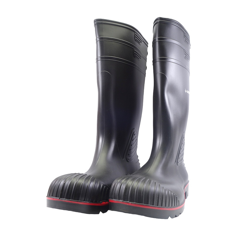 Pánské pracovní holinky značky Dunlop. Svršek je ze syntetiky, podšívka a stélka textilní, podešev syntetická. Barva je černá. Obuv je opatřena kovovou mezipodešví na ochranu proti propíchnutí a kovovou tužinkou ve špici pro ochranu prstů. Holinky jsou jediný typ obuvi, který je 100% a trvale voděodolný. Obuv je vhodná k práci na zahradě nebo středně náročné práce v lese či na stavbě (EN ISO 20345: 2011 S5 SRA).
