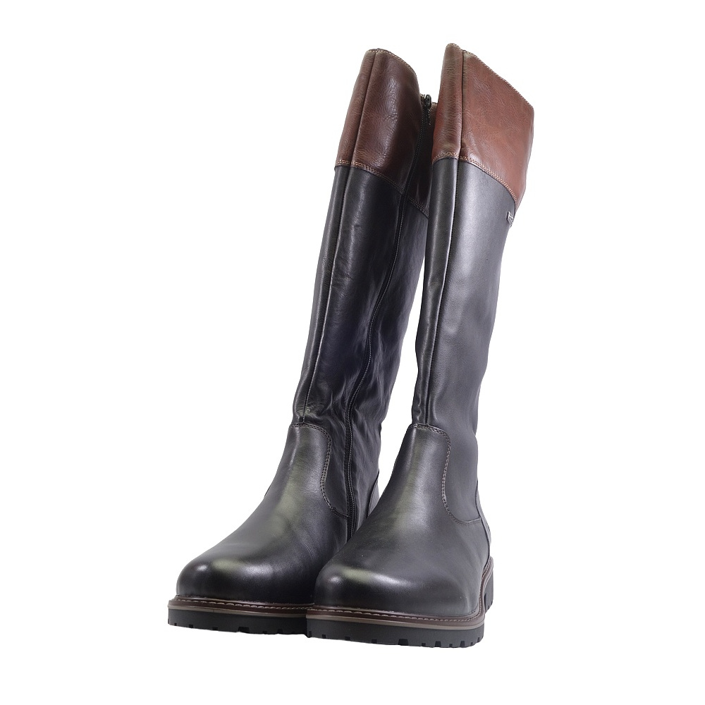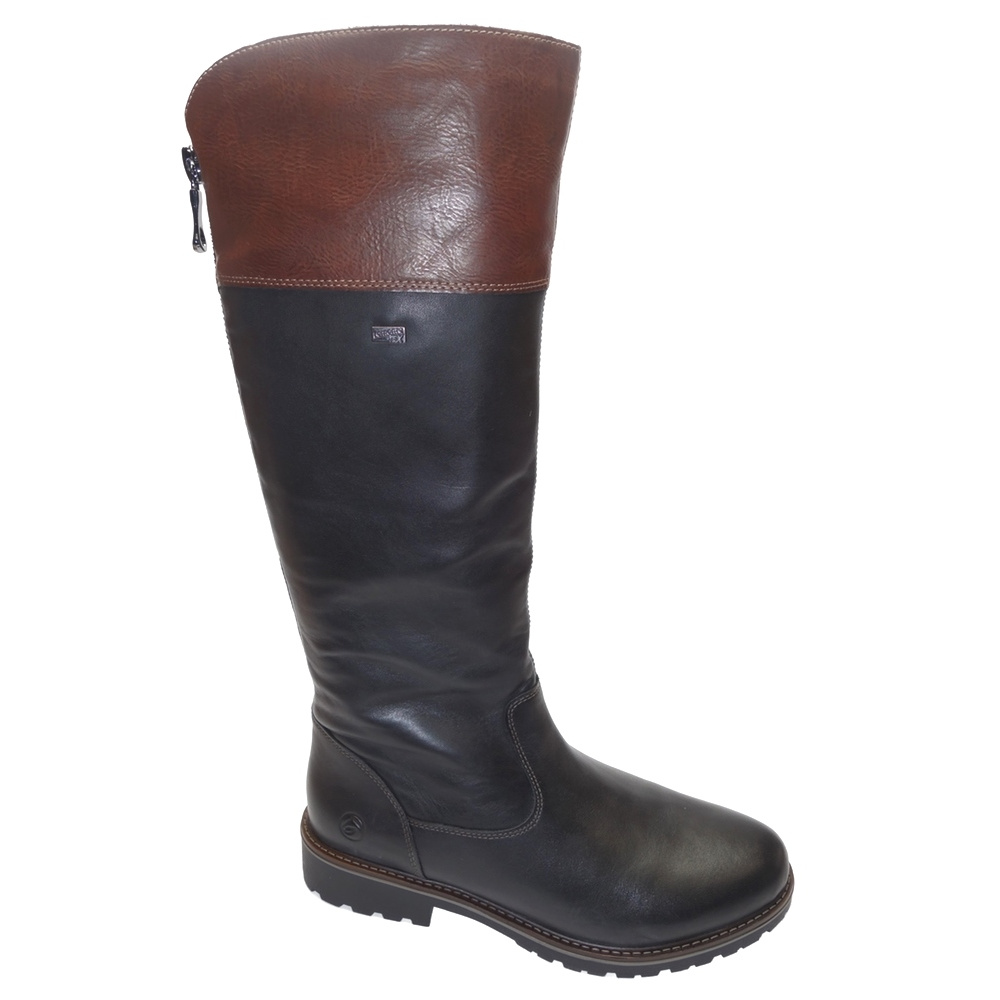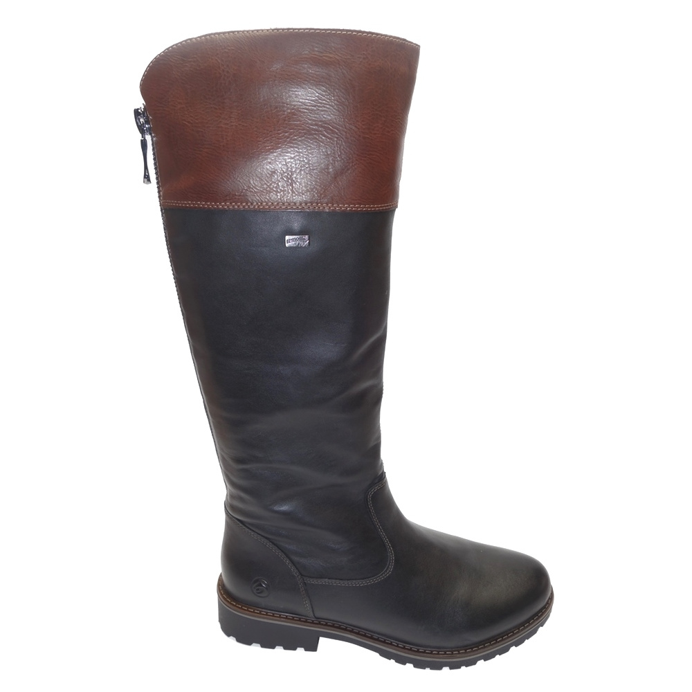 Dámské zimní vycházkové kozačky značky Remonte. Svršek je kombinací hladké kůže a syntetiky, podšívka textilní (vrchní část - umělý kožíšek, spodní část - fleece), stélka textilní (fleece), podešev syntetická. Stélka je vyjmutelná a vyměkčená. Barva je černo-hnědá (schwarz kombi). Šíře lýtka je vario-L (rozepnutím zipu a uvolněním klínku v zadní části lze zvětšit šíři lýtka na XL, 40-46 cm). Obuv je vybavena membránou REMONTE-TEX. Obuv je na straně opatřena zipem pro snažší obutí. Obuv je vhodná na nošení do města a v upraveném přírodním prostředí (parky, lesní a polní cesty apod.).