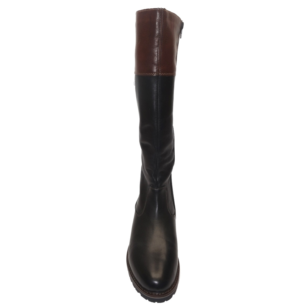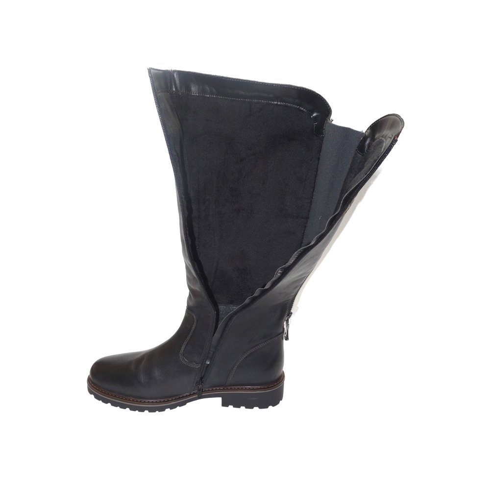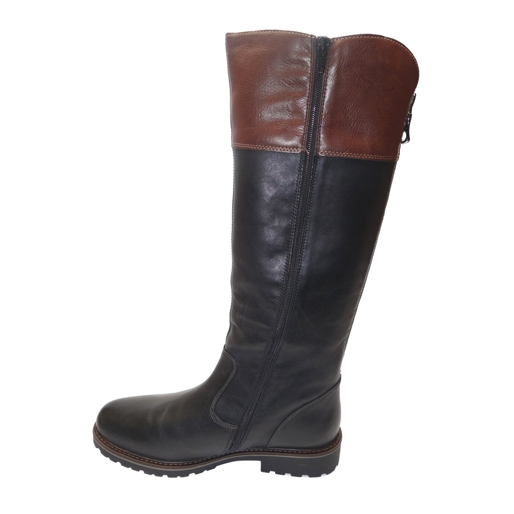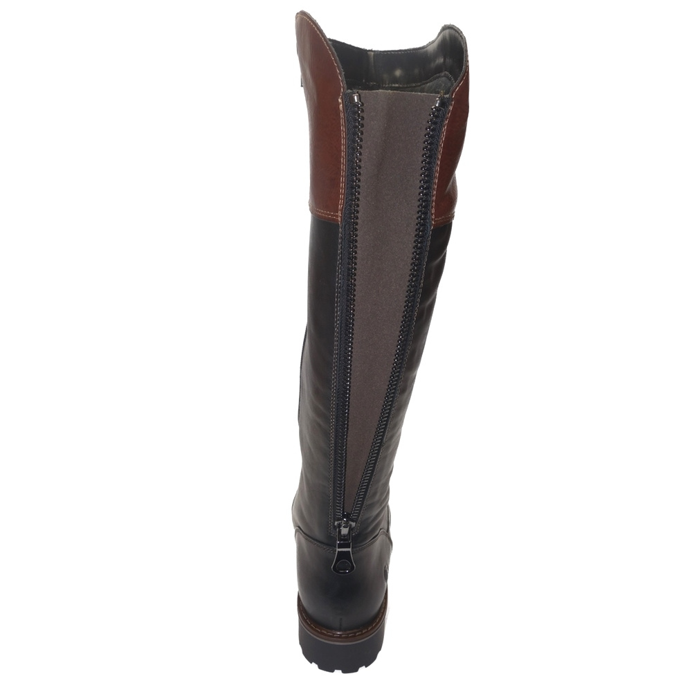 Dámské zimní vycházkové kozačky značky Remonte. Svršek je kombinací hladké kůže a syntetiky, podšívka textilní (vrchní část - umělý kožíšek, spodní část - fleece), stélka textilní (fleece), podešev syntetická. Stélka je vyjmutelná a vyměkčená. Barva je černo-hnědá (schwarz kombi). Šíře lýtka je vario-L (rozepnutím zipu a uvolněním klínku v zadní části lze zvětšit šíři lýtka na XL, 40-46 cm). Obuv je vybavena membránou REMONTE-TEX. Obuv je na straně opatřena zipem pro snažší obutí. Obuv je vhodná na nošení do města a v upraveném přírodním prostředí (parky, lesní a polní cesty apod.).