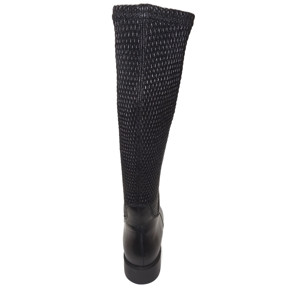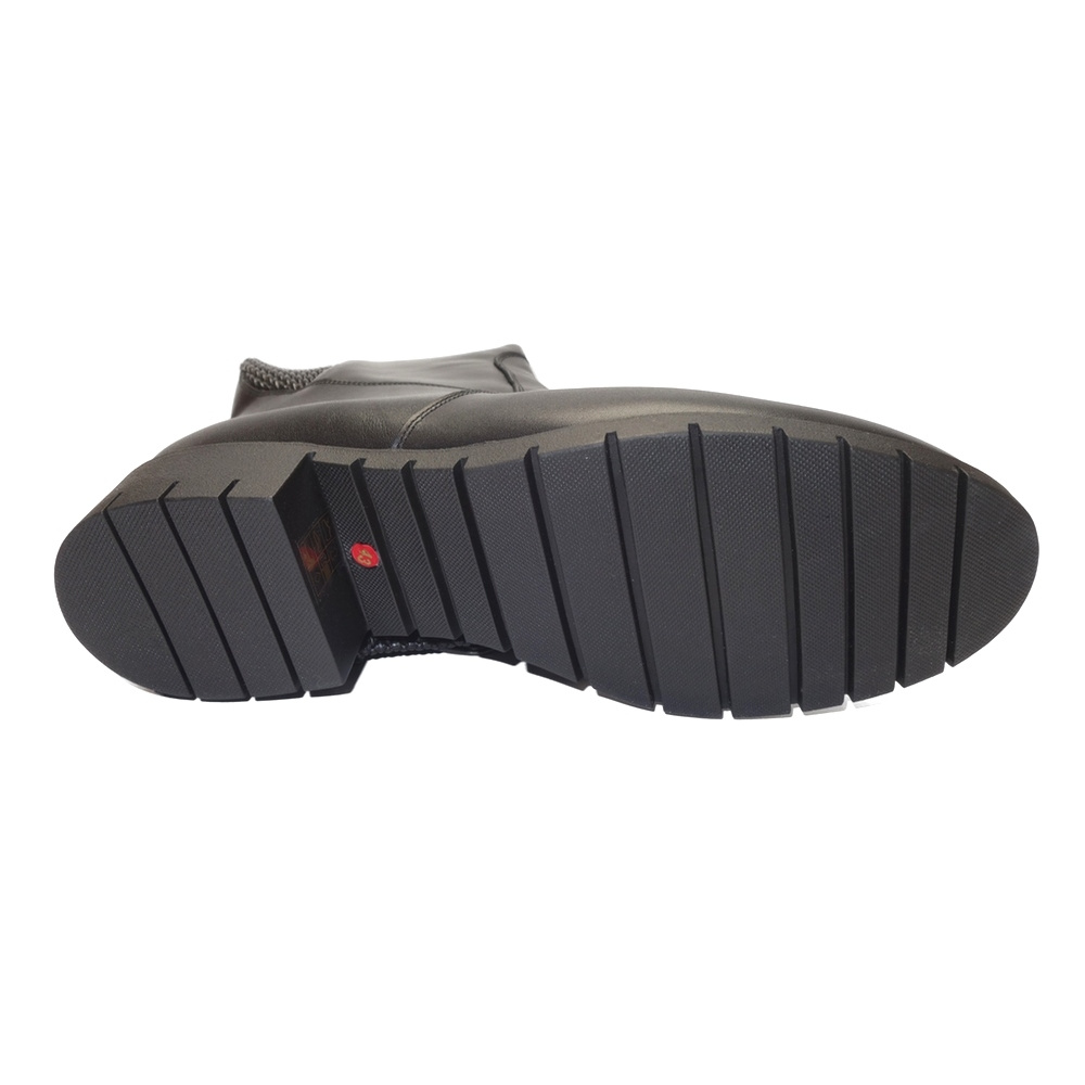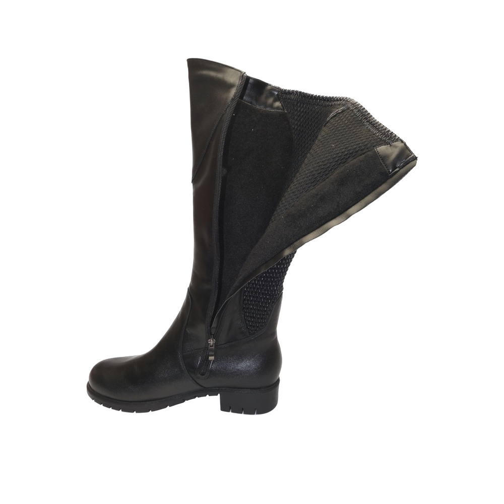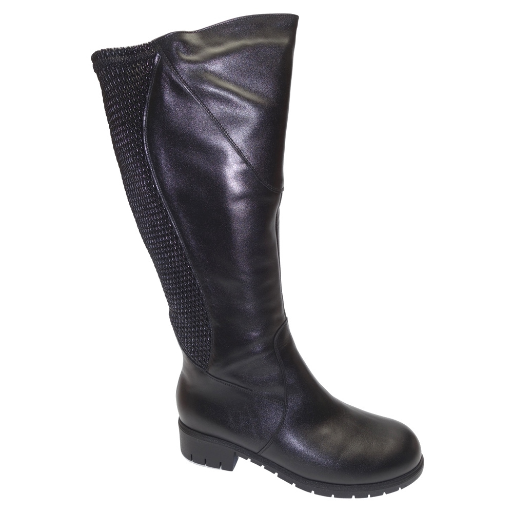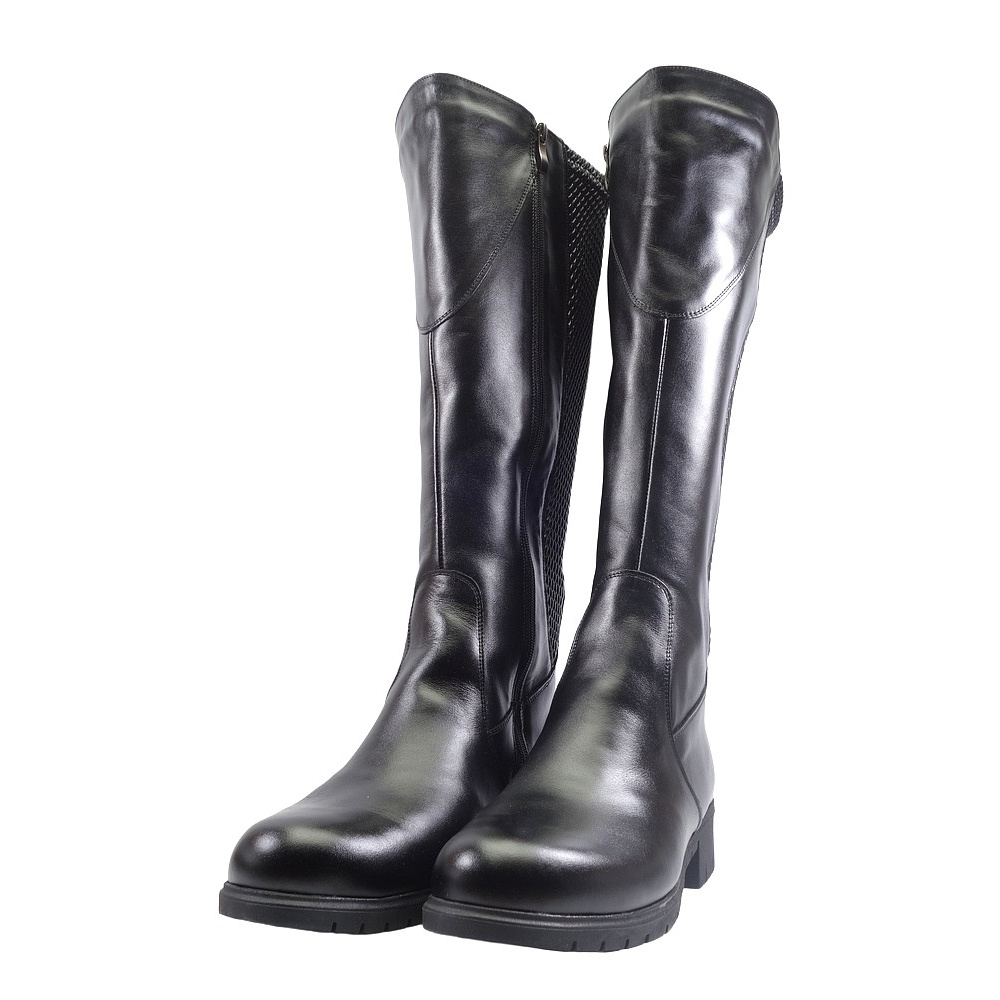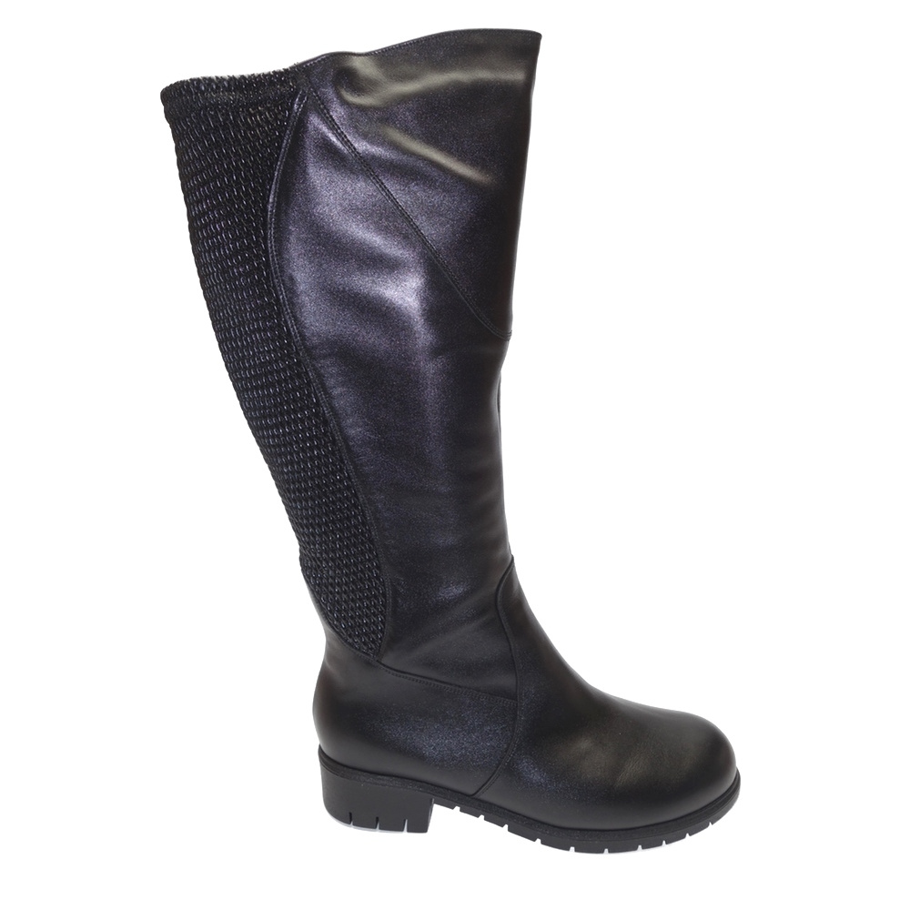 Dámské zimní vycházkové kozačky značky De-Plus. Svršek je kombinací hladké kůže a syntetiky (stretch), podšívka a stélka textilní (umělý beránek), podešev syntetická. Barva je černá. Šíře je K (extra široká). Šíře lýtka je vario-XXL (47-53 cm). Výška podpatku je 35 mm. Obuv je z boku vybavena zipem pro snažší obutí a na zadní části stretchovým materiálem pro větší komfort. Obuv je vhodná na nošení do města a v upraveném přírodním prostředí (parky, lesní a polní cesty apod.).