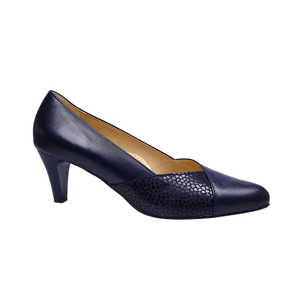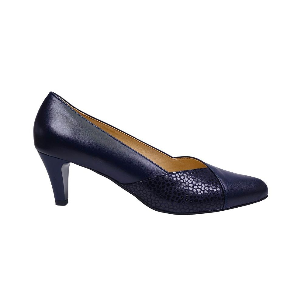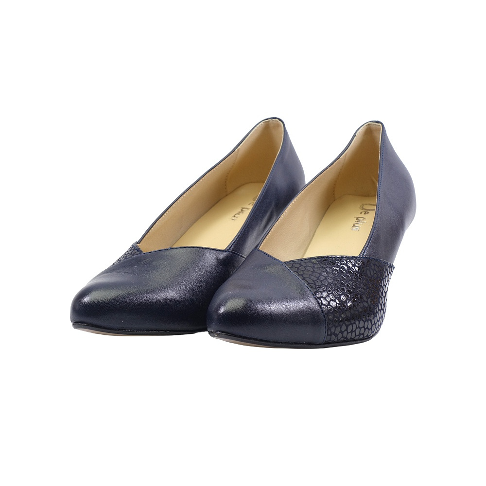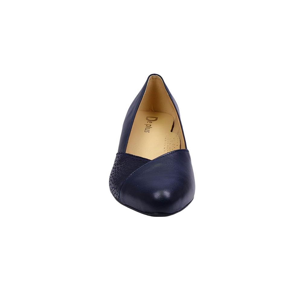 Dámské vycházkové lodičky značky De-Plus. Svršek je kombinací hladké kůže a broušené kůže s lesklým potiskem, podšívka kombinací kůže a syntetiky, stélka kožená (stélka je vybavena tlumícím polštářkem v místě prstních kloubů pro větší komfort), podešev syntetická (hladká s jemným dezénem). Barva je tmavě modrá. Šíře je G. Výška podpatku je 60 mm. Obuv je vhodná na nošení do města a do společnosti.