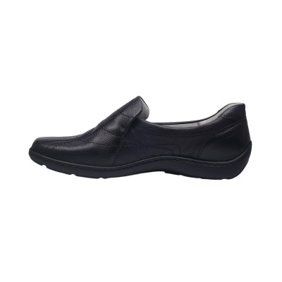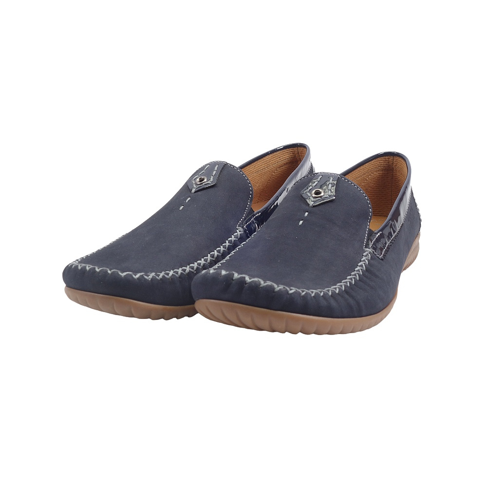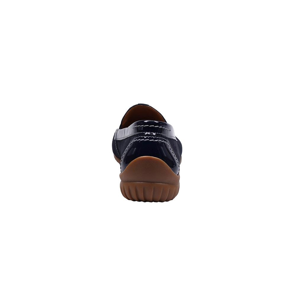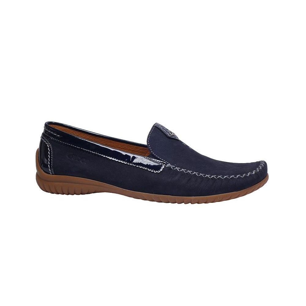 Dámské vycházkové mokasíny značky Gabor. Svršek je kombinací broušené kůže (nubuk) a lakované kůže, podšívka textilní, stélka kožená, podešev syntetická (LATEX, non-marking). Barva je tmavě modrá (nightblue). Šíře je G. Obuv je vhodná na nošení do města a v upraveném přírodním prostředí (parky, lesní a polní cesty apod.).