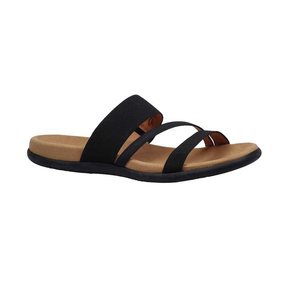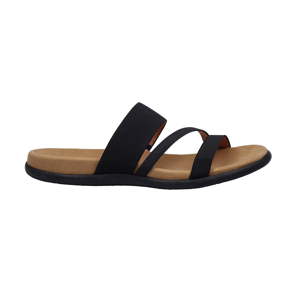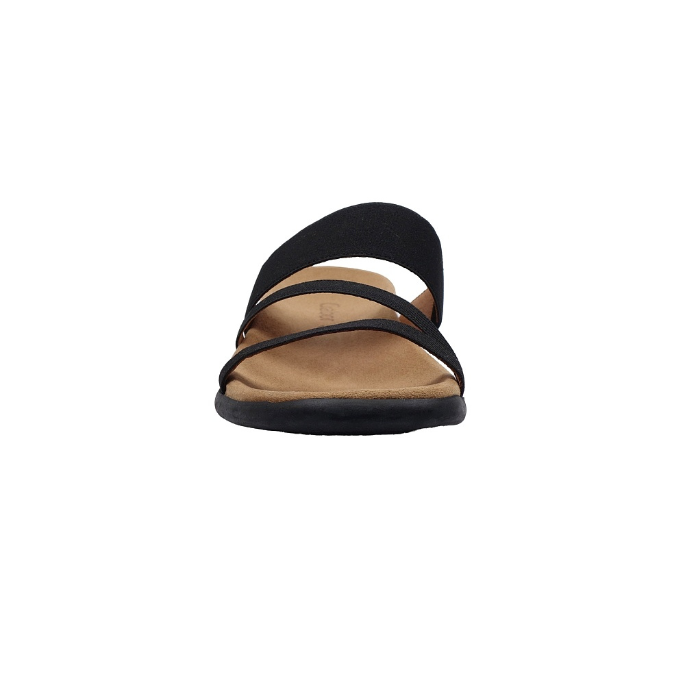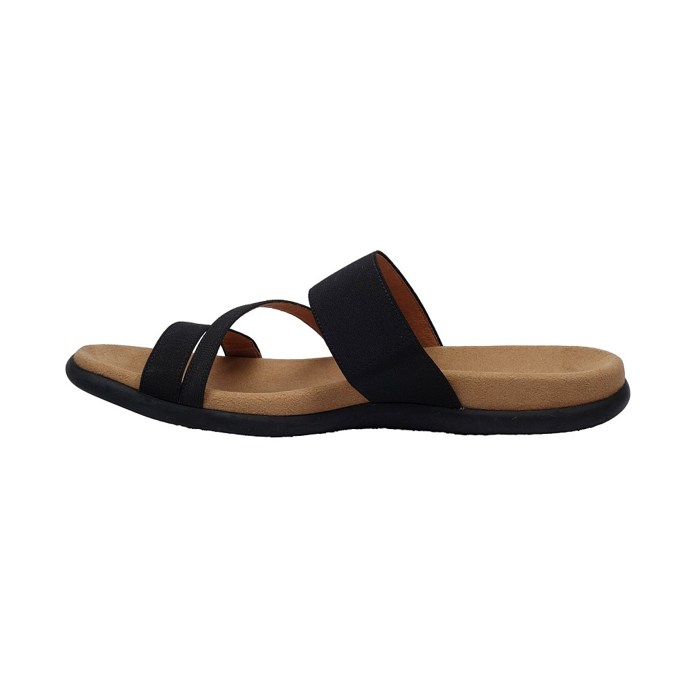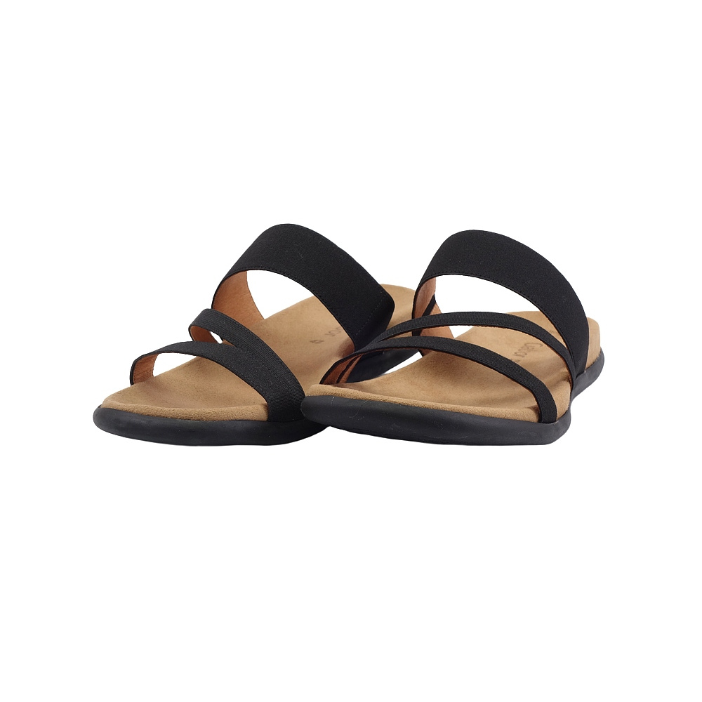 Dámské letní vycházkové pantofle značky Gabor. Svršek je textilní, podšívka kožená, stélka textilní, podešev syntetická. Barva je černá. Pásek přes nárt je ze strany opatřen gumičkou pro větší komfort. Obuv je vhodná na nošení do města a v upraveném přírodním prostředí (parky, pláže, lesní a polní cesty apod.).