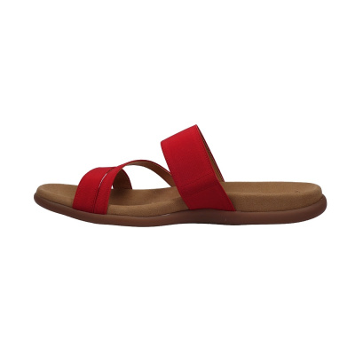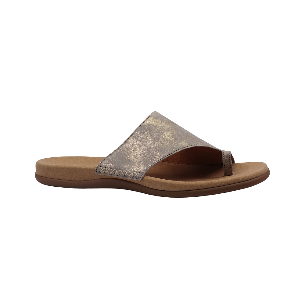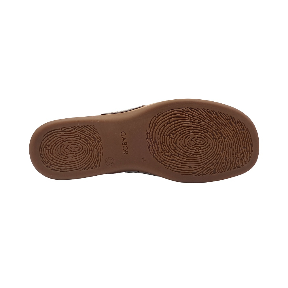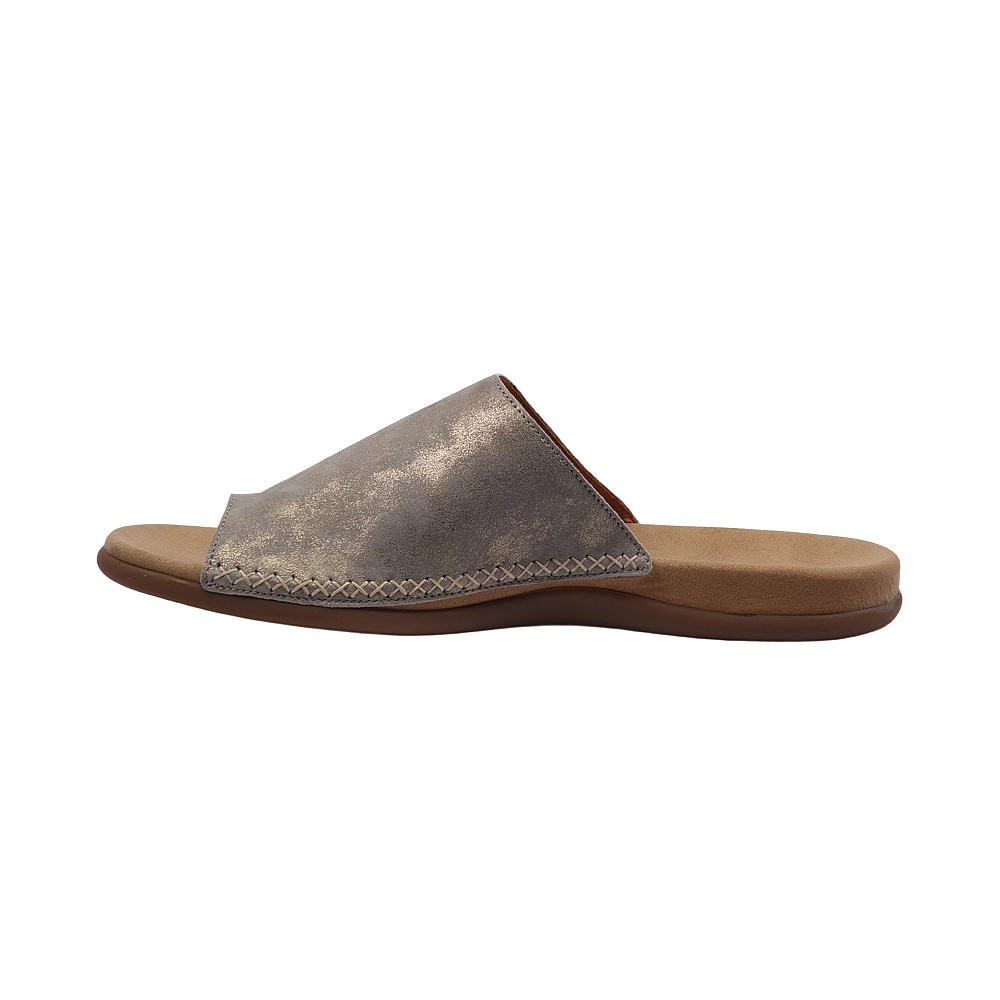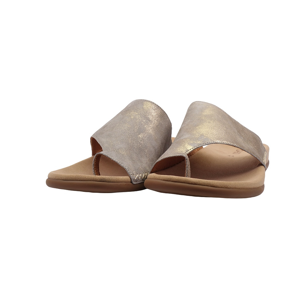 Dámské letní vycházkové pantofle - žabky značky Gabor. Svršek je z broušené kůže s metalickým efektem, podšívka kožená, stélka textilní, podešev syntetická (non-marking). Barva je muschel (šedo-zlatá). Obuv je vhodná na nošení do města a v upraveném přírodním prostředí (parky, pláže, lesní a polní cesty apod.).