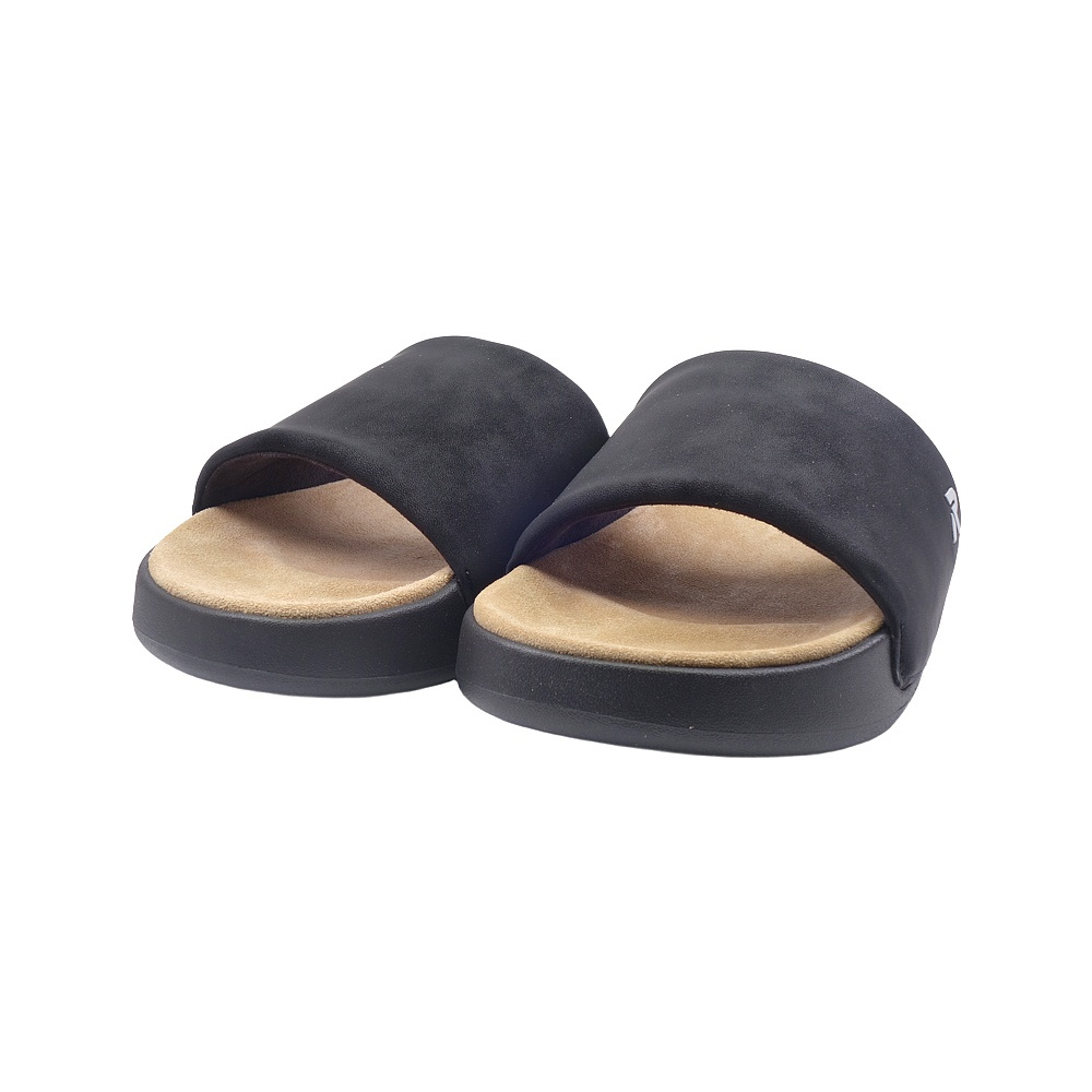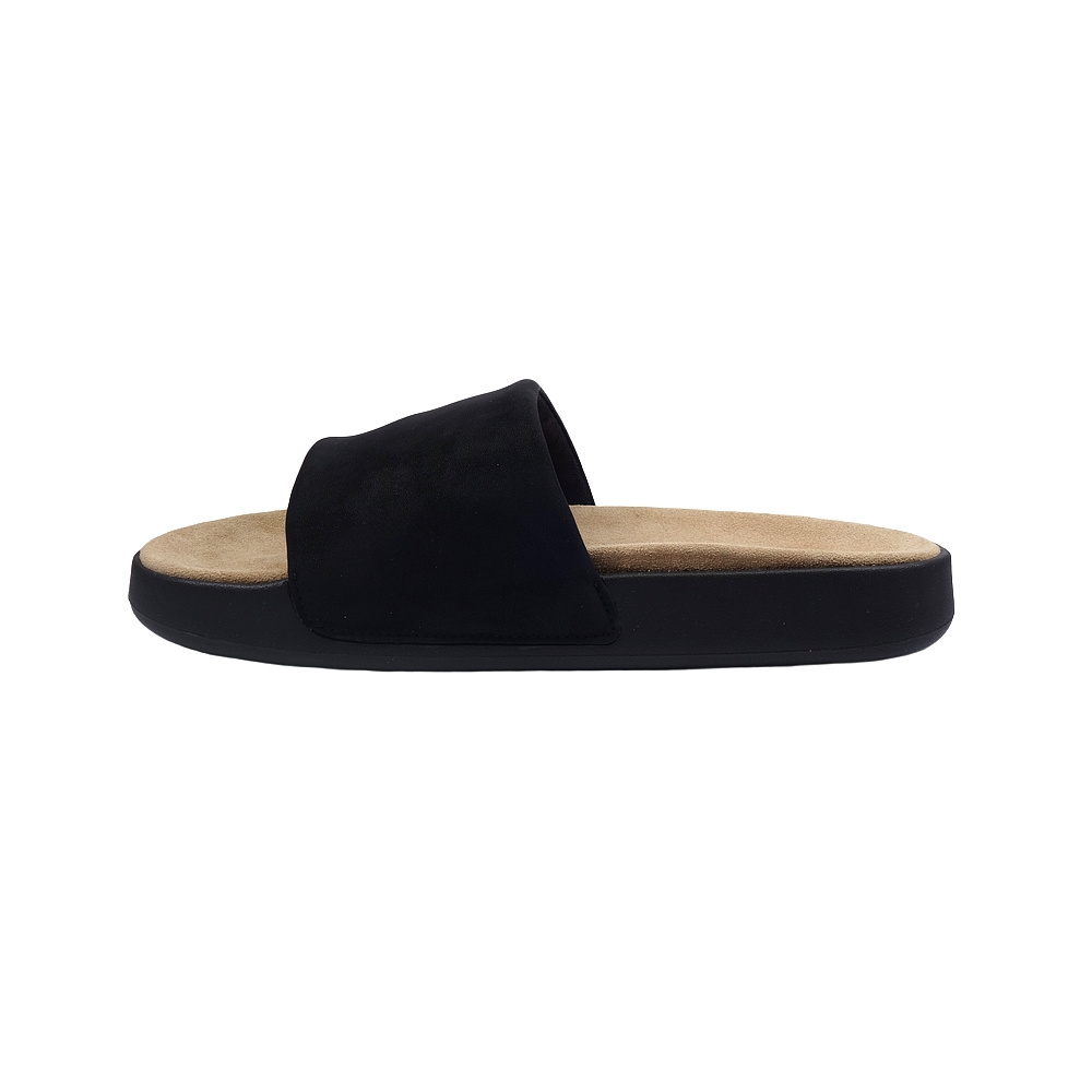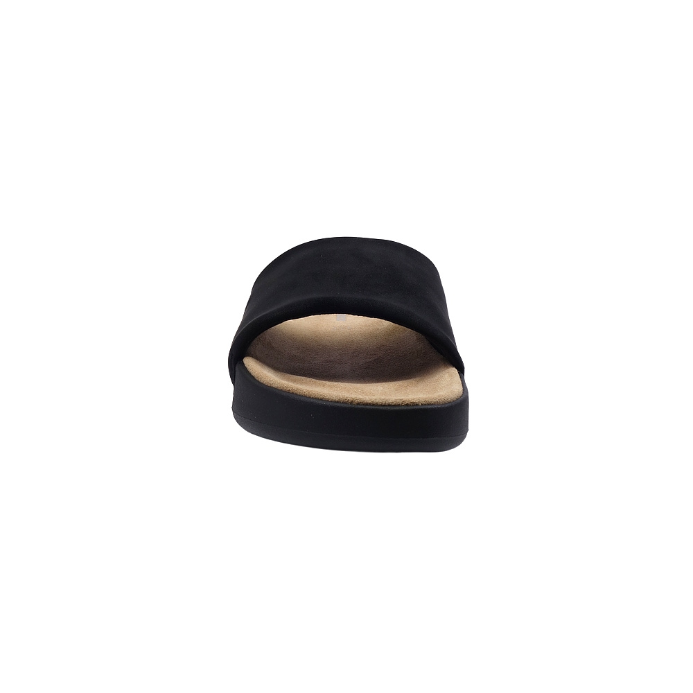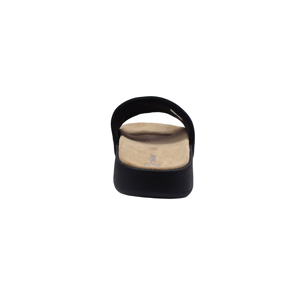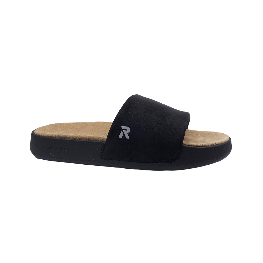 Dámské letní vycházkové pantofle značky Rieker. Svršek je ze syntetiky (vzhledově podobná broušené kůži - nubuku), podšívka textilní, stélka kožená (stélka je odpružená pro větší pohodlí), podešev syntetická. Barva je černá (schwarz). Obuv je vhodná na nošení do města a v upraveném přírodním prostředí (parky, pláže, lesní a polní cesty apod.).