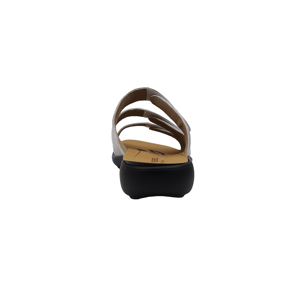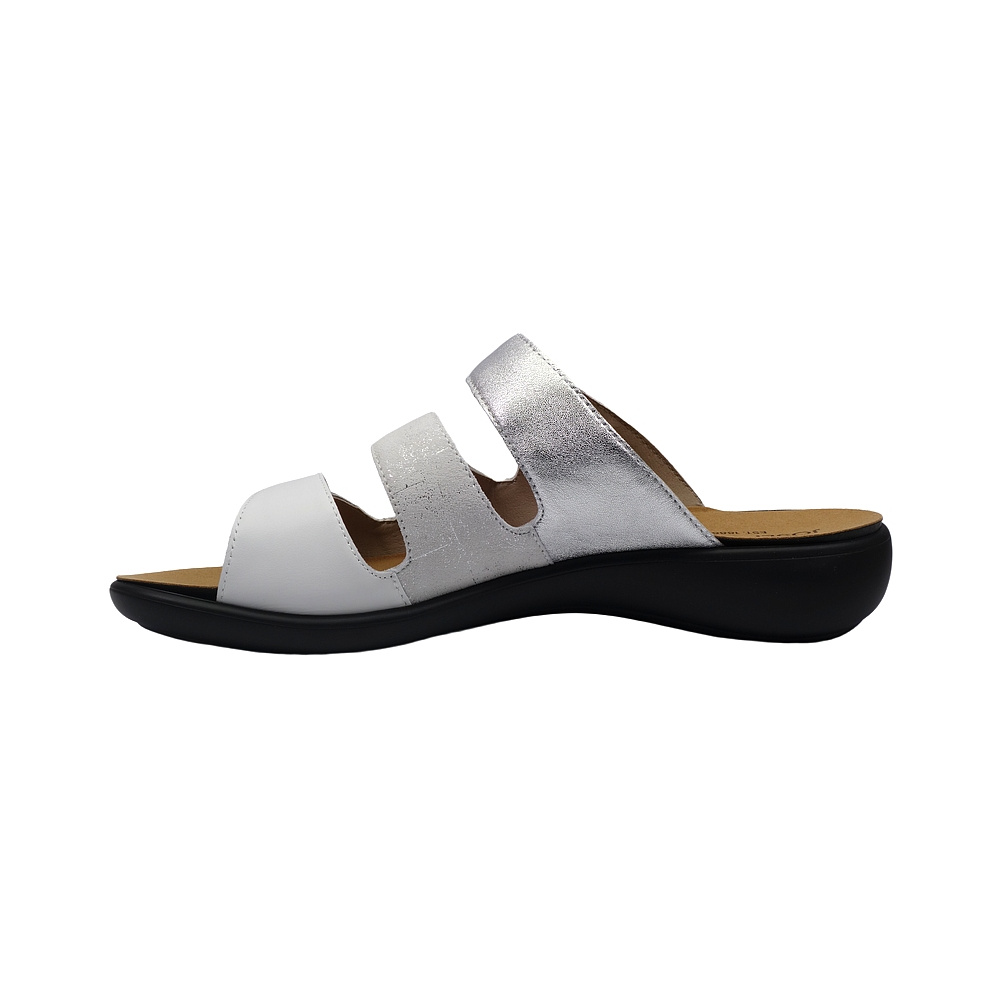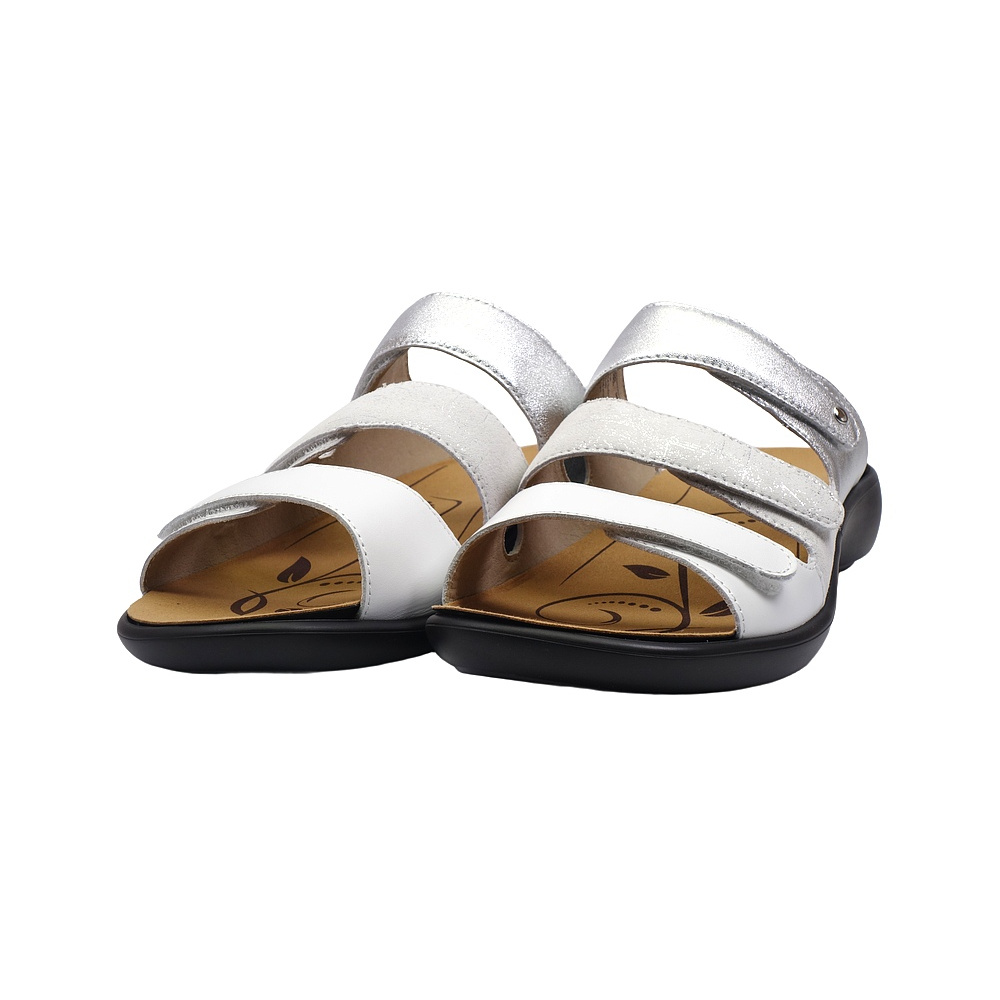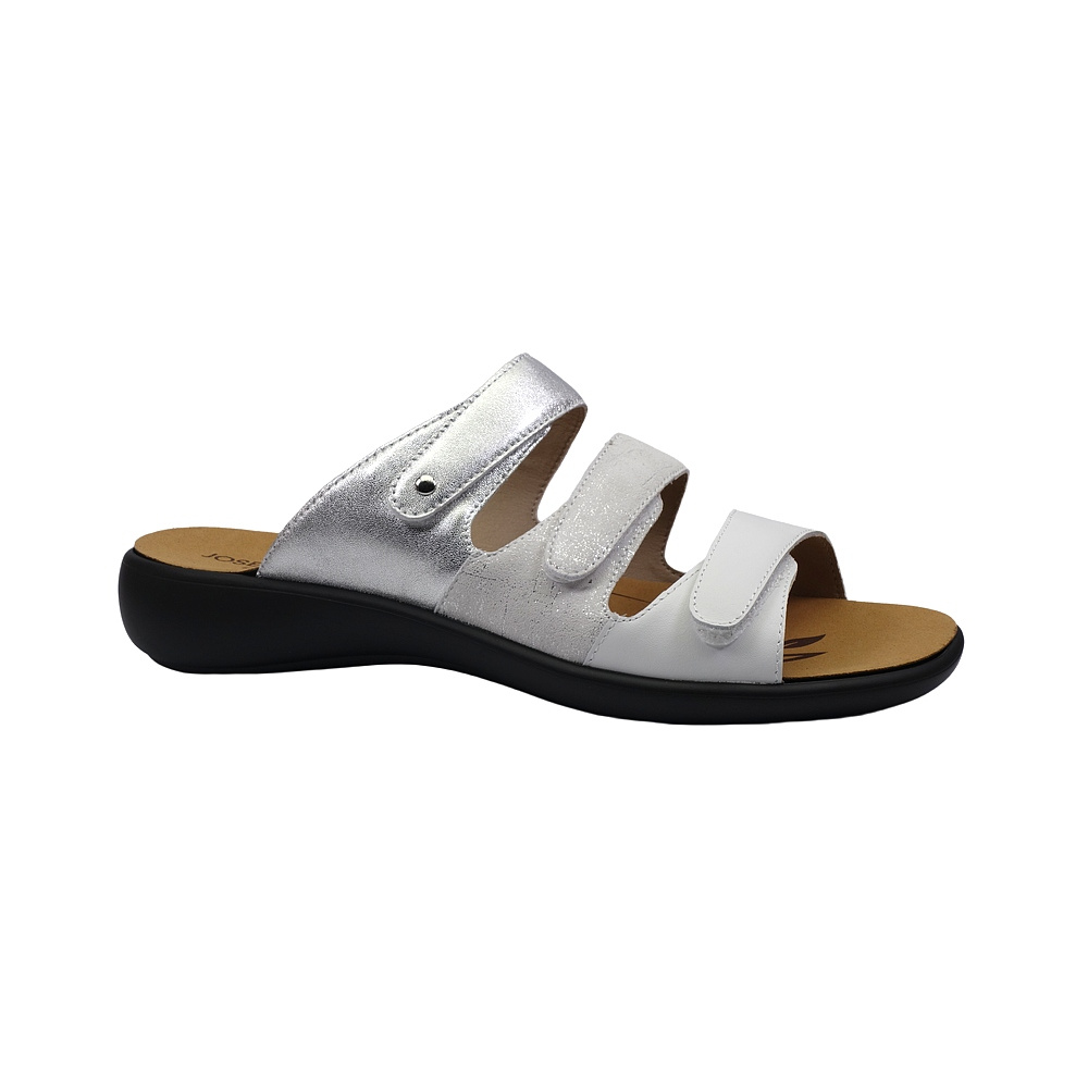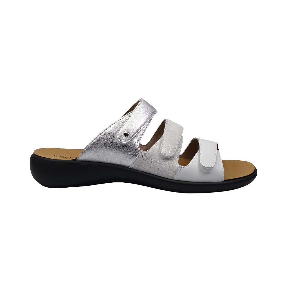 Dámské letní vycházkové pantofle značky Josef Seibel. Svršek je kombinací hladké kůže, broušené kůže s lesklým potiskem a kůže s metalickým (kovovým) efektem, podšívka syntetická, stélka textilní, podešev syntetická (WELLNESS CONCEPT). Stélka je vyjmutelná, odpružená a anatomicky tvarovaná (v obuvi je uchycena pomocí suchých zipů). Barva je bílo-stříbrná (weiss-multi). Šíře je G. Podešev obuvi je v patní části vybavena tlumícím materiálem pro větší komfort (SHOCK). Pásky přes nárt a prsty mají zapínání na suchý zip. Obuv je vhodná na nošení do města a v upraveném přírodním prostředí (parky, lesní a polní cesty apod.).