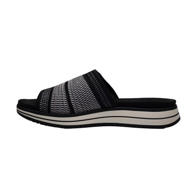 Dámské letní vycházkové pantofle značky Josef Seibel. Svršek je kombinací hladké kůže, broušené kůže s lesklým potiskem a kůže s metalickým (kovovým) efektem, podšívka syntetická, stélka textilní, podešev syntetická (WELLNESS CONCEPT). Stélka je vyjmutelná, odpružená a anatomicky tvarovaná (v obuvi je uchycena pomocí suchých zipů). Barva je bílo-stříbrná (weiss-multi). Šíře je G. Podešev obuvi je v patní části vybavena tlumícím materiálem pro větší komfort (SHOCK). Pásky přes nárt a prsty mají zapínání na suchý zip. Obuv je vhodná na nošení do města a v upraveném přírodním prostředí (parky, lesní a polní cesty apod.).