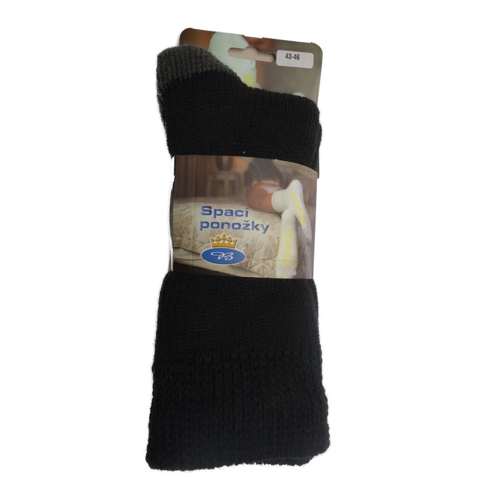 Teplé froté spací ponožky Boma černá. Silný úplet je velmi jemný a příjemný, ponožky dobře hřejí, a to i díky podílu ovčí vlny. Extra jemný neškrtící lem podporuje dobré prokrvení nohou. Barva ponožek je černá s šedým chodidlem a špicí. Ponožky jsou vhodné na spaní a také na doma.