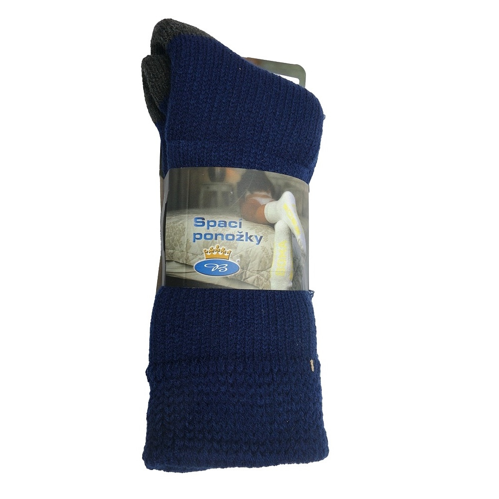 Teplé froté spací ponožky Boma tmavě modrá. Silný úplet je velmi jemný a příjemný, ponožky dobře hřejí, a to i díky podílu ovčí vlny. Extra jemný neškrtící lem podporuje dobré prokrvení nohou. Barva ponožek je černá s šedým chodidlem a špicí. Ponožky jsou vhodné na spaní a také na doma.