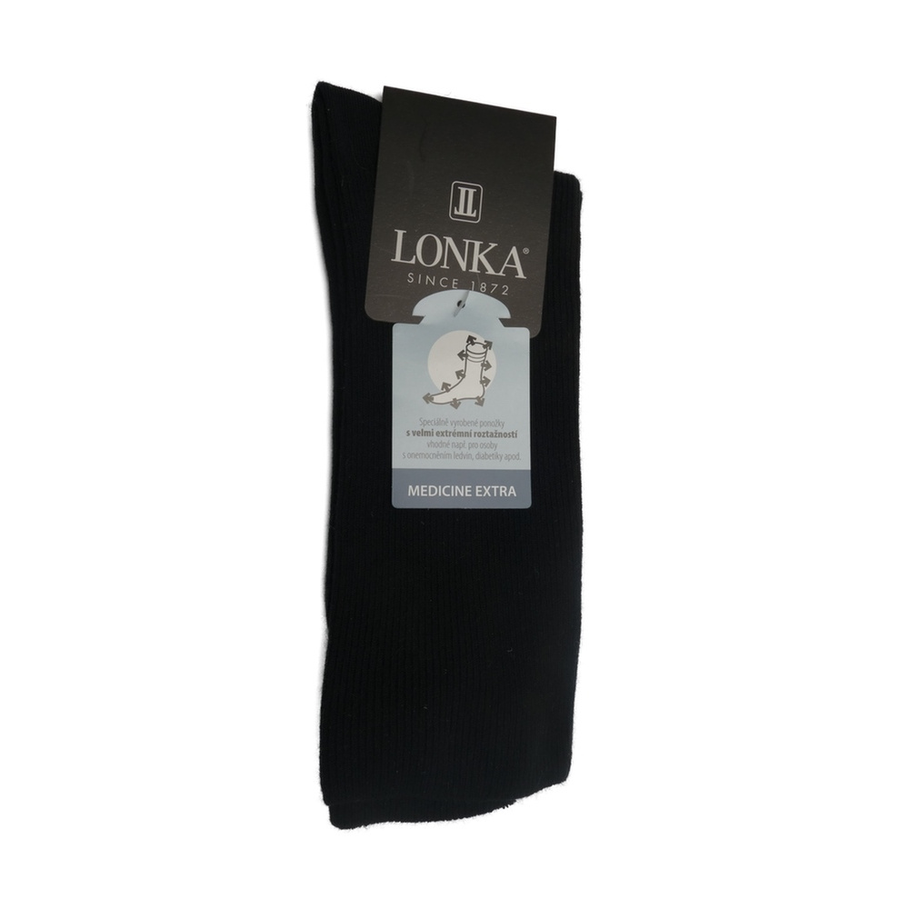 Speciální medicine ponožky Lonka Oregan černá jsou vyvinuté pro diabetiky, pacienty s bércovými vředy a osoby s oteklými dolními končetinami. Jedinečný materiál a způsob pletení umožňuje maximální roztažení ponožek. Ponožky mají žebrovaný úplet a volný lem, který zamezuje otlakům a zaškrcení průtoku krve. Řetízkovaná bezešvá špice zamezuje otlakům prstů, které mohou vzniknout při klasickém sešití. Ponožky jsou klasické výšky, jsou velmi příjemné na noze a dobře sají pot. Vhodné na velmi široké nohy pro každodenní nošení.