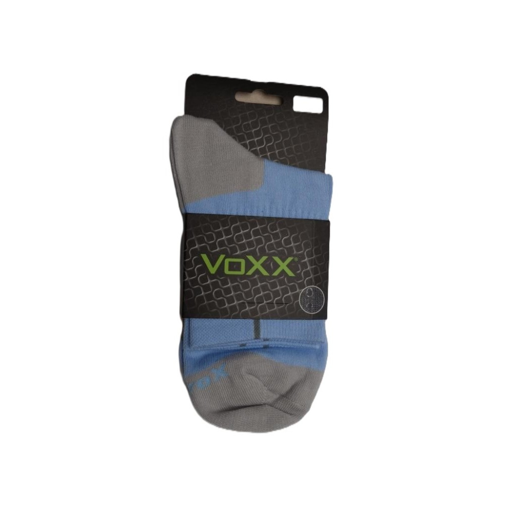 Sportovní ponožky VoXX Josef světle modrá, jsou tenké ponožky s ionty stříbra. Ponožky jsou světle modré s šedou špicí a patou a modrým nápisem na chodidle. Ponožky obsahují speciálně vypředené polypropylenové vlákno SilproX s obsahem iontů stříbra, které působí antibakteriálně a značně omezuje tvorbu bakterií a plísní. Bakterie jsou stříbrem přirozeně zničeny a nedochází pak k tvorbě zápachu. Ponožky mají volný neškrtící lem a vysoký podíl bavlny pro dobrý odvod potu. Elastická bandáž na nártu, zabraňuje přetočení ponožek v obuvi. Jsou vhodné pro celodenní nošení i pro sportovní vyžití.