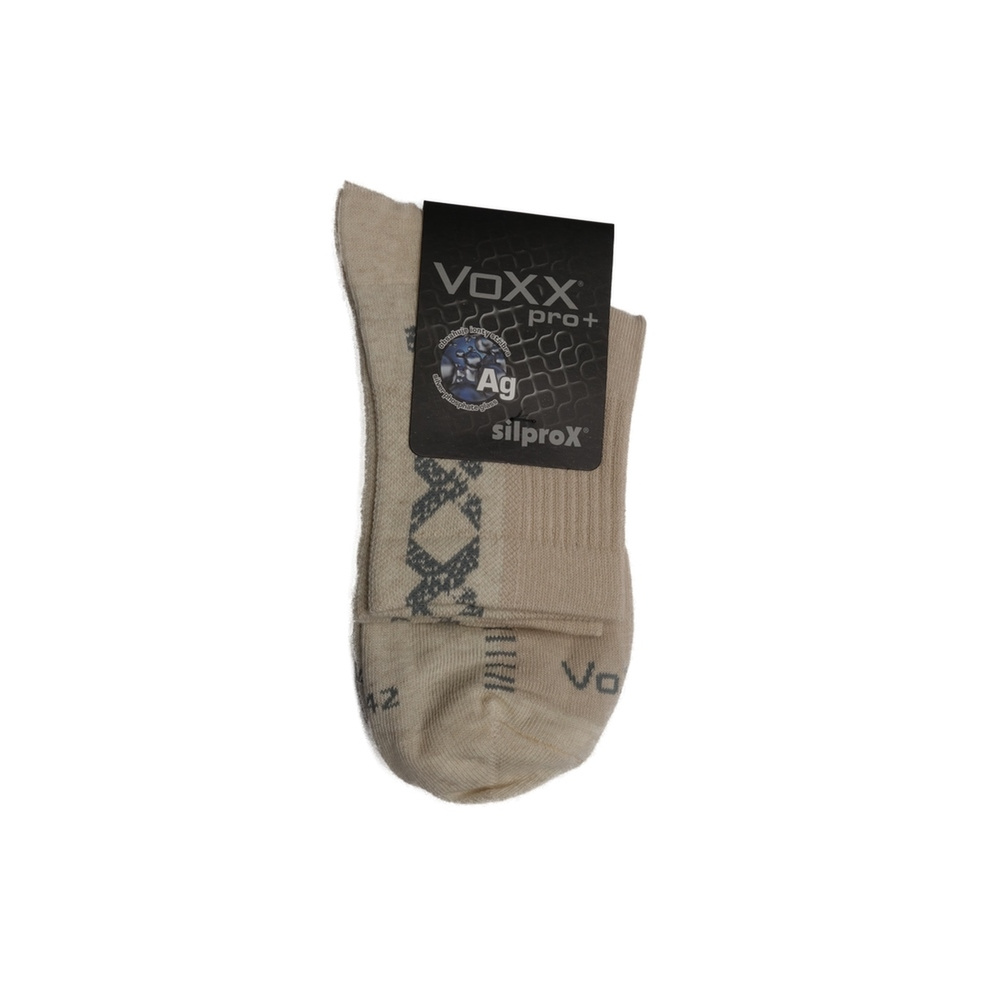 Středně vysoké, sportovní ponožky VoXX Revolt béžová, jsou tenké ponožky s ionty stříbra. Ponožky jsou béžové se světle béžovým chodidlem a šedými detaily a nápisy. Ponožky obsahují speciálně vypředené polypropylenové vlákno SilproX s obsahem iontů stříbra, které působí antibakteriálně a značně omezuje tvorbu bakterií a plísní. Bakterie jsou stříbrem přirozeně zničeny a nedochází pak k tvorbě zápachu. Ponožky mají volný neškrtící lem a vysoký podíl bavlny pro dobrý odvod potu. Elastická bandáž na nártu, zabraňuje přetočení ponožek v obuvi. Výška ponožek je střední, ponožky končí mírně nad kotníkem. Jsou vhodné pro celodenní nošení i pro sportovní vyžití.