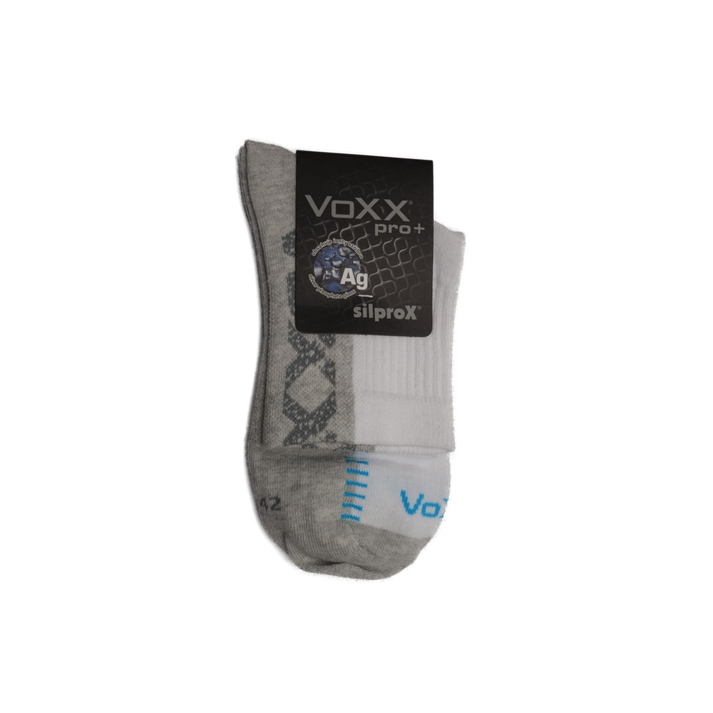 Středně vysoké, sportovní ponožky VoXX Revolt bílá, jsou tenké ponožky s ionty stříbra. Ponožky jsou bílé se světle šedým chodidlem a modrými a šedými detaily a nápisy. Ponožky obsahují speciálně vypředené polypropylenové vlákno SilproX s obsahem iontů stříbra, které působí antibakteriálně a značně omezuje tvorbu bakterií a plísní. Bakterie jsou stříbrem přirozeně zničeny a nedochází pak k tvorbě zápachu. Ponožky mají volný neškrtící lem a vysoký podíl bavlny pro dobrý odvod potu. Elastická bandáž na nártu, zabraňuje přetočení ponožek v obuvi. Výška ponožek je střední, ponožky končí mírně nad kotníkem. Jsou vhodné pro celodenní nošení i pro sportovní vyžití.
