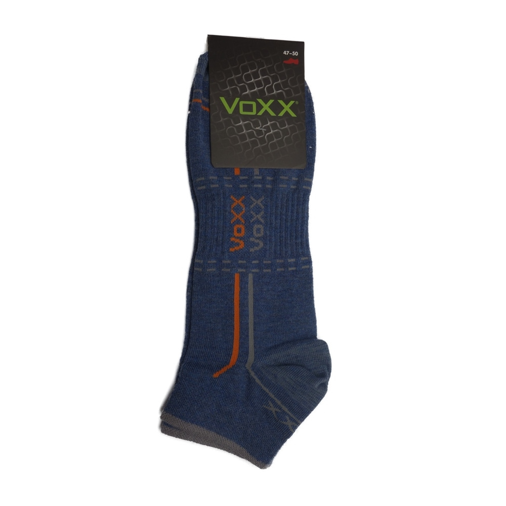 Nízké sportovní ponožky VoXX Rex 11 jeans melé, jsou slabé kotníkové ponožky na celodenní nošení i letní indoorové a outdoorové aktivity. Ponožky jsou džínově modré s šedými a oranžovými detaily a nápisy, pata a špice jsou modrošedě žíhané. Tyto sportovní ponožky mají vyšší podíl bavlny pro dobrý odvod vlhkosti, prodyšnou zónu na nártu, elastickou zónu proti přetočení ponožky, jemný nestahující lem a řetízkovanou špici. Výška ponožek pod kotník je ideální na léto.