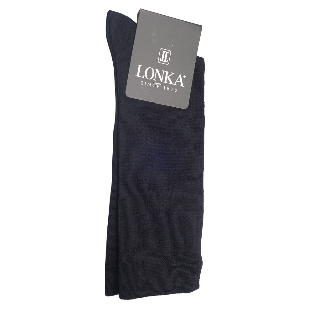 Pánské vysoké společenské ponožky Lonka Diplomat černá. Ponožky jsou jednobarevné, černé s tmavě šedým nápisem na chodidle, který usnadňuje párování ponožek při praní. Tyto slabé ponožky mají vysoký podíl bavlny a umí dobře pohlcovat vlhkost. Špice je uzavřena řetízkováním, takže nikde netlačí, ponožkový lem je jemný a nestahující. Velmi jemný a hladký 200 jehlový úplet je příjemný na dotek. Ponožky mají prodlouženou výšku a jsou vhodné k obleku.