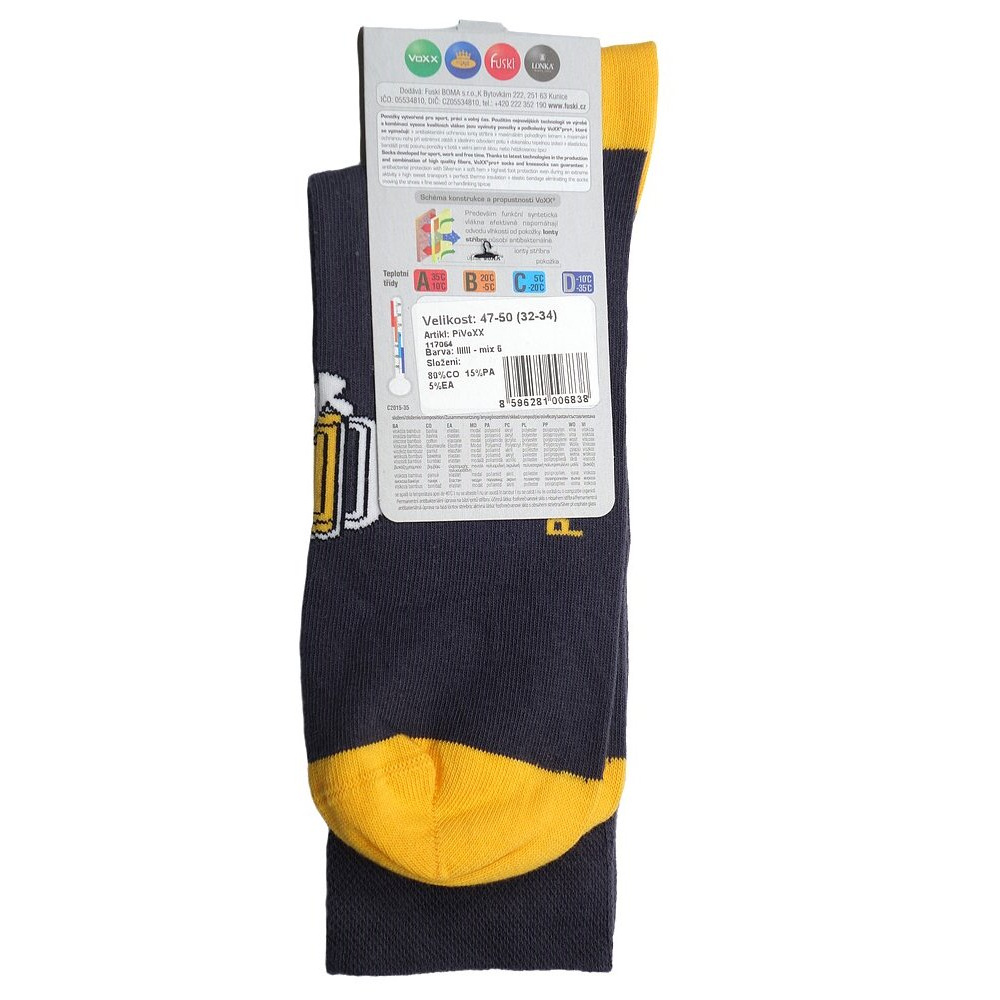 Módní ponožky Voxx PiVoXX jsou bavlněné ponožky s motivem piva, které ocení každý milovník tohoto nápoje. Bavlna dobře pohlcuje vlhkost a díky elastanu a polyamidu ponožky déle vydrží, dobře se přizpůsobí noze a drží tvar. Ponožky obsahují také speciální vlákno SilproX s obsahem iontů stříbra, které působí antibakteriálně a značně omezuje tvorbu bakterií a plísní. Bakterie jsou stříbrem přirozeně zničeny a nedochází pak k tvorbě zápachu. Tyto ponožky mají klasickou výšku a jsou vhodné pro každodenní nošení.