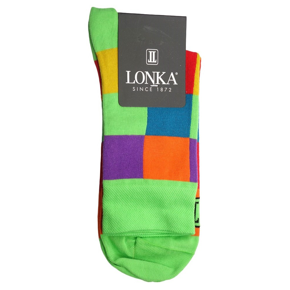 Módní ponožky Lonka Decube zelená, jsou bavlněné ponožky s hravým designem barevných kostek. Bavlna dobře pohlcuje vlhkost a díky elastanu a polypropylenu ponožky déle vydrží, dobře se přizpůsobí noze a drží tvar. Ponožky obsahují také speciální vlákno SilproX s obsahem iontů stříbra, které působí antibakteriálně a značně omezuje tvorbu bakterií a plísní. Bakterie jsou stříbrem přirozeně zničeny a nedochází pak k tvorbě zápachu. Ponožky jsou velmi jemné a hladké díky 200 jehlovému úpletu. Zakončení špice pomocí řetízkování a jemný nestahující lem pak pomáhají chránit nohu před otlaky nebo puchýři. Ponožky mají klasickou výšku a jsou vhodné pro každodenní nošení.