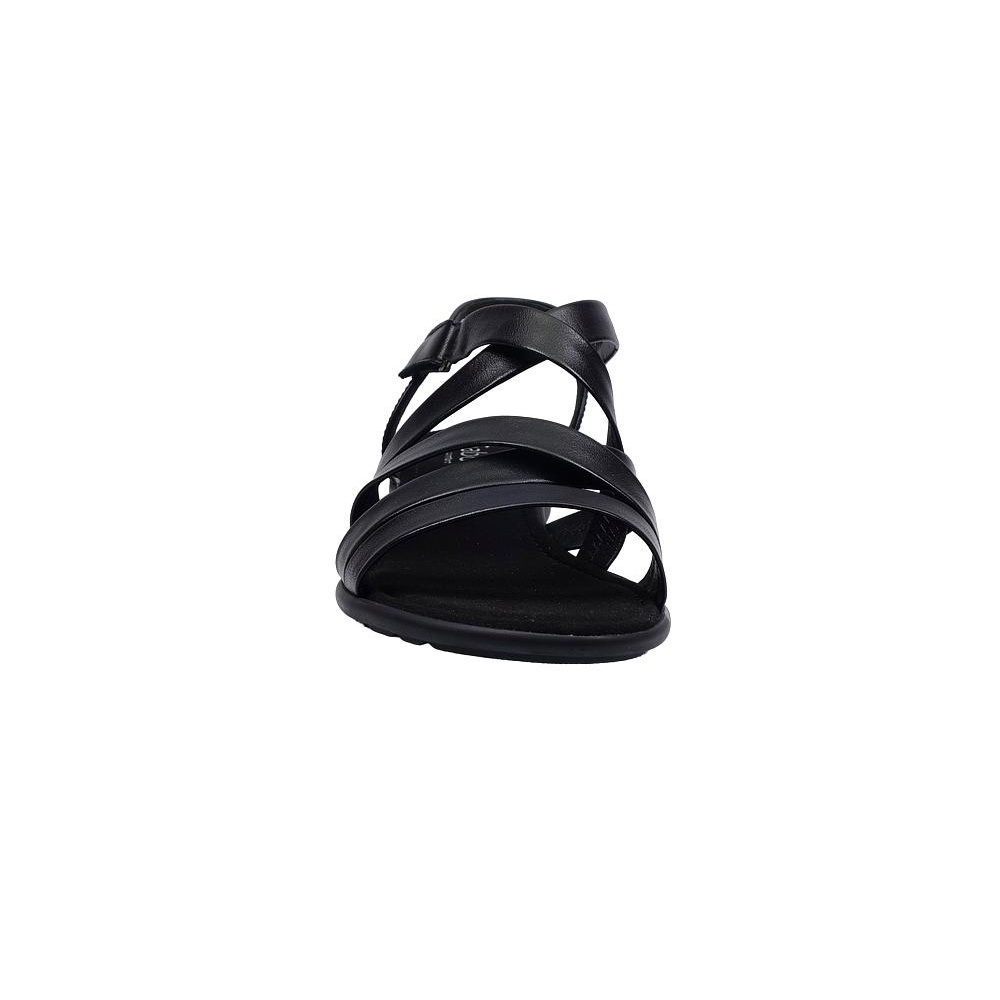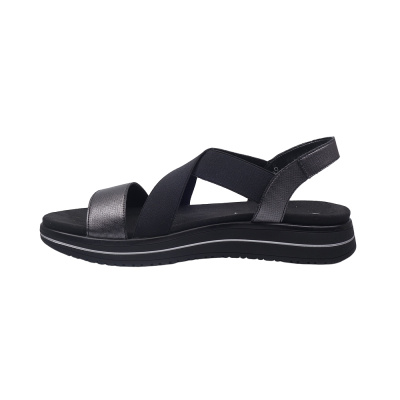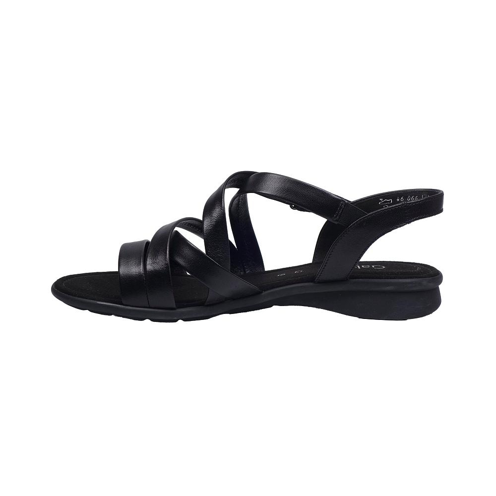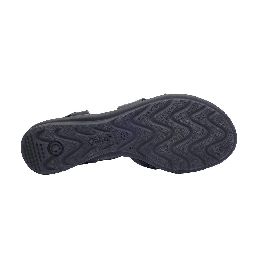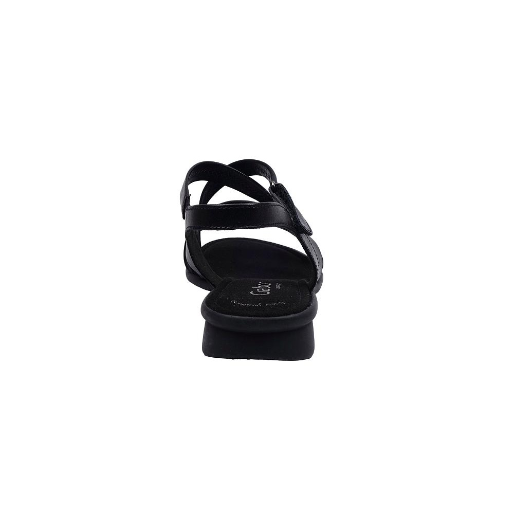 Dámské letní vycházkové sandály značky Gabor. Svršek je z hladké kůže, podšívka a stélka textilní (stélka je vyměkčená pro větší komfort), podešev syntetická. Barva je černá (schwarz). Výška podpatku je 15 mm. Pásek přes nárt má zapínání na suchý zip. Druhý pásek přes nárt je upevněn na gumičce pro snažší obutí a větší komfort. Obuv je vhodná na nošení do města a v upraveném přírodním prostředí (parky, lesní a polní cesty apod.).
