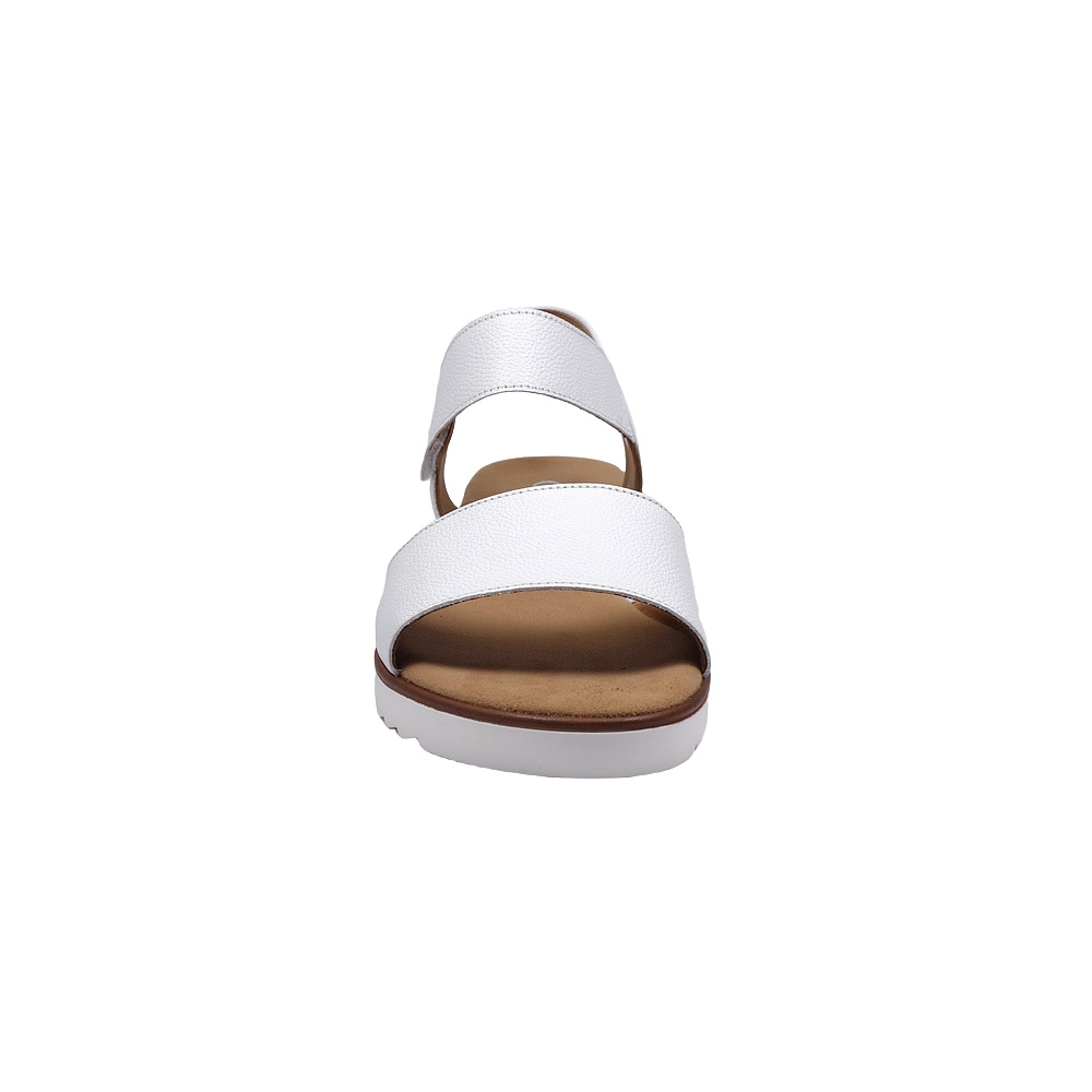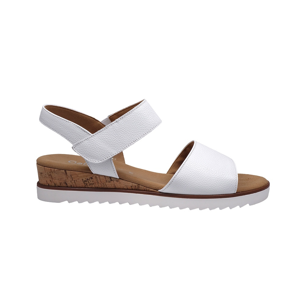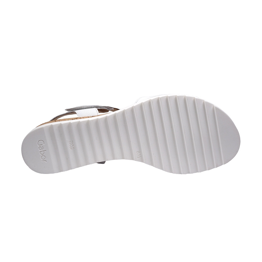 Dámské letní vycházkové sandály značky Gabor. Svršek je z hladké kůže, podšívka a stélka textilní (stélka je vyměkčená pro větší pohodlí), podešev syntetická. Barva je bílá (weiss). Šíře je G. Výška klínku je 25 mm. Pásek přes nárt je upevněn na gumičce pro větší komfort, zapínání je na suchý zip. Obuv je vhodná na nošení do města a v upraveném přírodním prostředí (parky, lesní a polní cesty apod.).