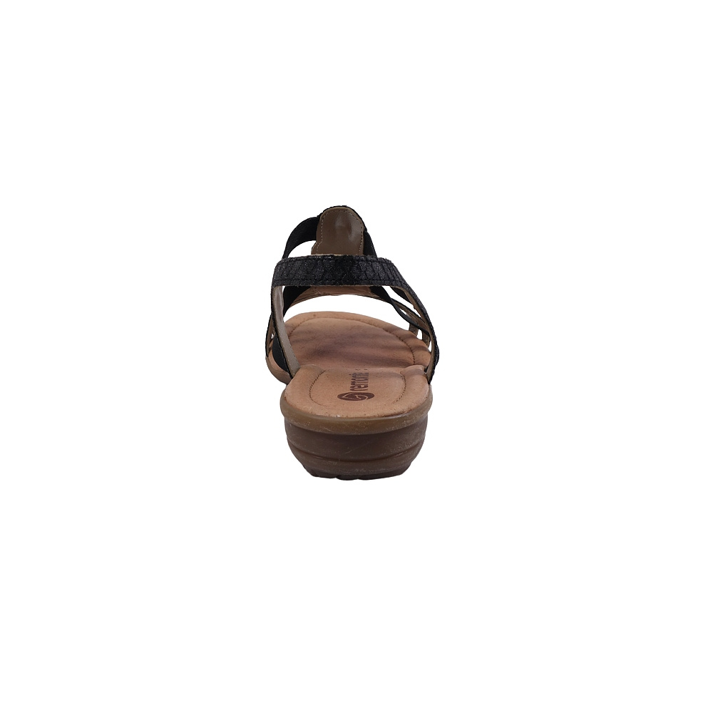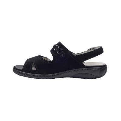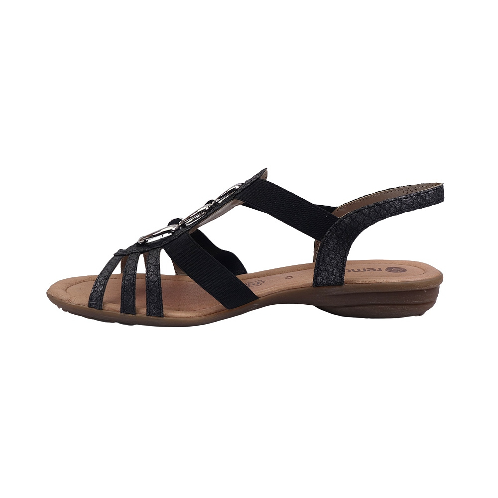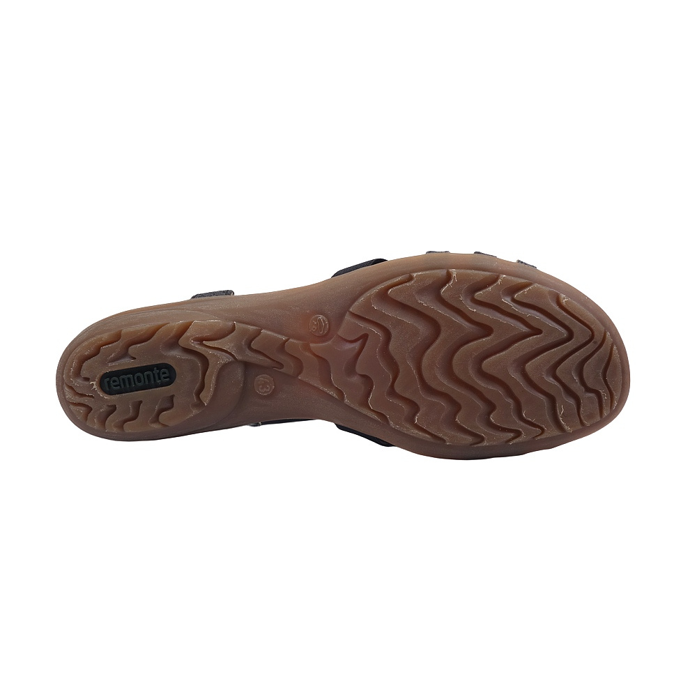 Dámské letní vycházkové sandály značky Remonte. Svršek je ze syntetiky (imitace hadí kůže), podšívka syntetická, stélka kožená (stélka je vyměkčená pro větší komfort), podešev syntetická (non-marking). Barva je tmavě šedo-černá (grau kombi). Výška podpatku je 30 mm. Obuv je na nártu vybavena gumičkami pro snažší obutí a větší komfort. Obuv je vhodná na nošení do města a v upraveném přírodním prostředí (parky, lesní a polní cesty apod.).