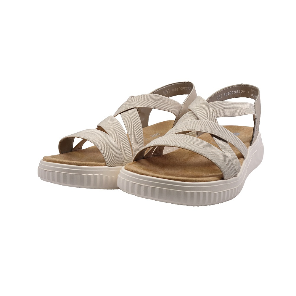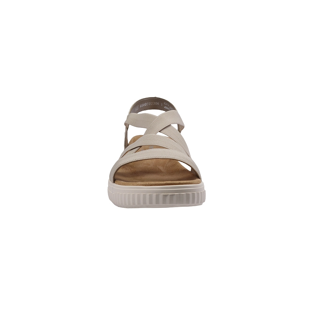 Dámské letní vycházkové sandály značky Remonte. Svršek je ze syntetiky, podšívka syntetická, stélka textilní, podešev syntetická (odlehčená a odpružená - LIGHT SOLE). Barva je béžová (beige). Šíře je H (Extra Wide). Pásky přes nárt jsou pružné (gumičky) pro snažší obutí a větší komfort. Obuv je vhodná na nošení do města a v upraveném přírodním prostředí (parky, lesní a polní cesty apod.).
