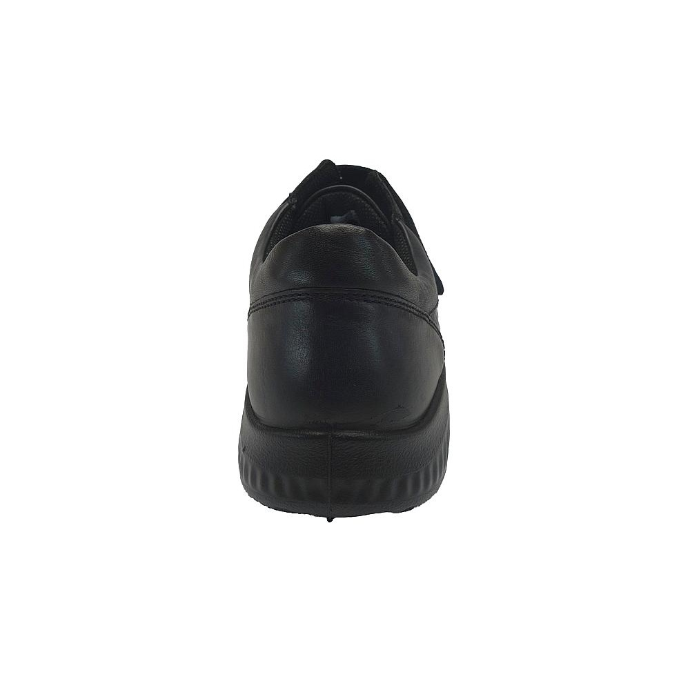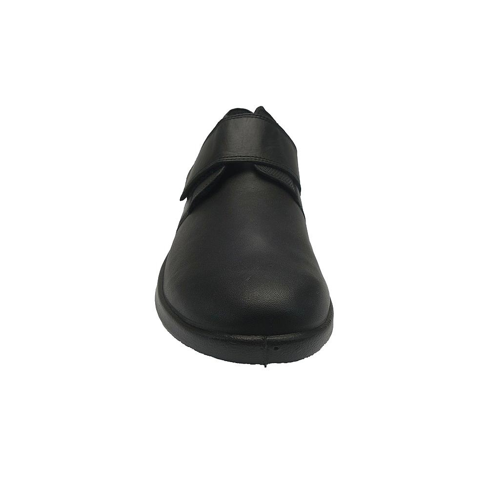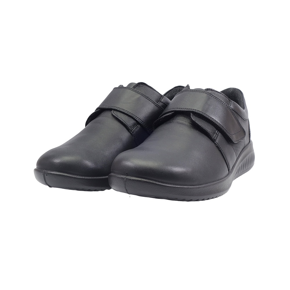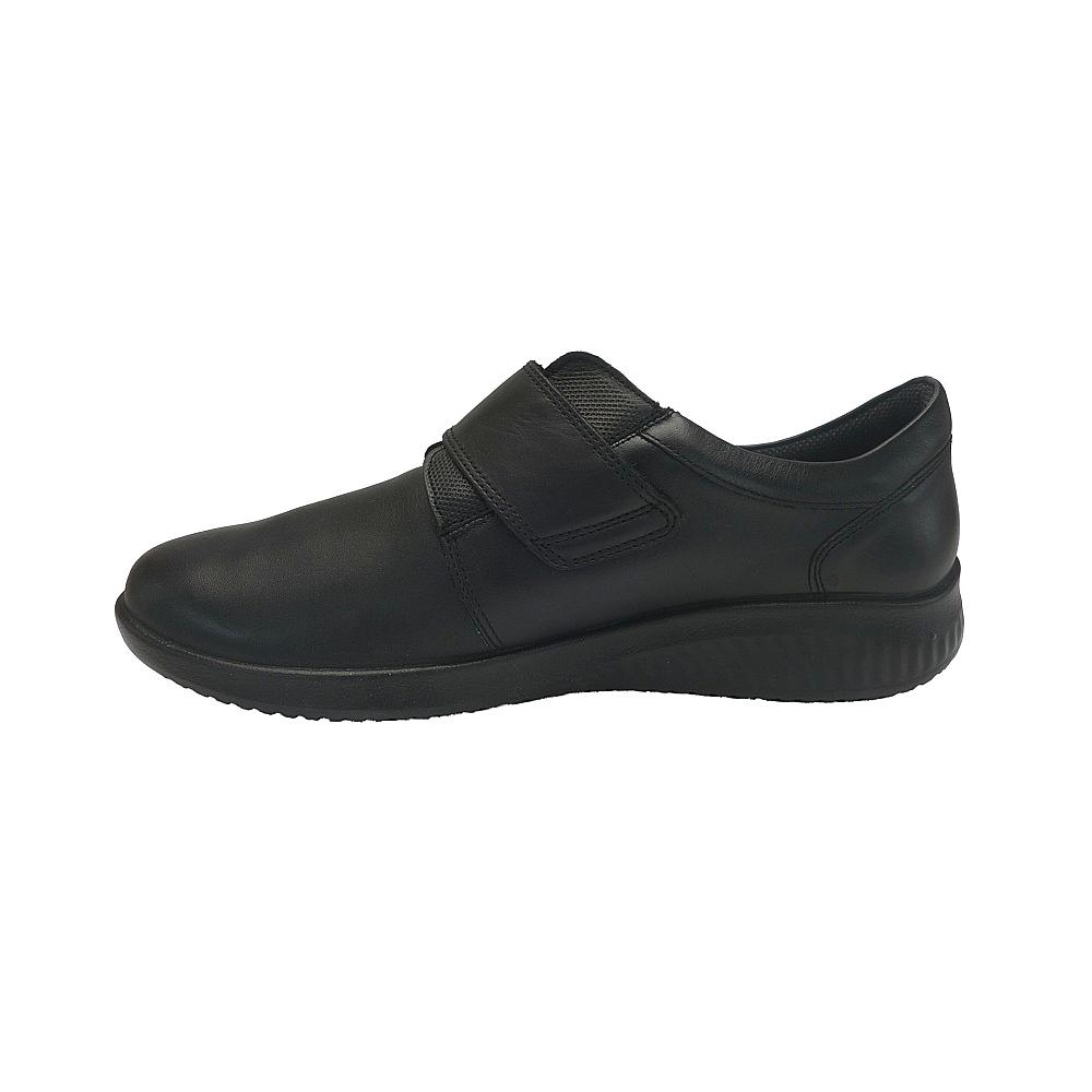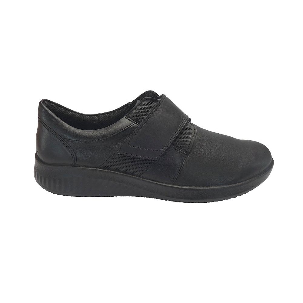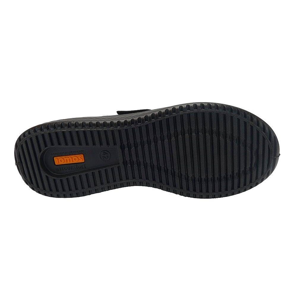 Dámská vycházková obuv značky Jomos. Svršek je z hladké kůže, podšívka a stélka textilní, podešev syntetická (AIRCOMFORT). Stélka je vyjmutelná, vyměkčená a anatomicky tvarovaná. Barva je černá (schwarz). Šíře je K (extra široká). Zapínání pásku přes nárt je na suchý zip. Obuv je vhodná na nošení do města a v upraveném přírodním prostředí (parky, lesní a polní cesty apod).