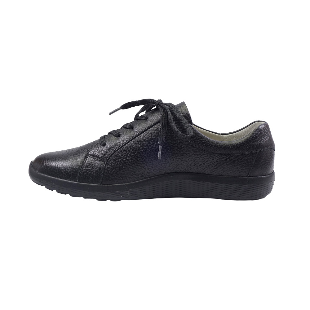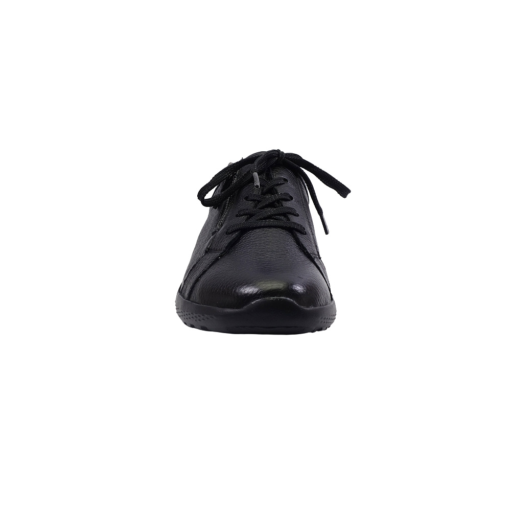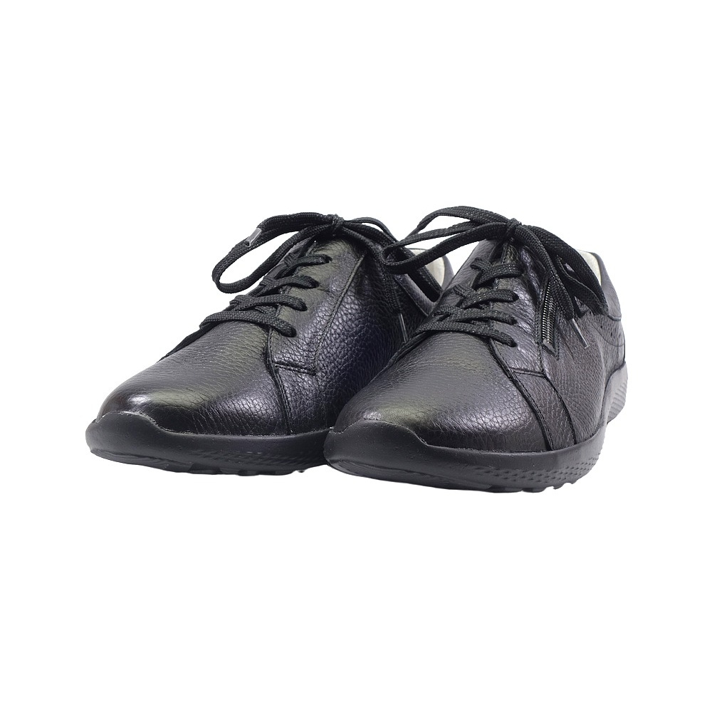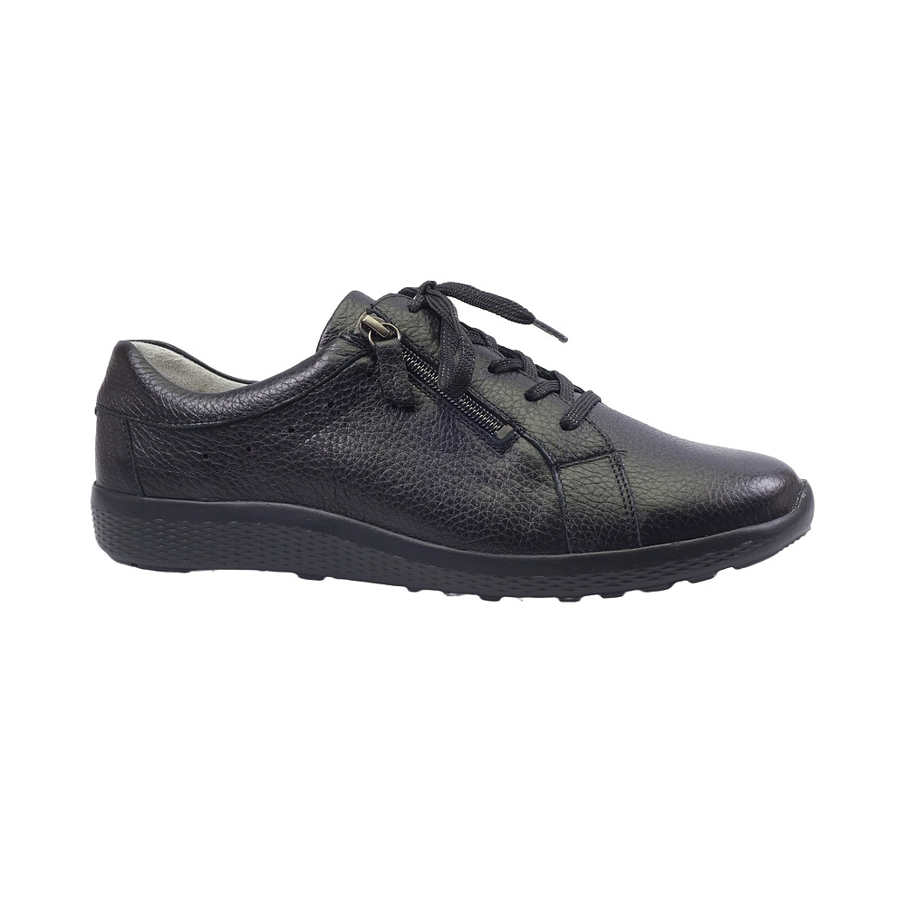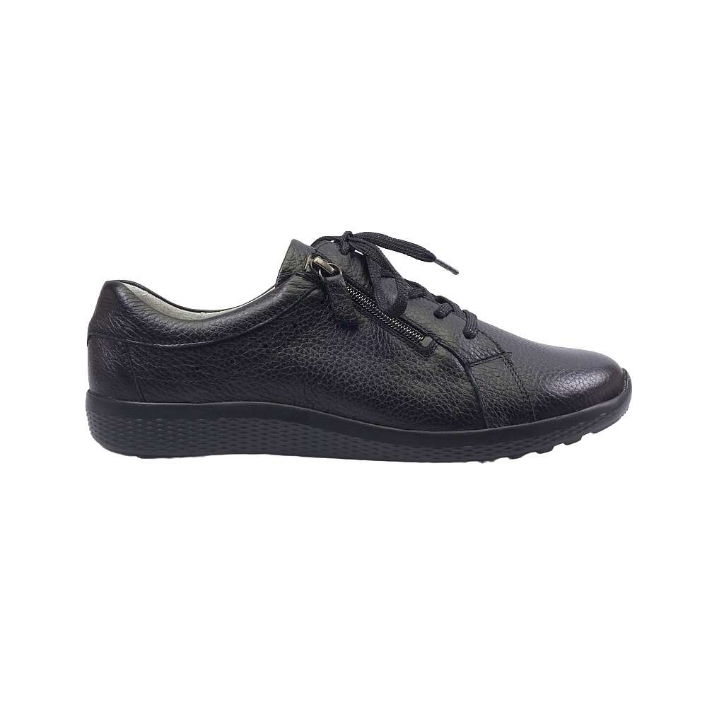 Dámské vycházkové polobotky značky Waldläufer. Svršek je z hladké kůže, podšívka kombinací kůže a textilu, stélka kožená, podešev syntetická (LUFTPOLSTER, recycled). Stélka je vyjmutelná, odpružená a anatomicky tvarovaná. Barva je černá (schwarz). Šíře obuvi je K (extra široká). Obuv je z boku na nártu vybavena funkčním zipem pro snažší a rychlejší obutí. Obuv je vhodná na nošení do města a v upraveném přírodním prostředí (parky, lesní a polní cesty apod.).