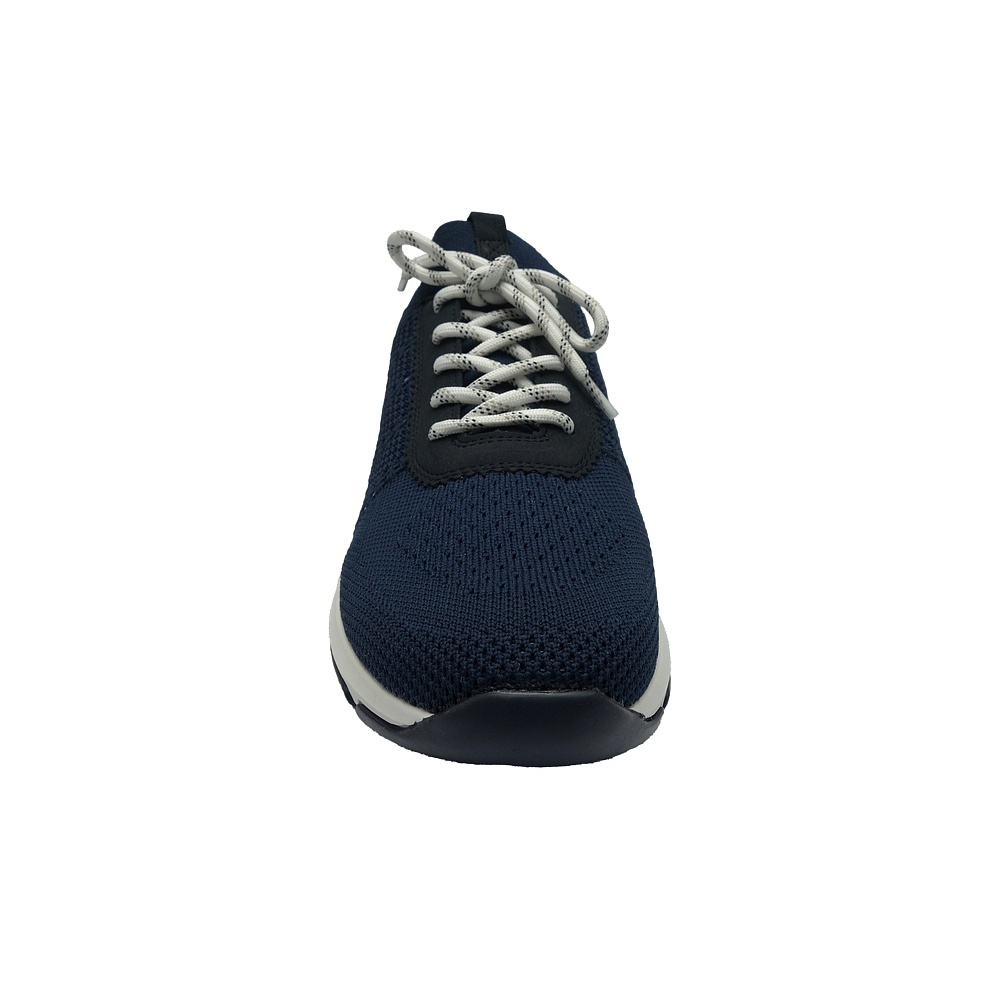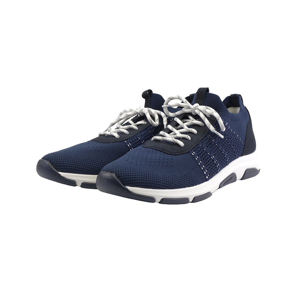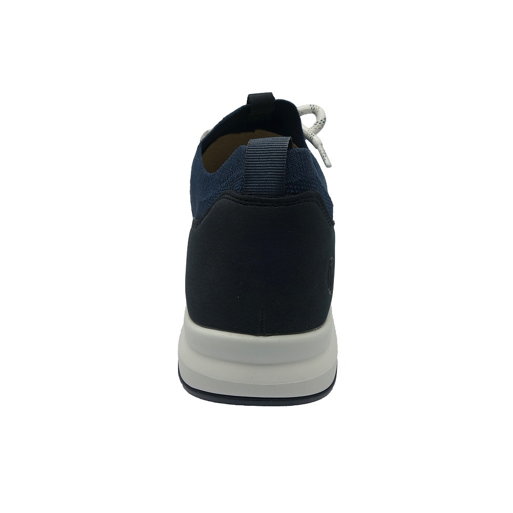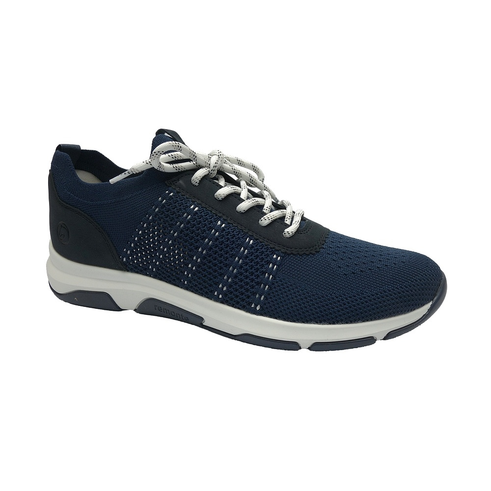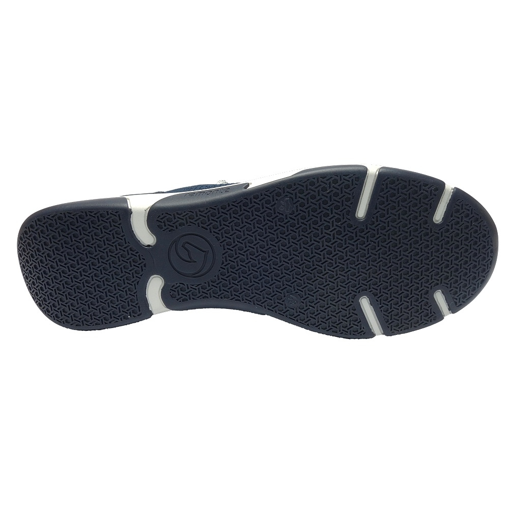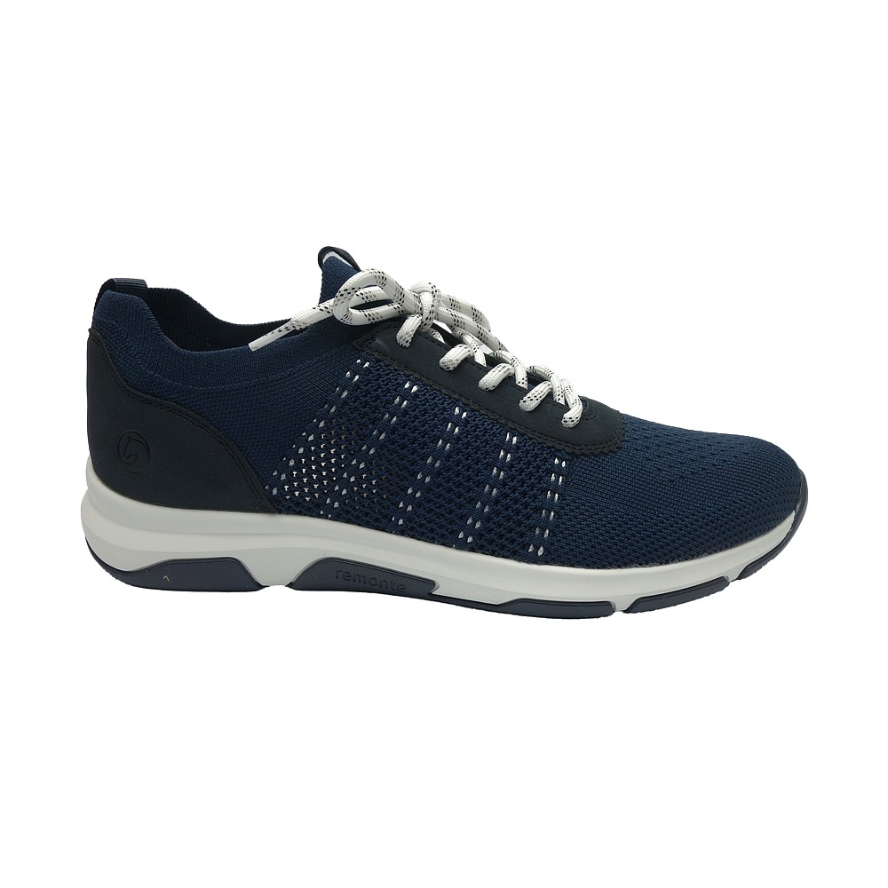 Dámské letní vycházkové tenisky značky Remonte. Svršek je kombinací textilu (pružný úplet) a syntetiky (vzhledově podobná boušené kůži - nubuku), podšívka a stélka textilní, podešev syntetická. Stélka je vyjmutelná a vyměkčená (REMONTE SOFT). Barva je tmavě modrá (blau). Boční části svršku obuvi jsou ze síťoviny pro lepší klima uvnitř obuvi. Obuv je vhodná na nošení do města a v upraveném přírodním prostředí (parky, lesní a polní cesty apod.).