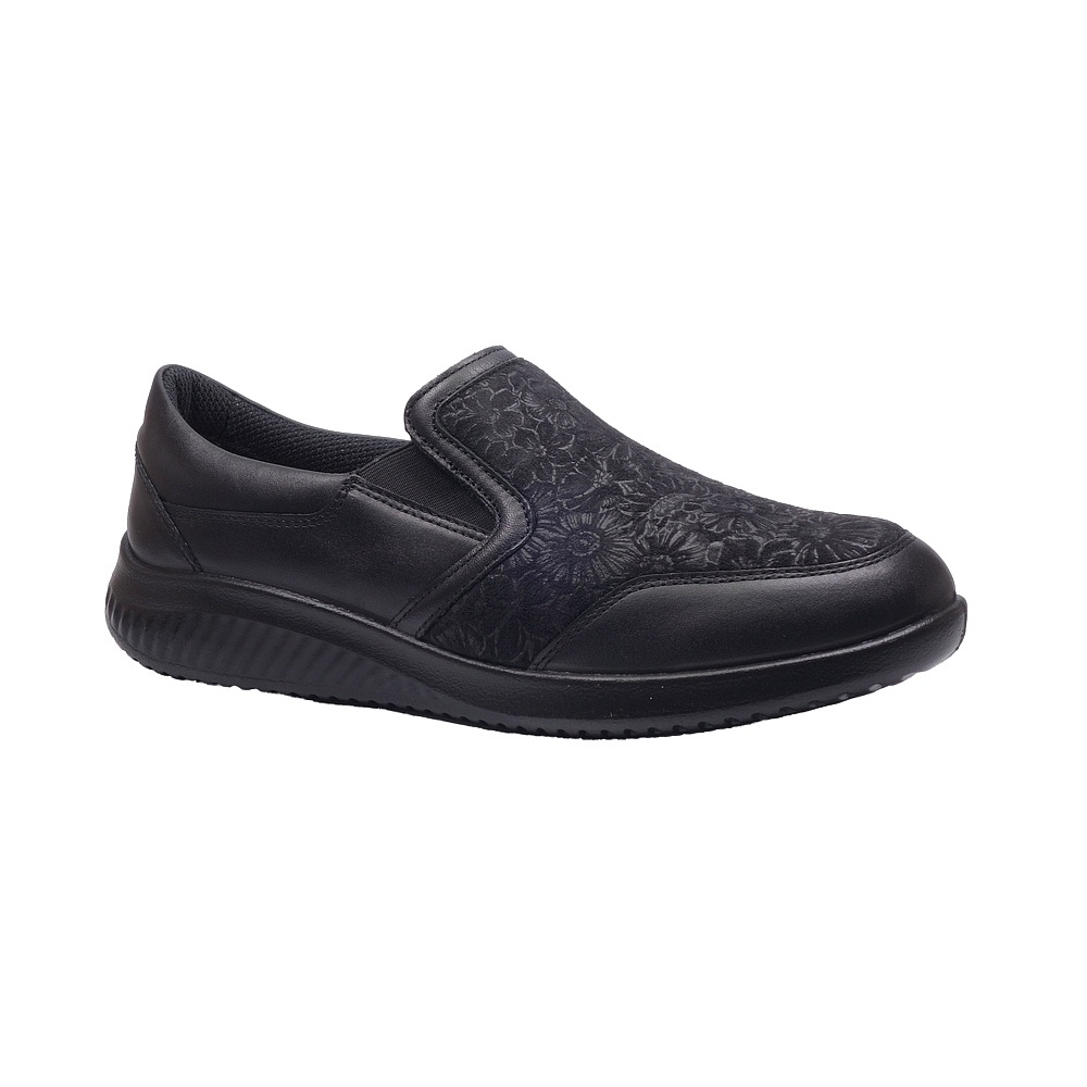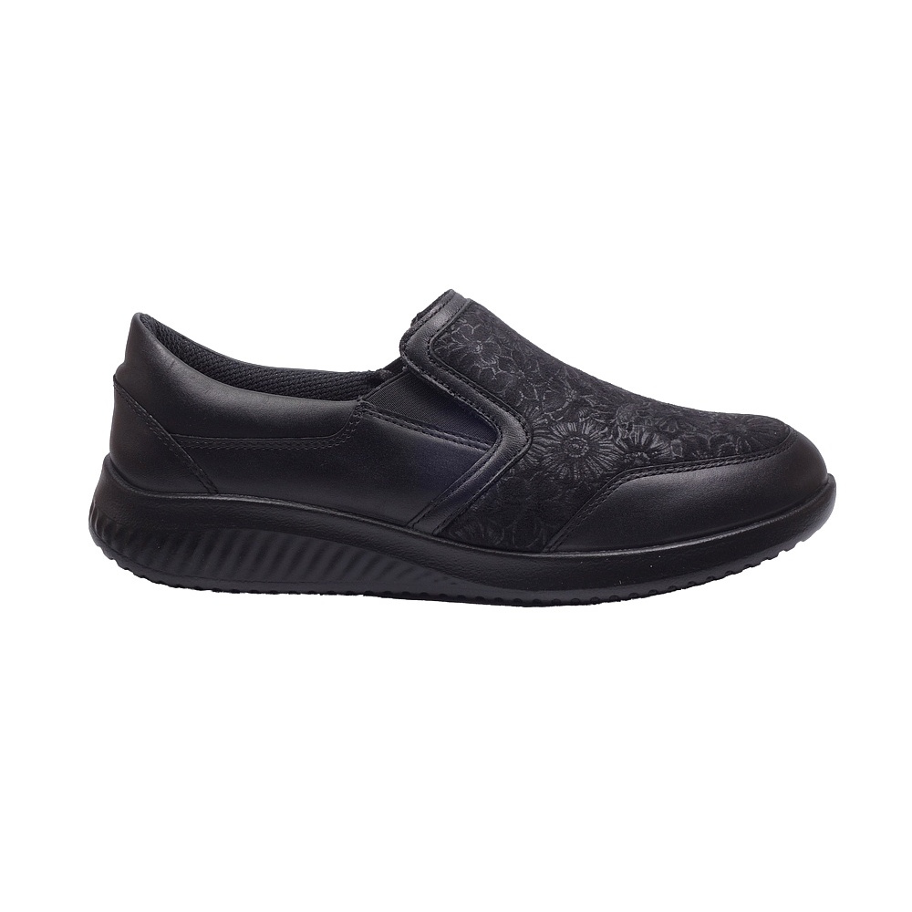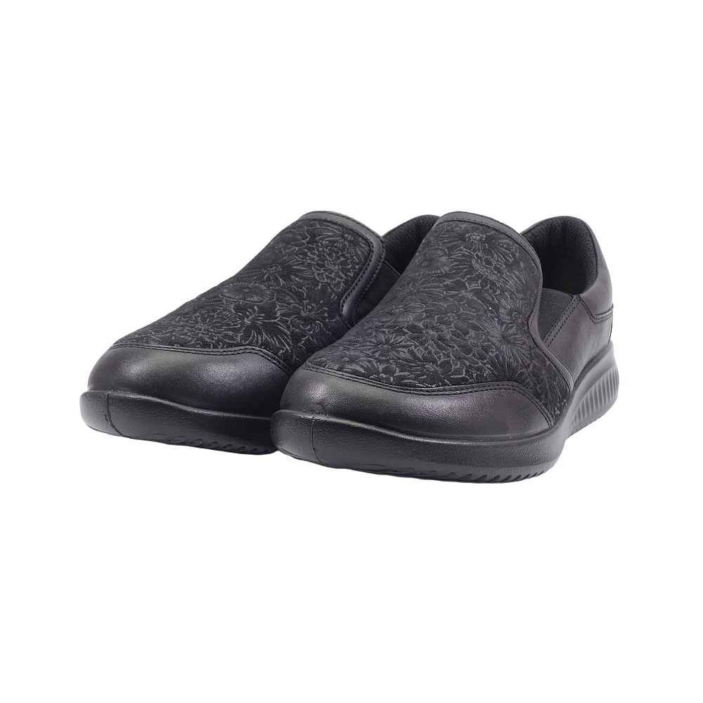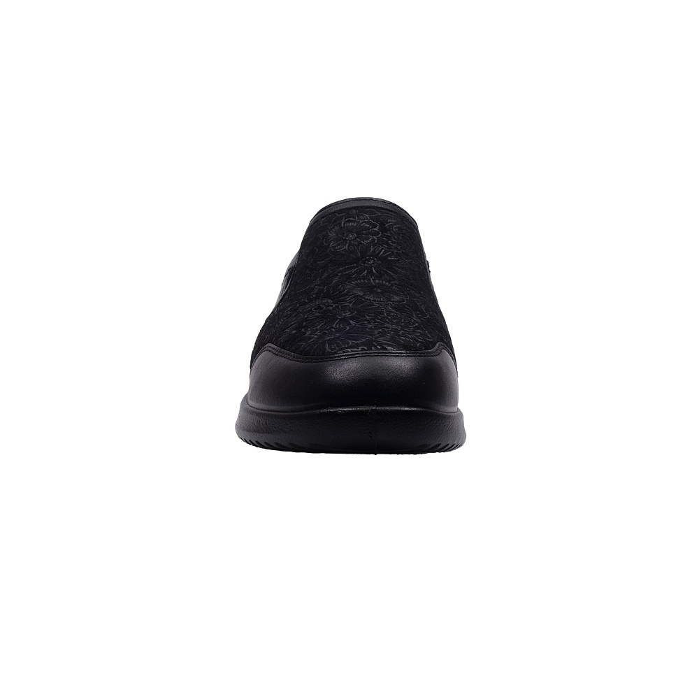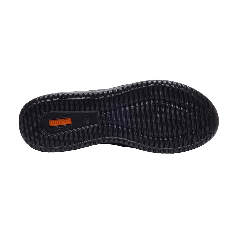 Dámské vycházkové mokasíny značky Jomos. Svršek je kombinací hladké kůže a textilu (stretch), podšívka a stélka textilní, podešev syntetická (AIRCOMFORT). Stélka je vyjmutelná, vyměkčená a anatomicky tvarovaná. Barva je černá (schwarz). Šíře je K (extra široká). Obuv je na nártu vybavena gumičkami pro snažší obutí a větší komfort. Obuv je vhodná na nošení do města a v upraveném přírodním prostředí (parky, lesní a polní cesty apod).