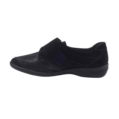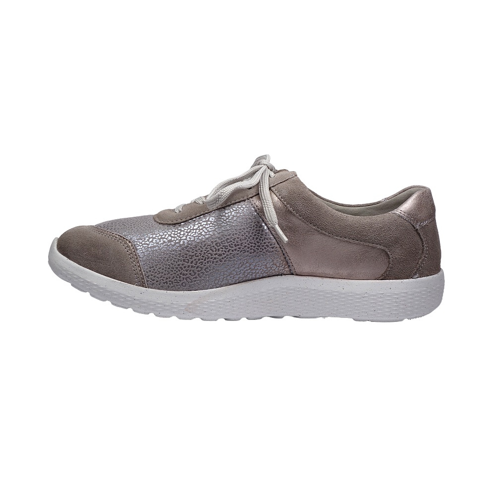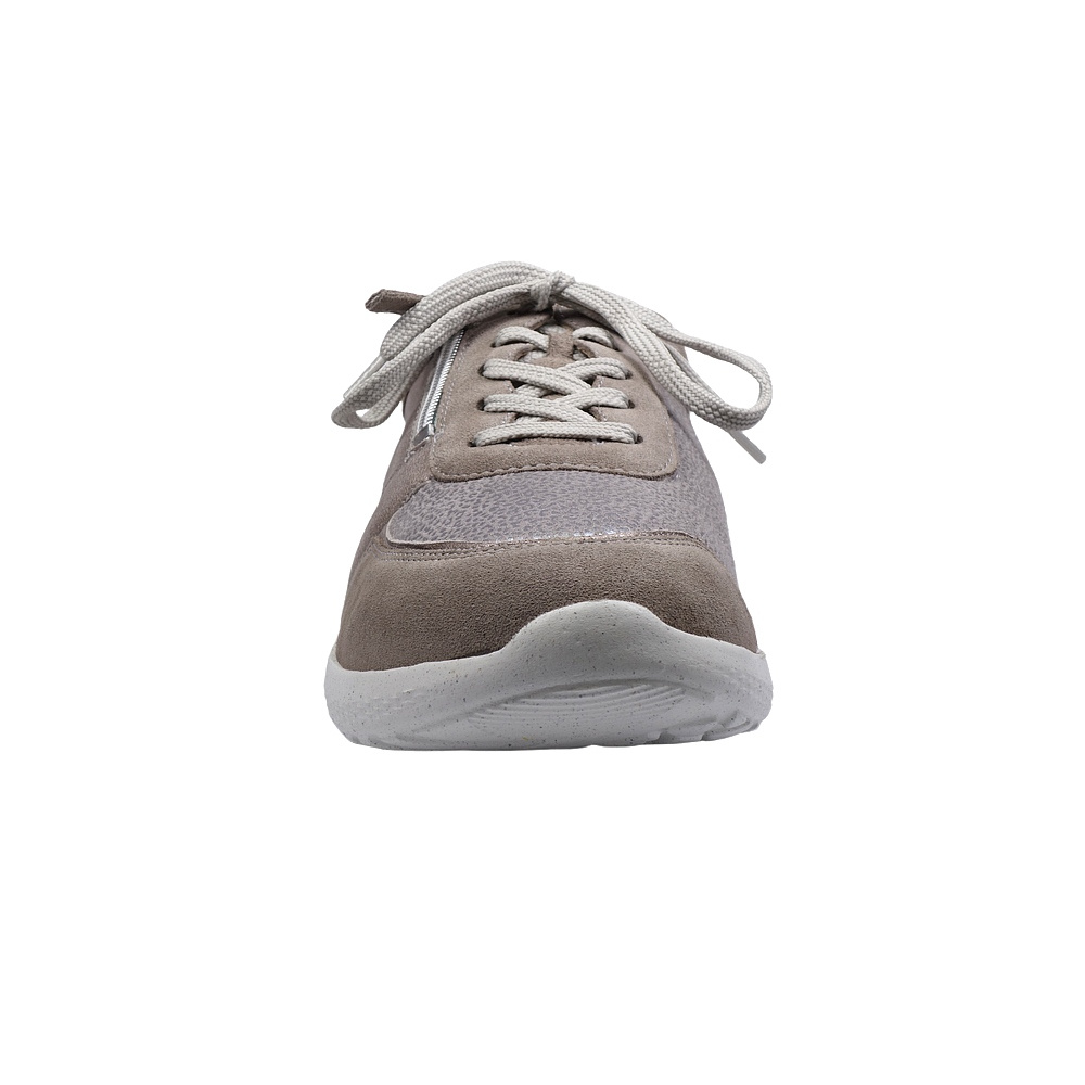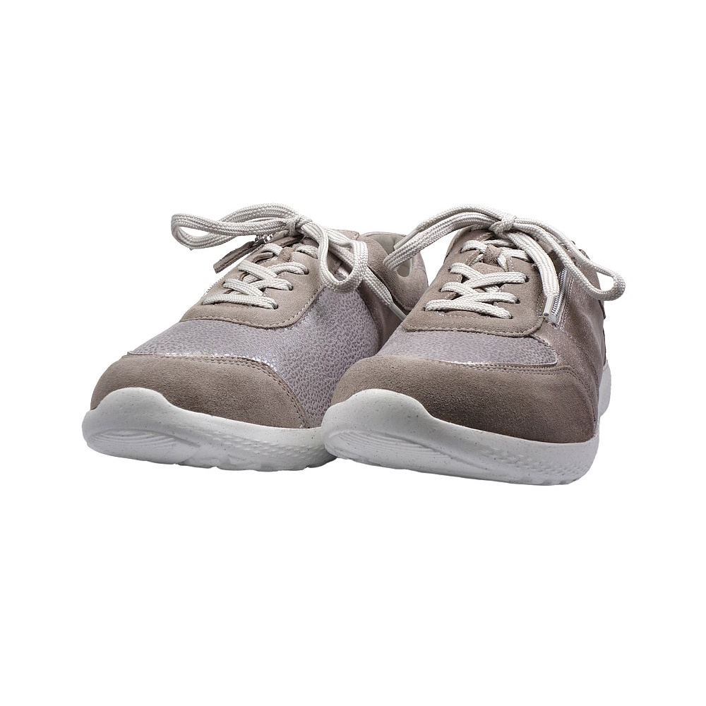 Dámské vycházkové polobotky značky Waldläufer. Svršek je kombinací broušené kůže (velur), kůže s metalickým (kovovým) efektem a pružného textilu (stretch), podšívka a stélka textilní, podešev syntetická. Stélka je vyjmutelná, odpružená a anatomicky tvarovaná. Barva je šedo-béžová (grey stein). Šíře obuvi je M (extra široká). Obuv je z boční strany nártu vybavena funkčním zipem pro snažší a rychlejší obutí. Obuv je vhodná na nošení do města a v upraveném přírodním prostředí (parky, lesní a polní cesty apod.).
