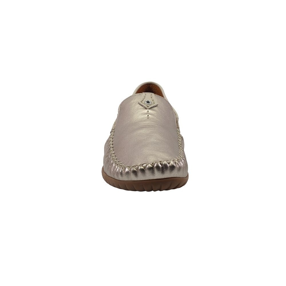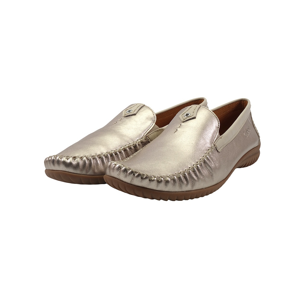 Dámské vycházkové mokasíny značky Gabor. Svršek je kombinací kůže s metalickým (kovovým) efektem a hladké kůže, podšívka textilní, stélka kožená, podešev syntetická (LATEX, non-marking). Barva je puder/muschel (světle béžová/zlato-platinová). Šíře je G. Obuv je vhodná na nošení do města.
