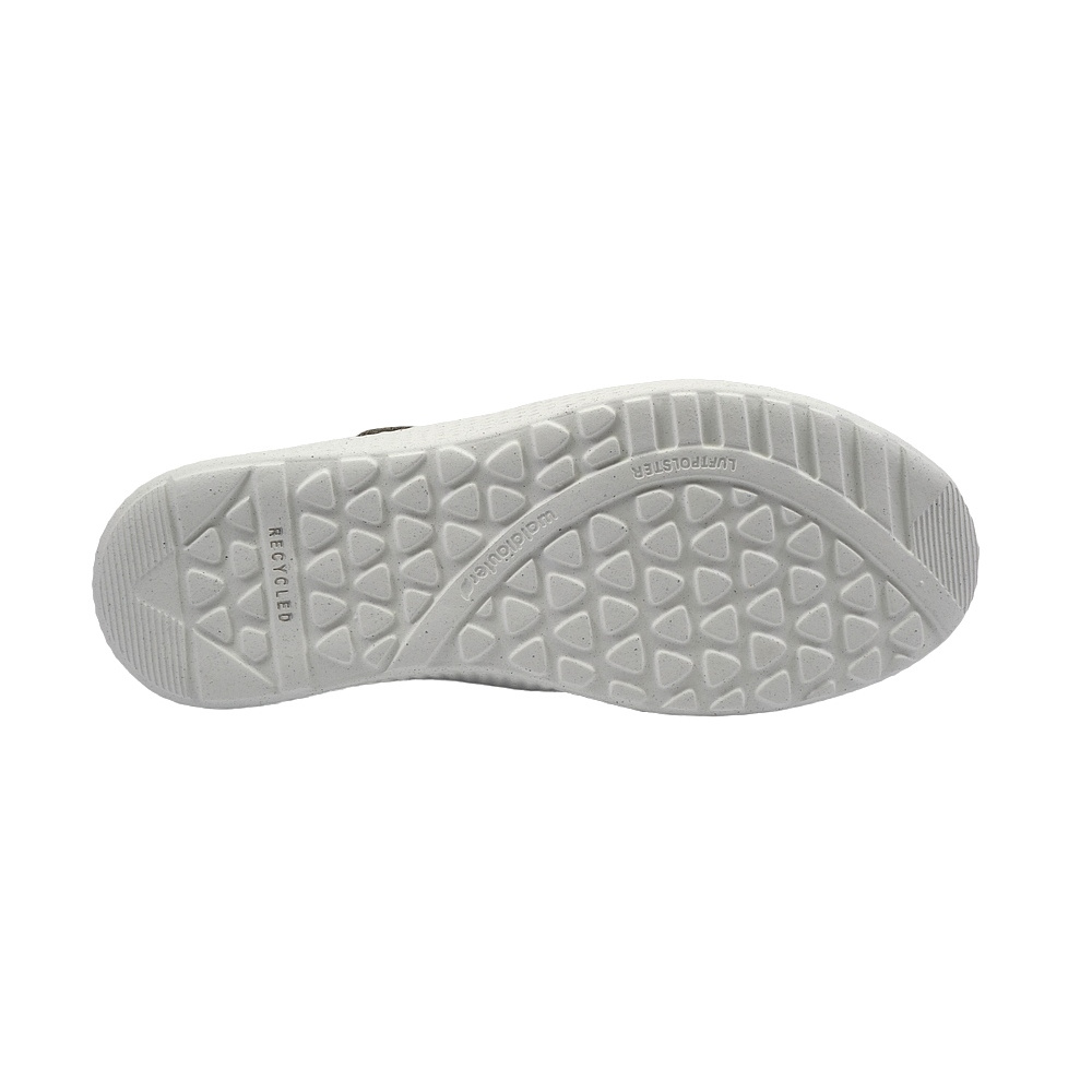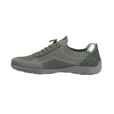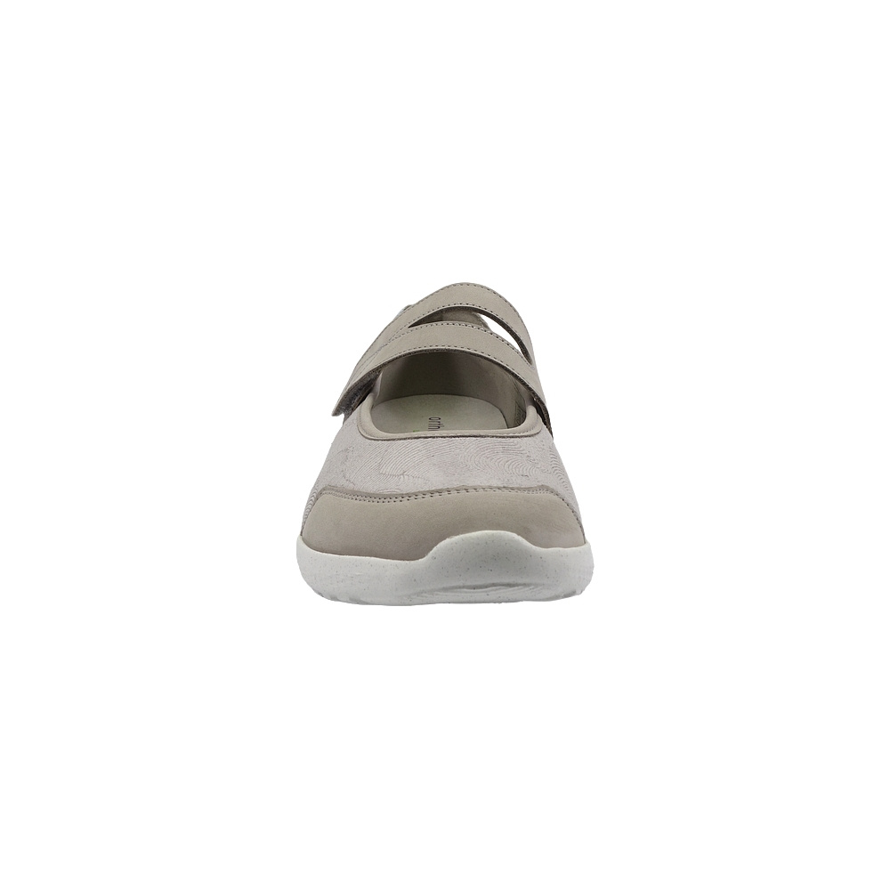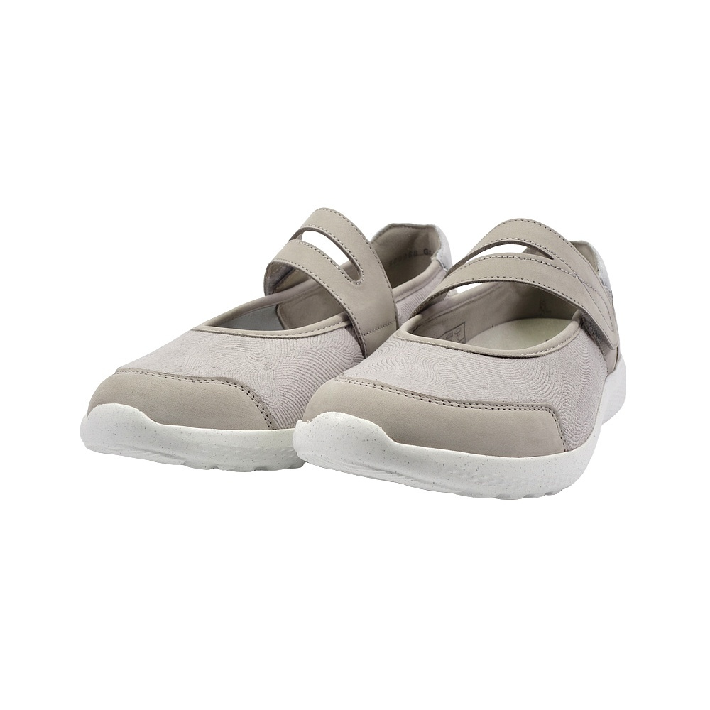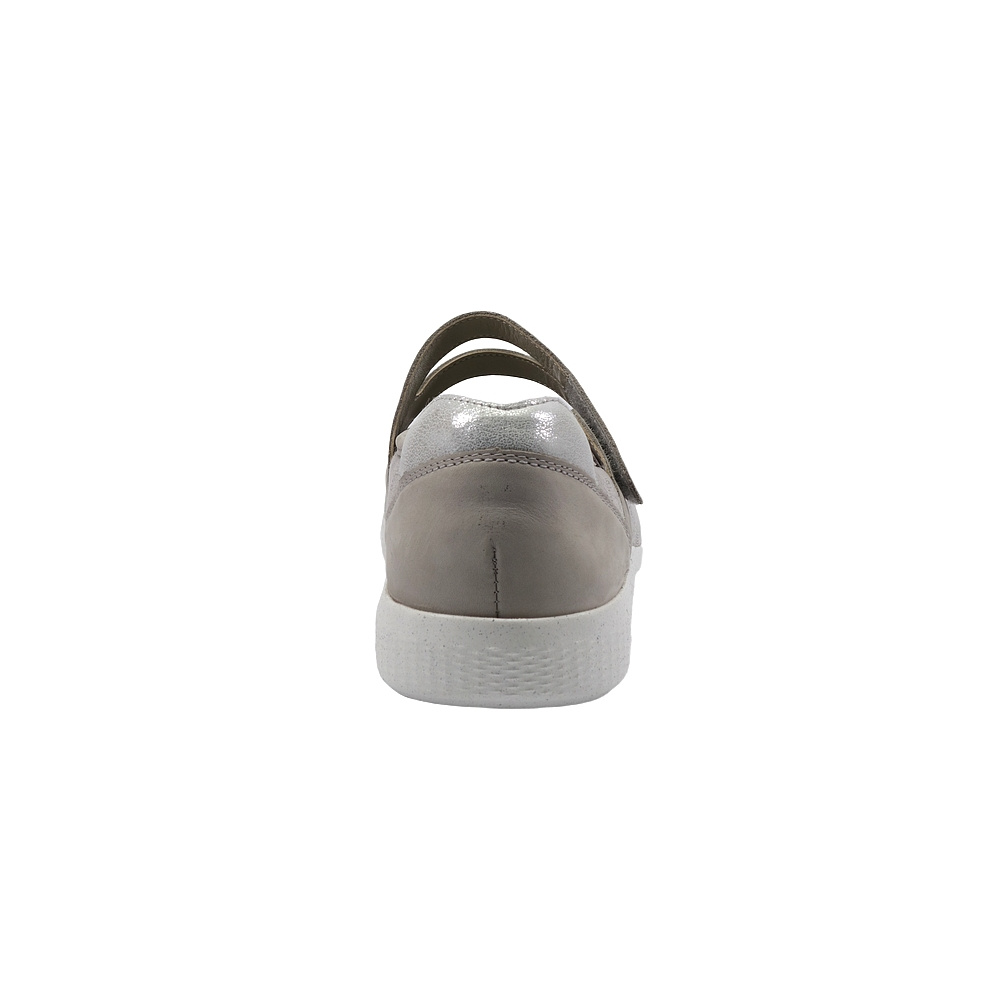 Dámská vycházková obuv značky Waldläufer. Svršek je kombinací broušené kůže (nubuk), broušené kůže se stříbrným potiskem a pružného textilu (stretch), podšívka a stélka textilní, podešev syntetická (LUFTPOLSTER, recycled). Stélka je vyjmutelná, vyměkčená a anatomicky tvarovaná (OrthoTritt). Barva je šedobéžovo-stříbrná (stein/silber). Šíře obuvi je K (extra široká). Zapínání pásku na nártu je na suchý zip. Obuv je vhodná na nošení do města a v upraveném přírodním prostředí (parky, lesní a polní cesty apod.).