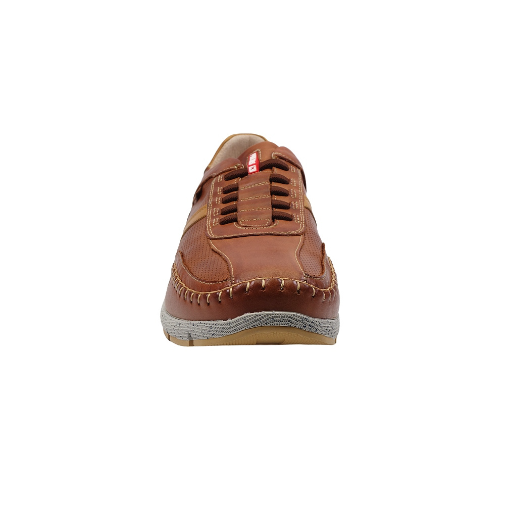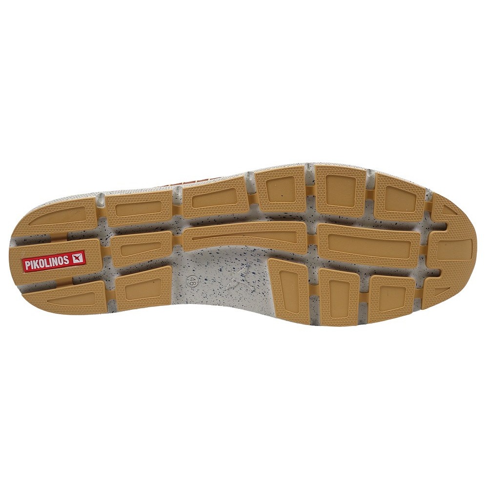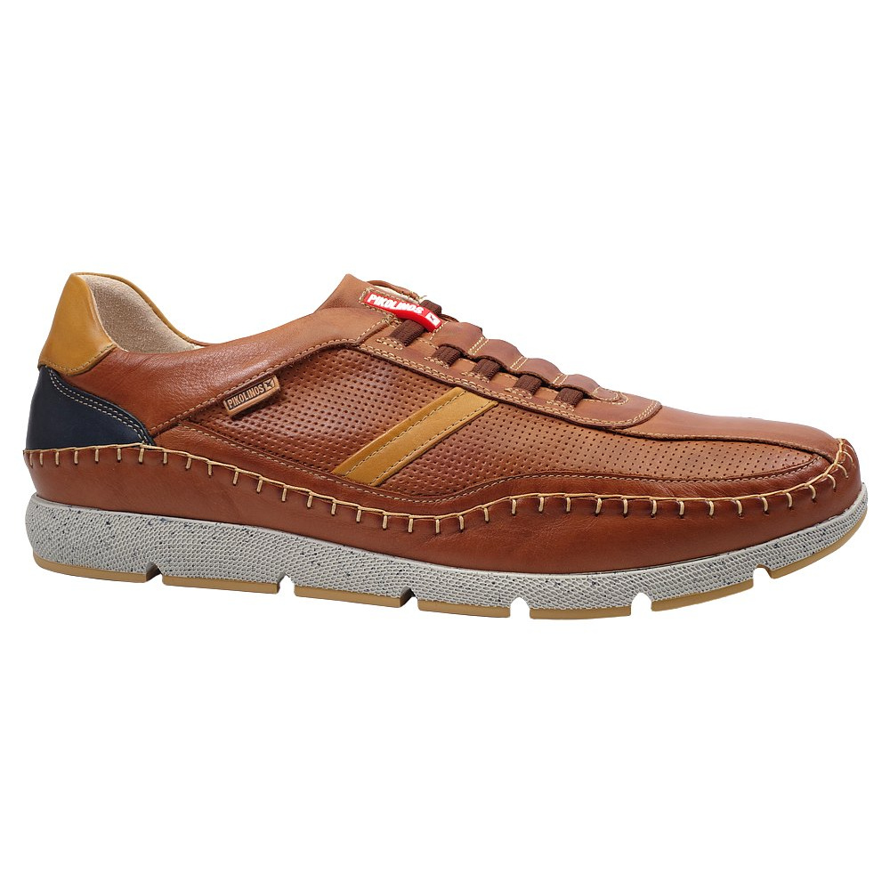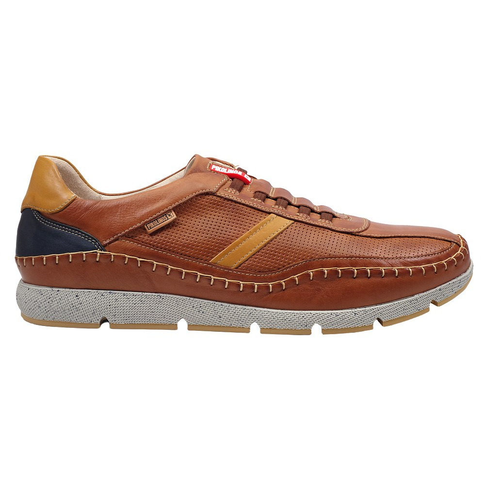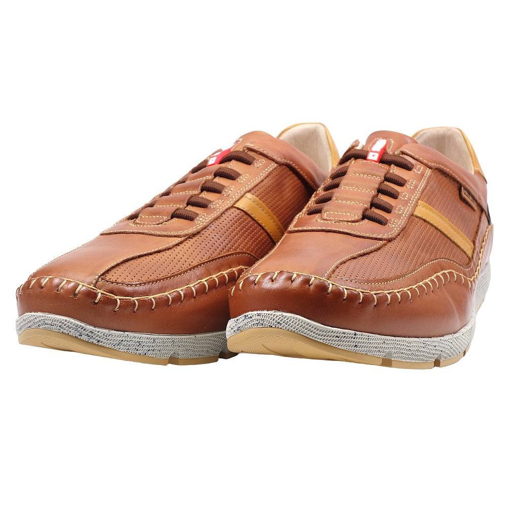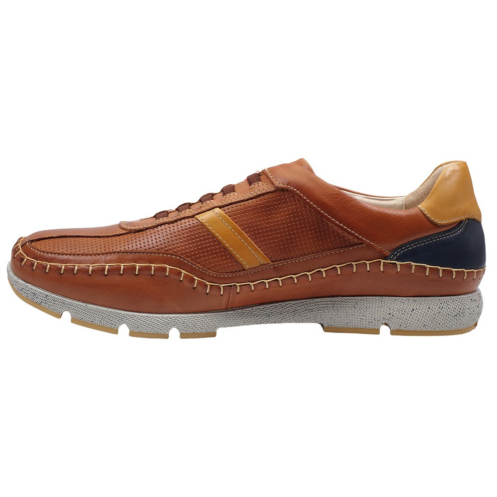 Pánská vycházková obuv značky Pikolinos. Svršek je z hladké kůže, podšívka kombinací kůže a textilu, stélka textilní, podešev syntetická. Stélka je vyjmutelná, vyměkčená a anatomicky tvarovaná. Barva je přírodní/modrá/žlutá (brandy). Obuv má na nártu místo klasických šněrovadel pružné gumičky pro snažší a rychlejší obutí (obuv se obouvá stejně jako mokasíny). Obuv je vhodná na nošení do města a v upraveném přírodním prostředí (parky, lesní a polní cesty apod.).