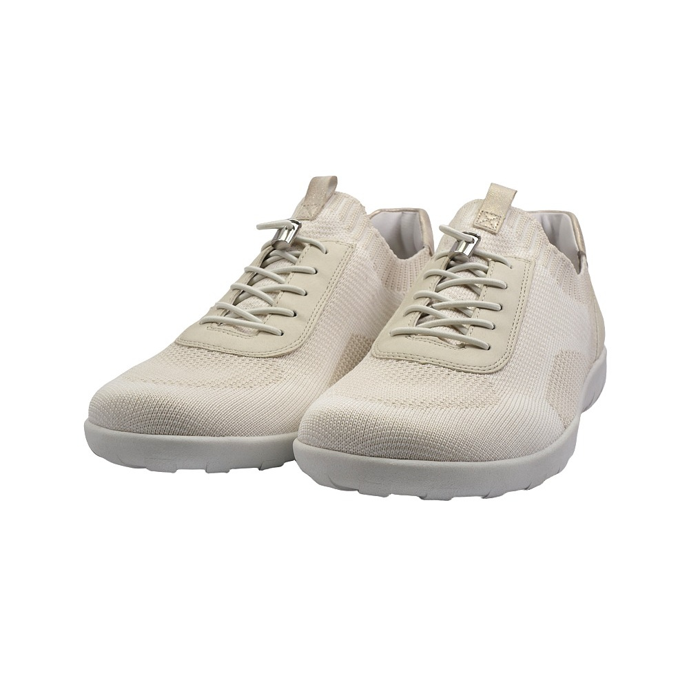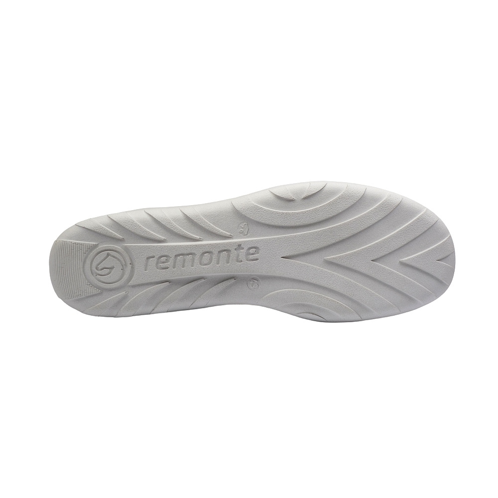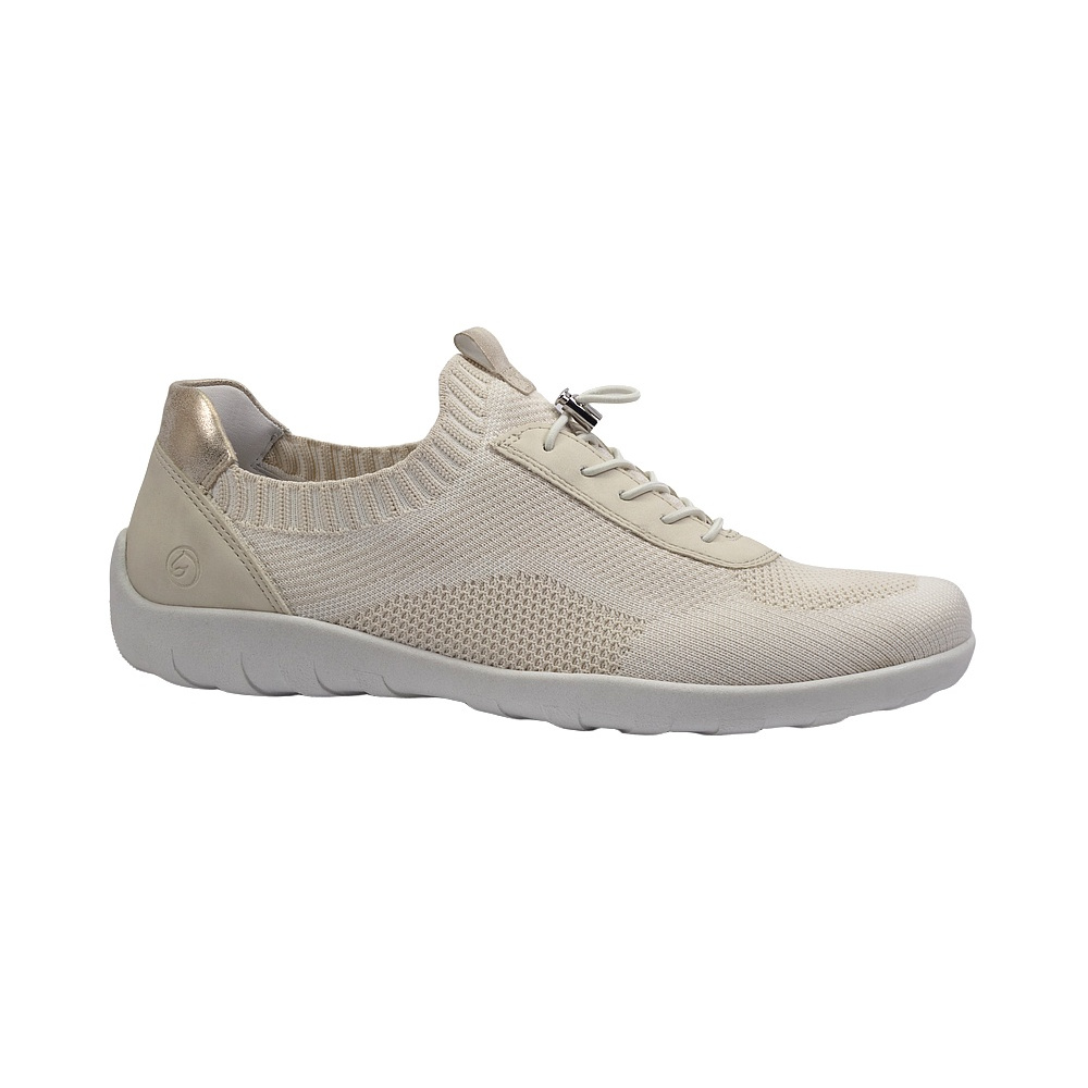 Dámská vycházková obuv značky Remonte. Svršek je kombinací pružného textilu (stretch) a syntetiky, podšívka kombinací kůže a textilu, stélka textilní, podešev syntetická. Stélka je vyjmutelná a vyměkčená (REMONTE SOFT). Barva je béžová (beige). Obuv je místo šněrovadel vybavena gumičkami s rychlozapínacím systémem pro rychlejší obutí a větší komfort. Podšívka v patní části v místě Achillovy paty je vypolstrovaná pro větší pohodlí. Obuv je vhodná na nošení do města a v upraveném přírodním prostředí (parky, lesní a polní cesty apod.).