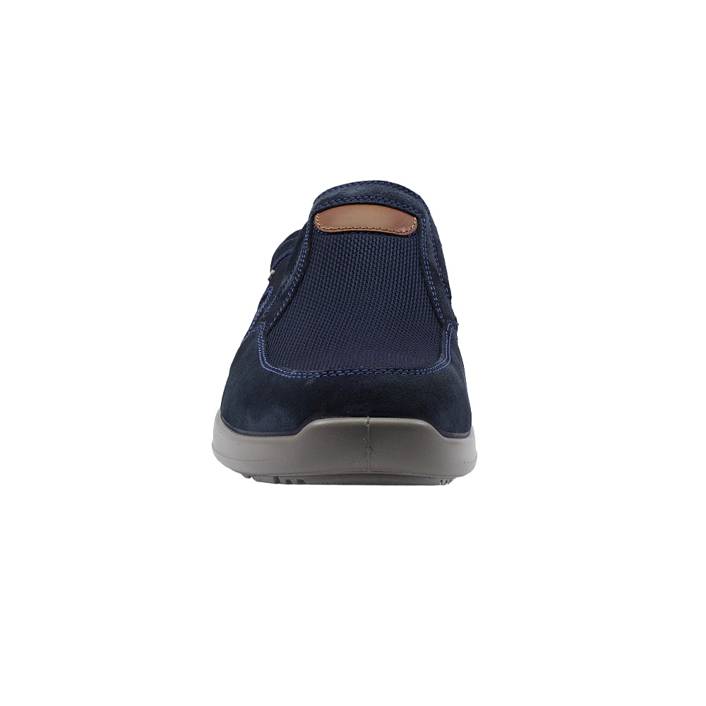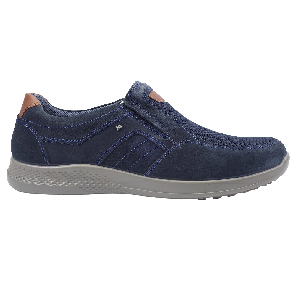 Pánské vycházkové mokasíny značky Jomos. Svršek je kombinací broušené kůže (velur), tukové kůže a textilu, podšívka a stélka textilní, podešev syntetická (AIRCOMFORT). Stélka je vyjmutelná, vyměkčená a anatomicky tvarovaná. Barva je tmavě modrá/přírodní (nachtblau/dunkelblau/tuareg). Šíře je K (extra široká). Obuv je na nártu vybavena gumičkami pro snažší obutí a větší komfort. Obuv je vhodná na nošení do města a v upraveném přírodním prostředí (parky, lesní a polní cesty apod.).