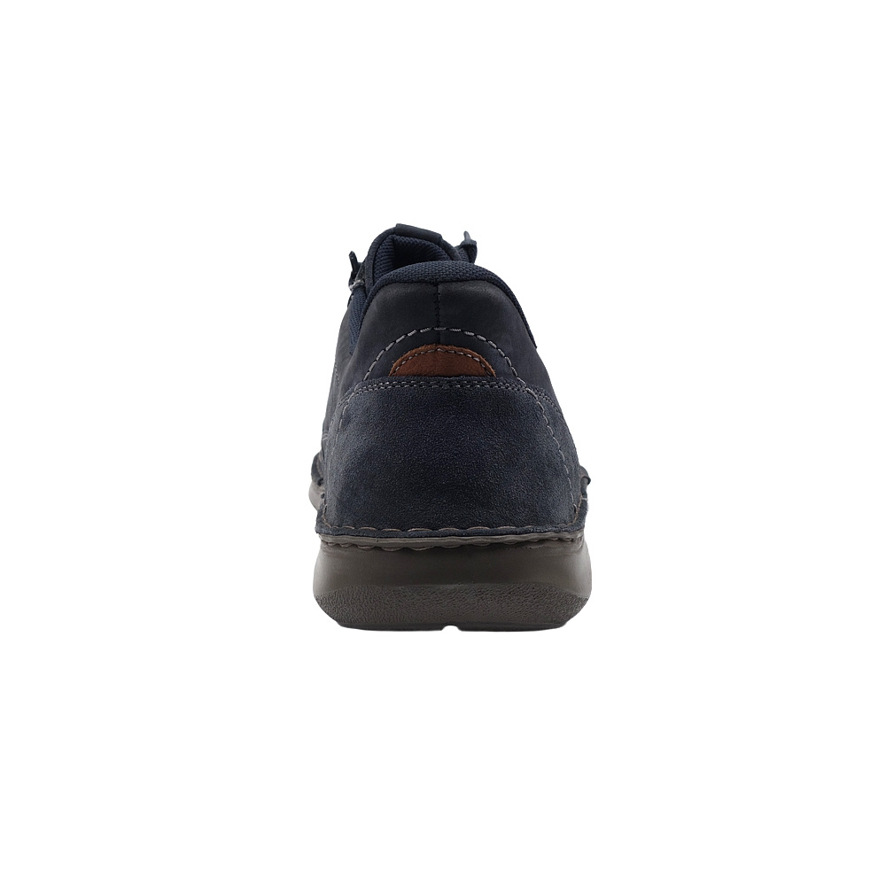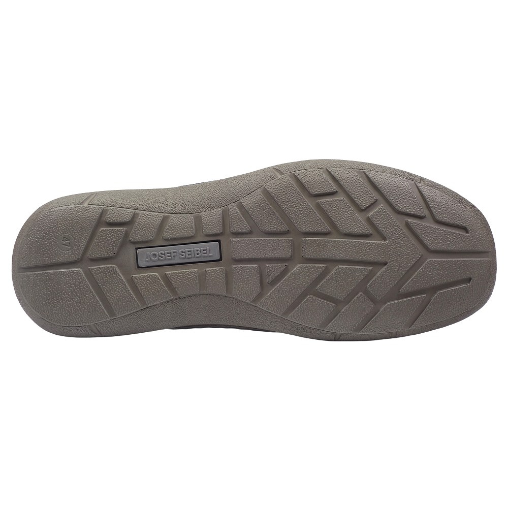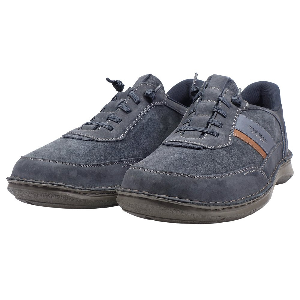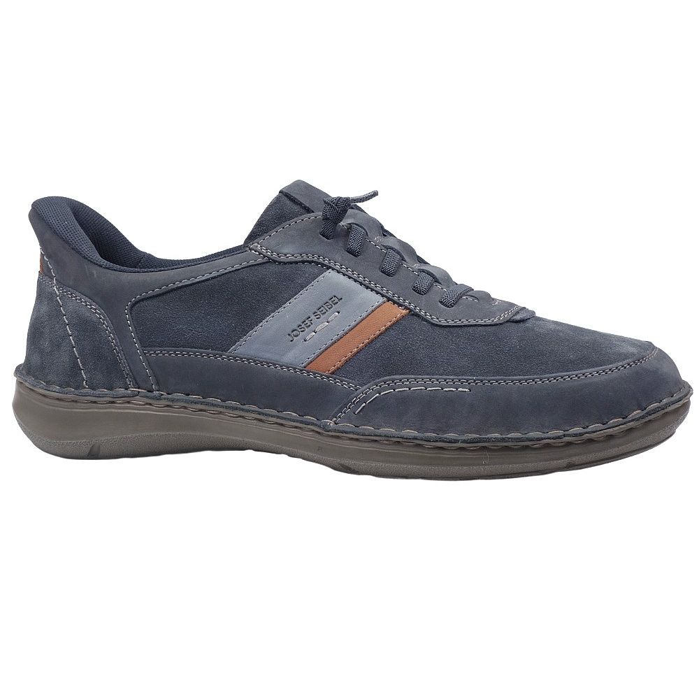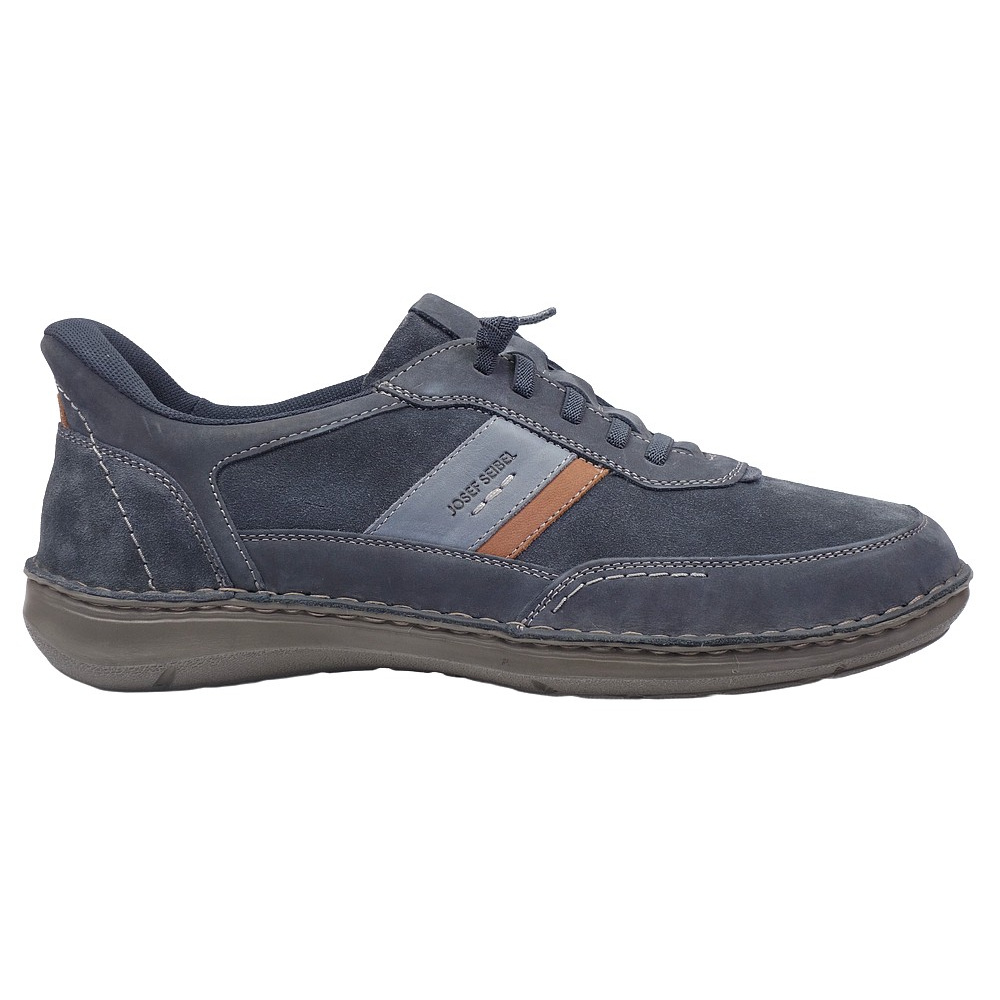 Pánská vycházková obuv značky Josef Seibel. Svršek je z broušené kůže (nubuk + velur), podšívka a stélka textilní, podešev syntetická. Stélka je vyjmutelná, odpružená a anatomicky tvarovaná. Barva je tmavě modrá (indigo-kombi). Šíře je K (Extra Wide). Obuv je flexiblová (svršek a podešev jsou spojeny šitím). Šněrování na nártu je pružné, obuv se nešněruje, ale obouvá se jako mokasíny. Obuv je vhodná na nošení do města a v upraveném přírodním prostředí (parky, lesní a polní cesty apod.).